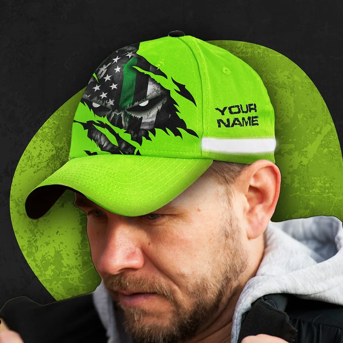 3D Printed Classic Cap Green Skull US Flag Custom Name Safety Workwear For Workers, Runners, Cyclists, Patriotic