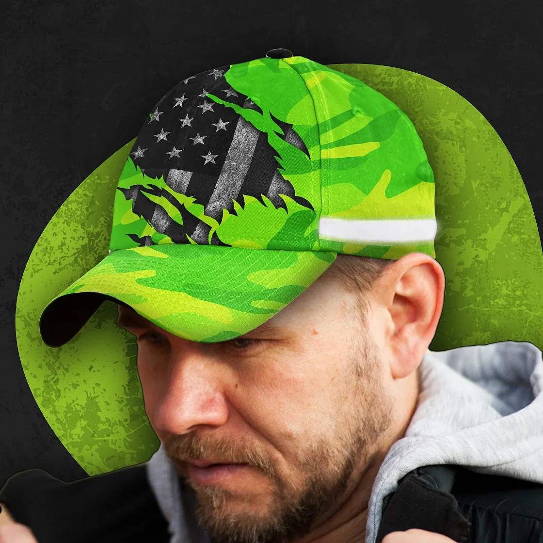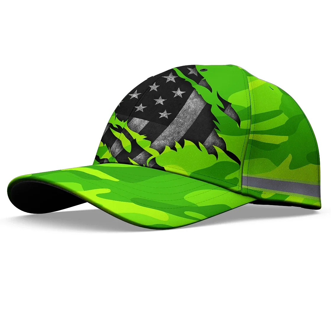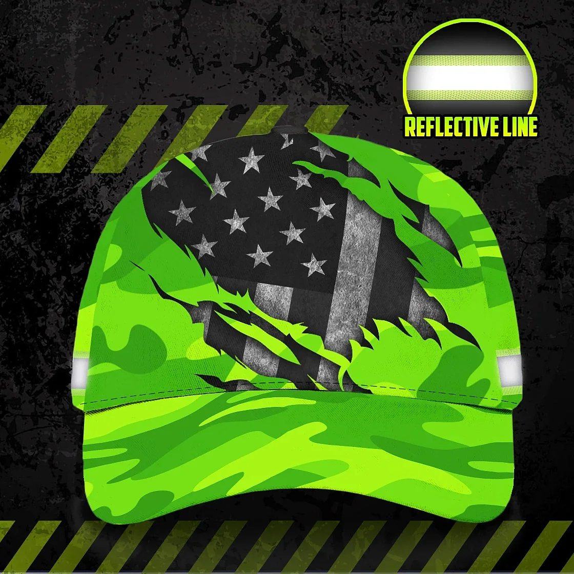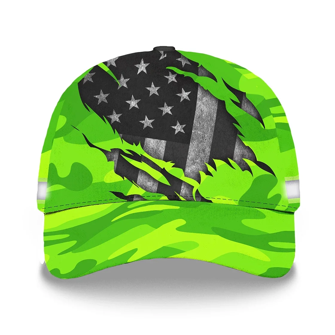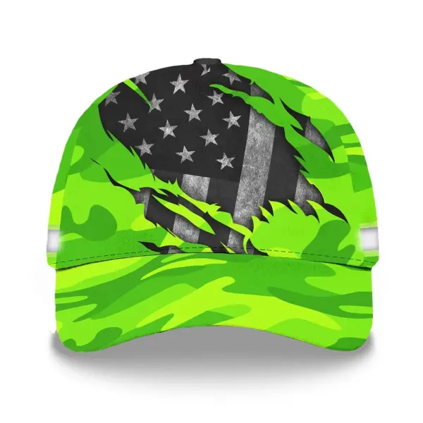 3D Printed Classic Cap Reflective Scratch Camo Green Neon US Flag Safety Workwear For Workers, Runners, Cyclists, Patriotic