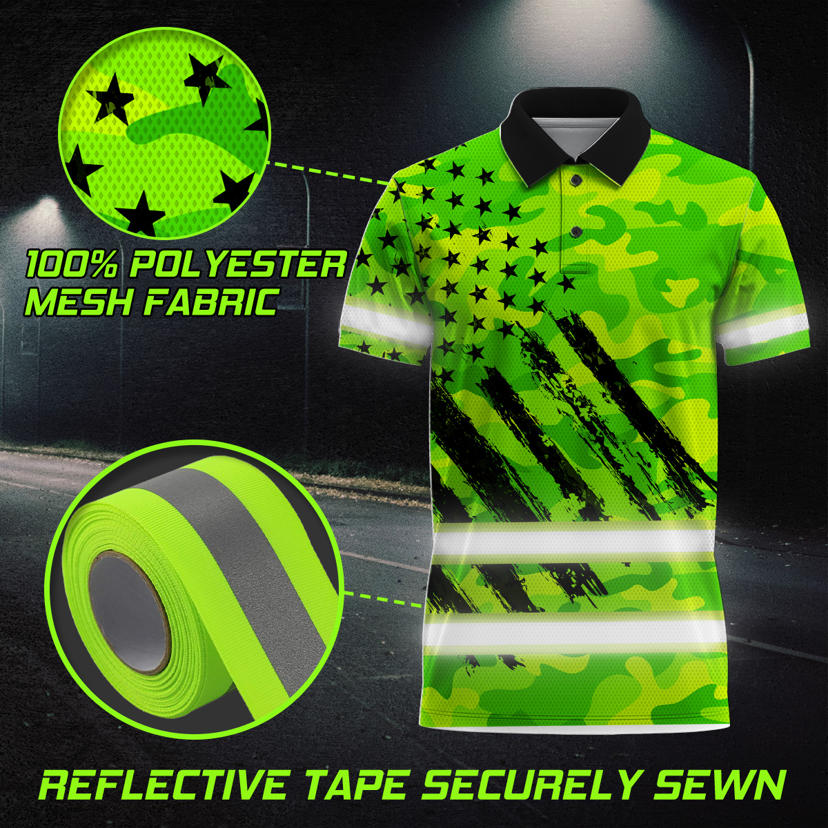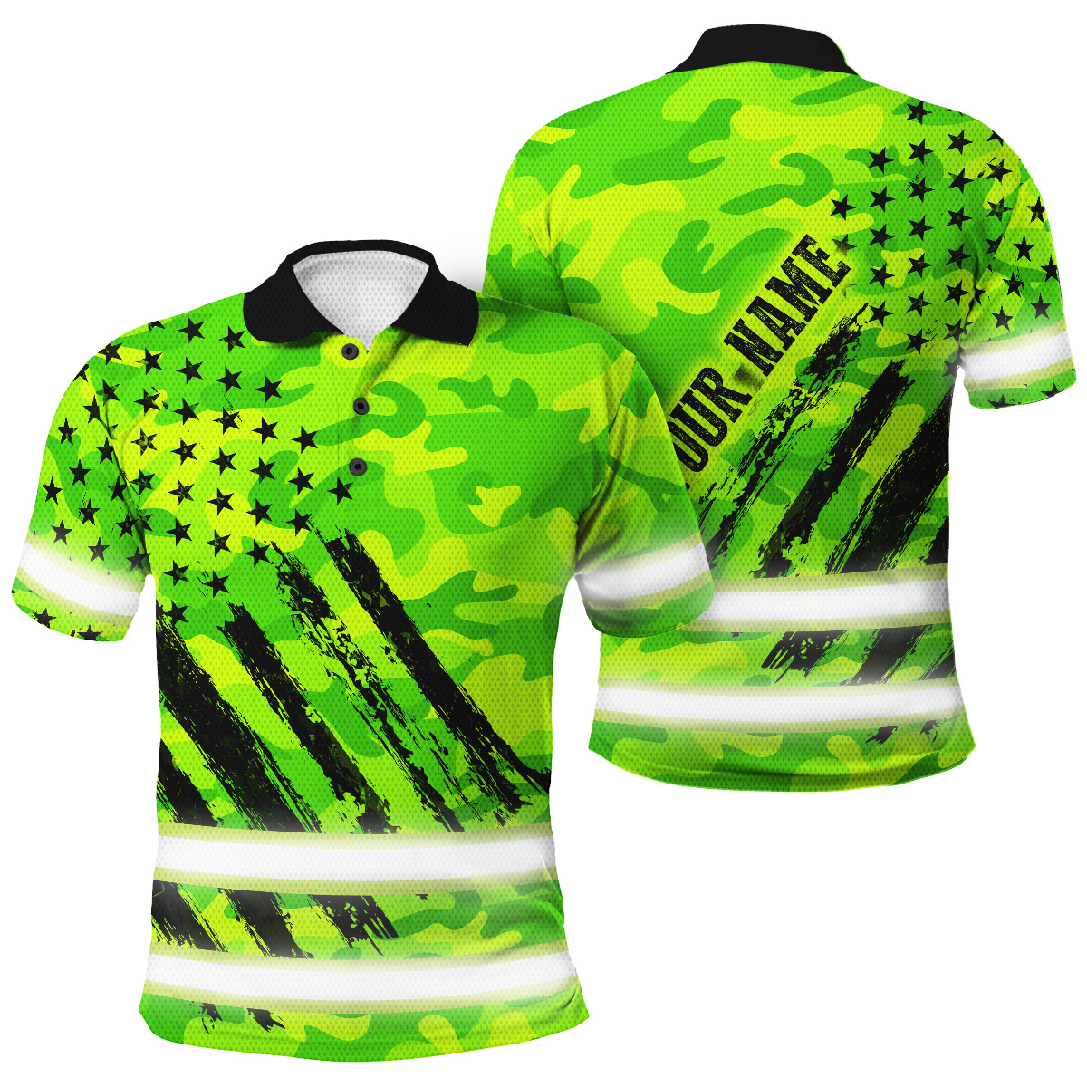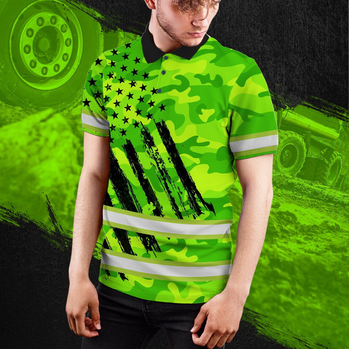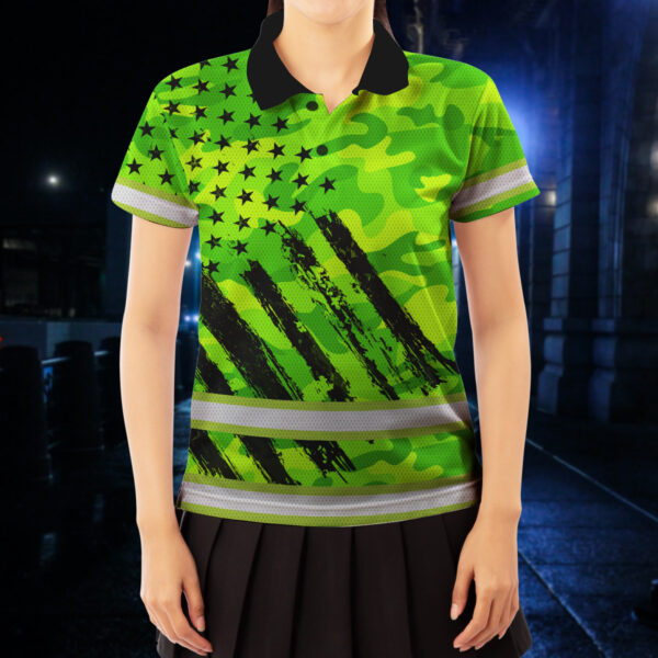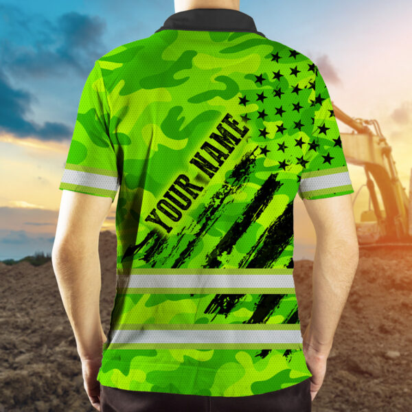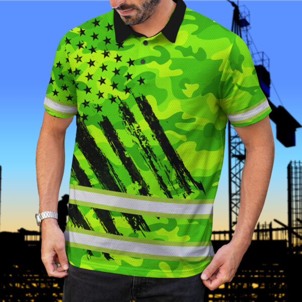 Green Neon Hi Vis Polo Shirt With US Flag Camo Pattern - Personalized Workwear For Truckers, Cyclists, Patriotic