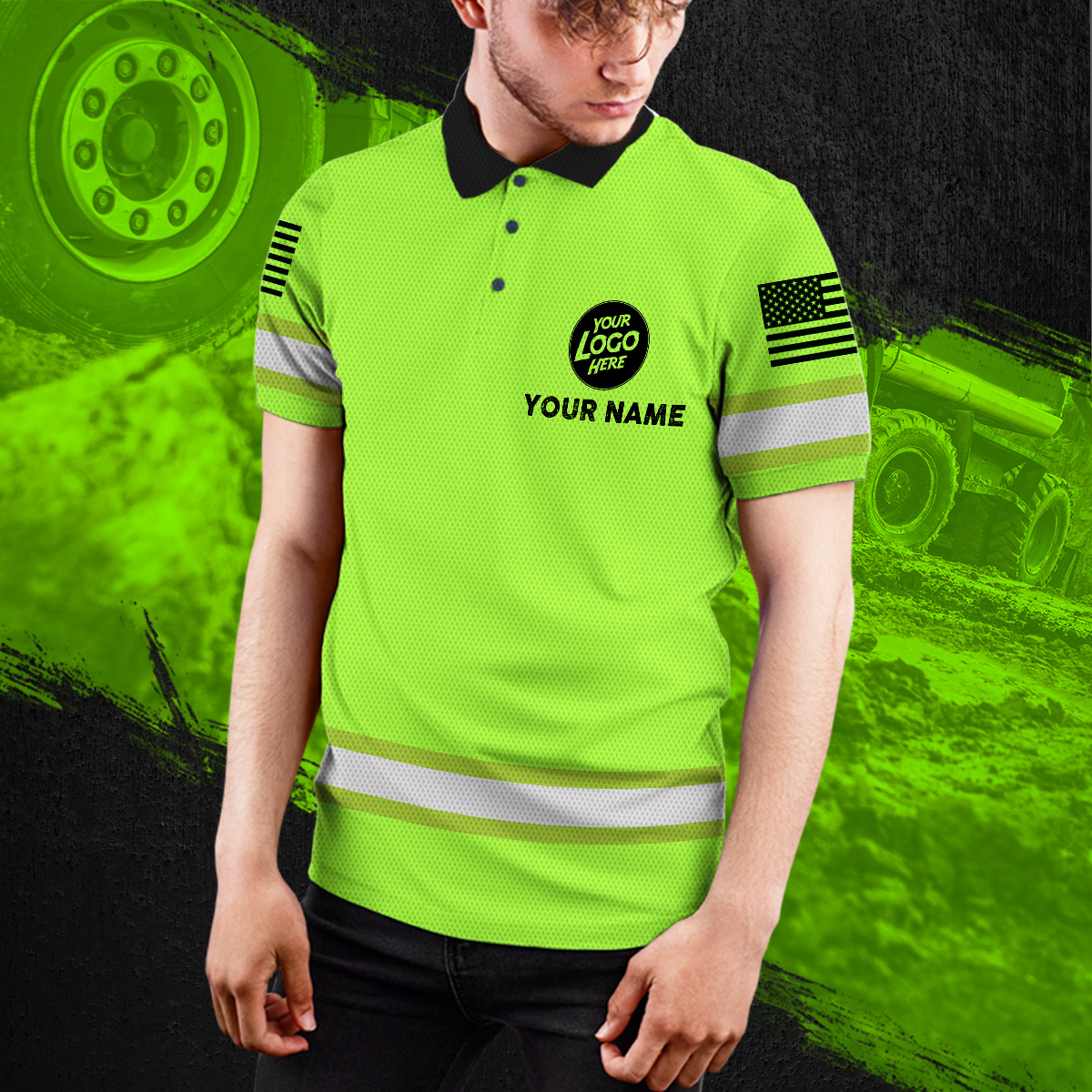 Customized Green Hi Vis Tshirt with Reflective Tape Class 3 Black US Flag Safety Workwear