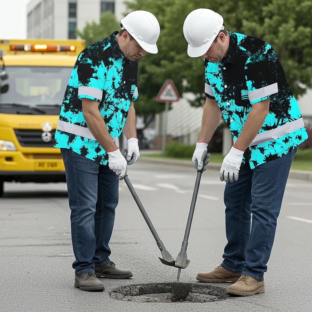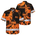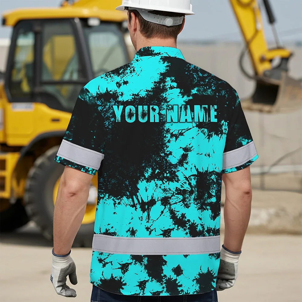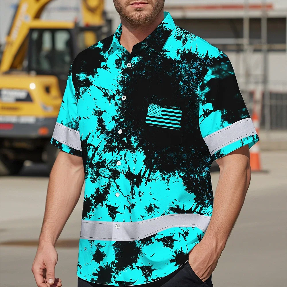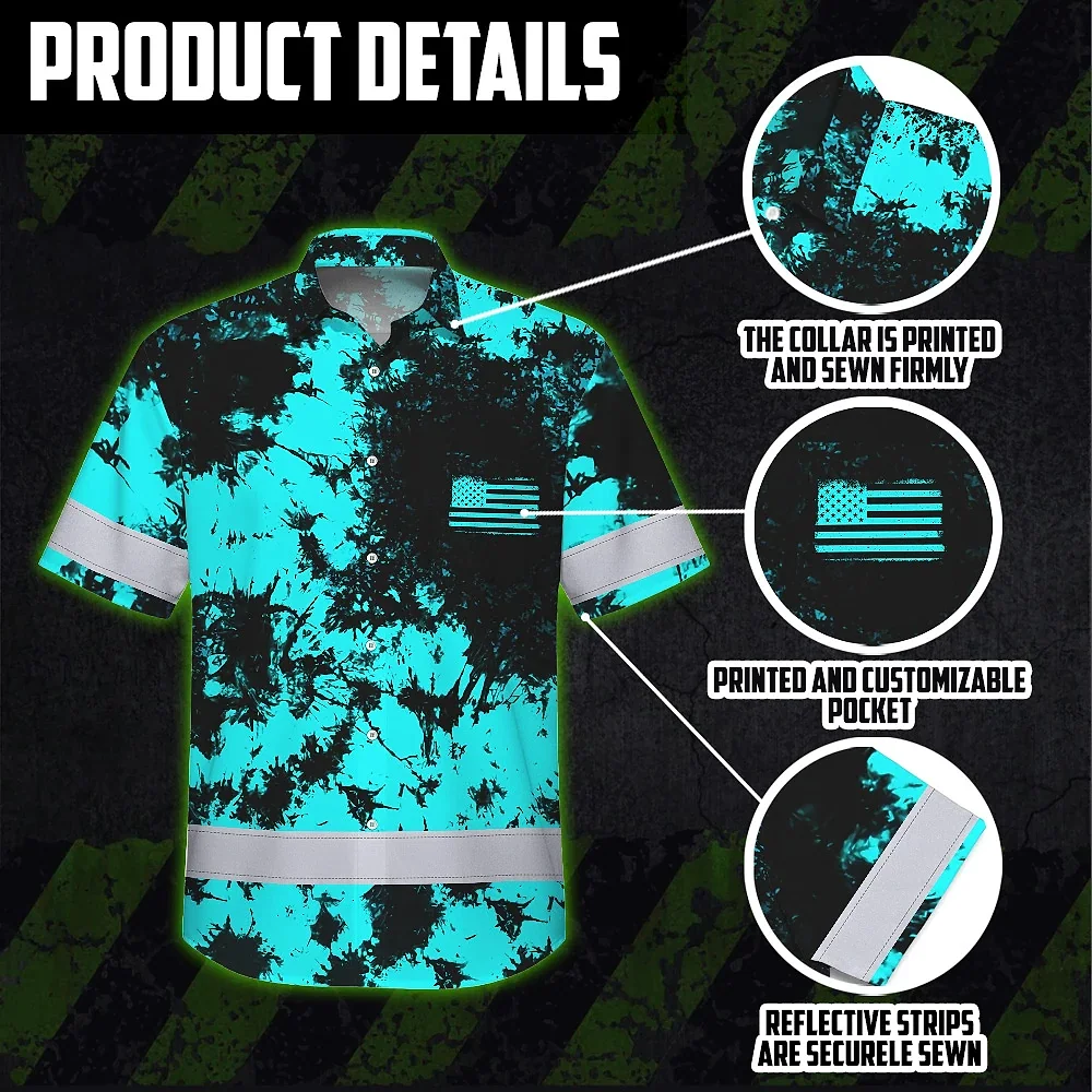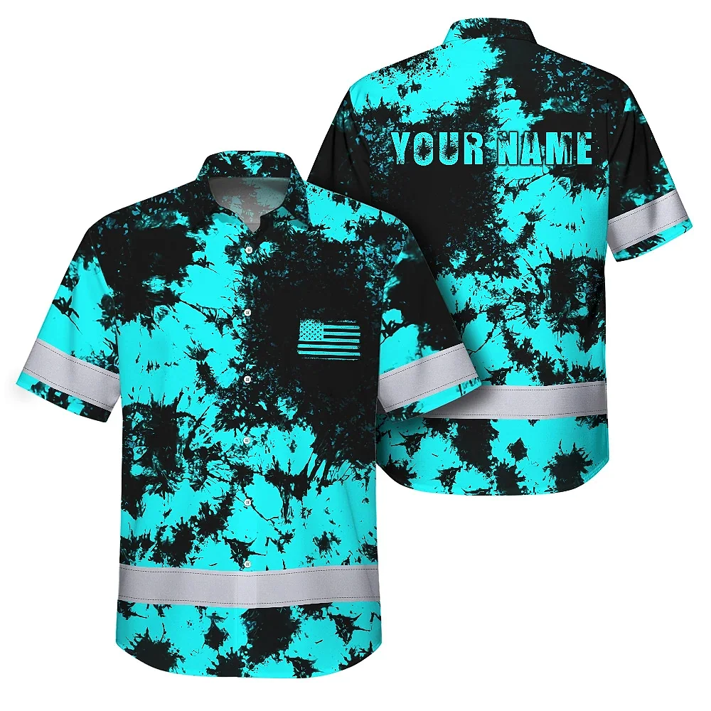Hi Vis Hawaiian American Flag Shirt, Blue Neon Custom Name Reflective Short Sleeve Button-up Safety Shirt for Workers