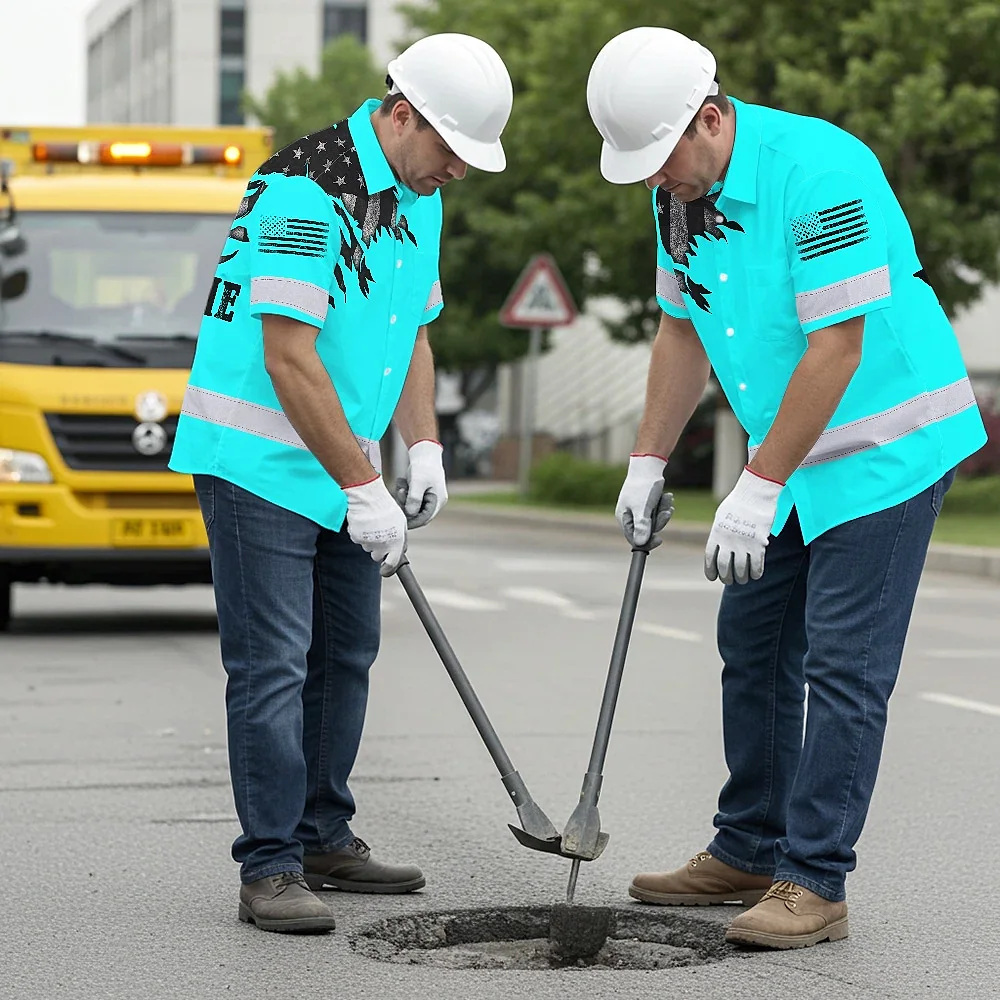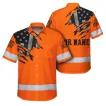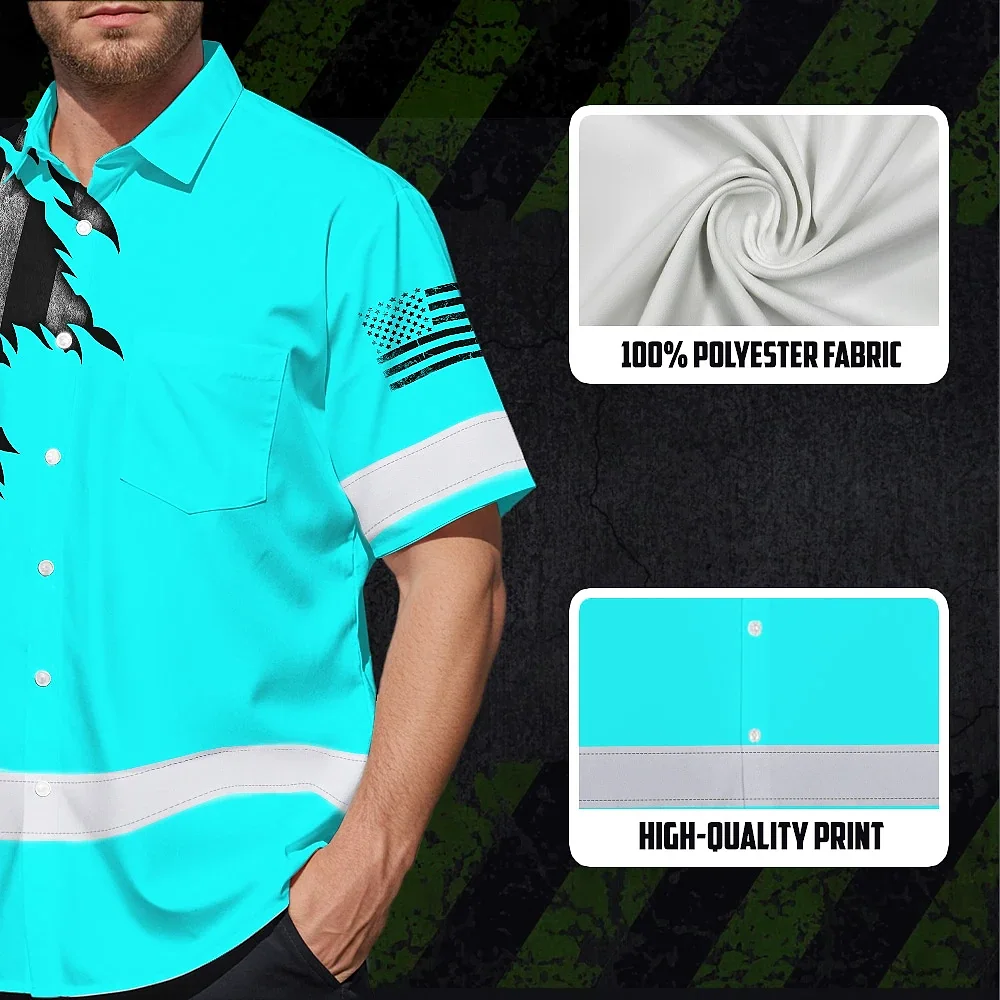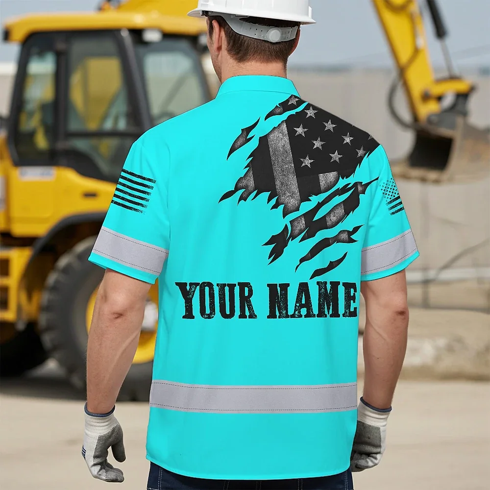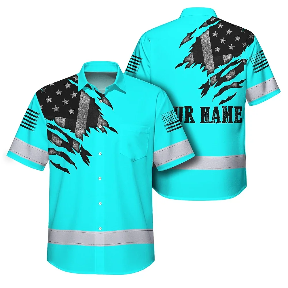 Hi Vis Hawaiian American Flag Shirt, Blue Neon Custom Name Reflective Short Sleeve Button-up Safety Shirt for Workers