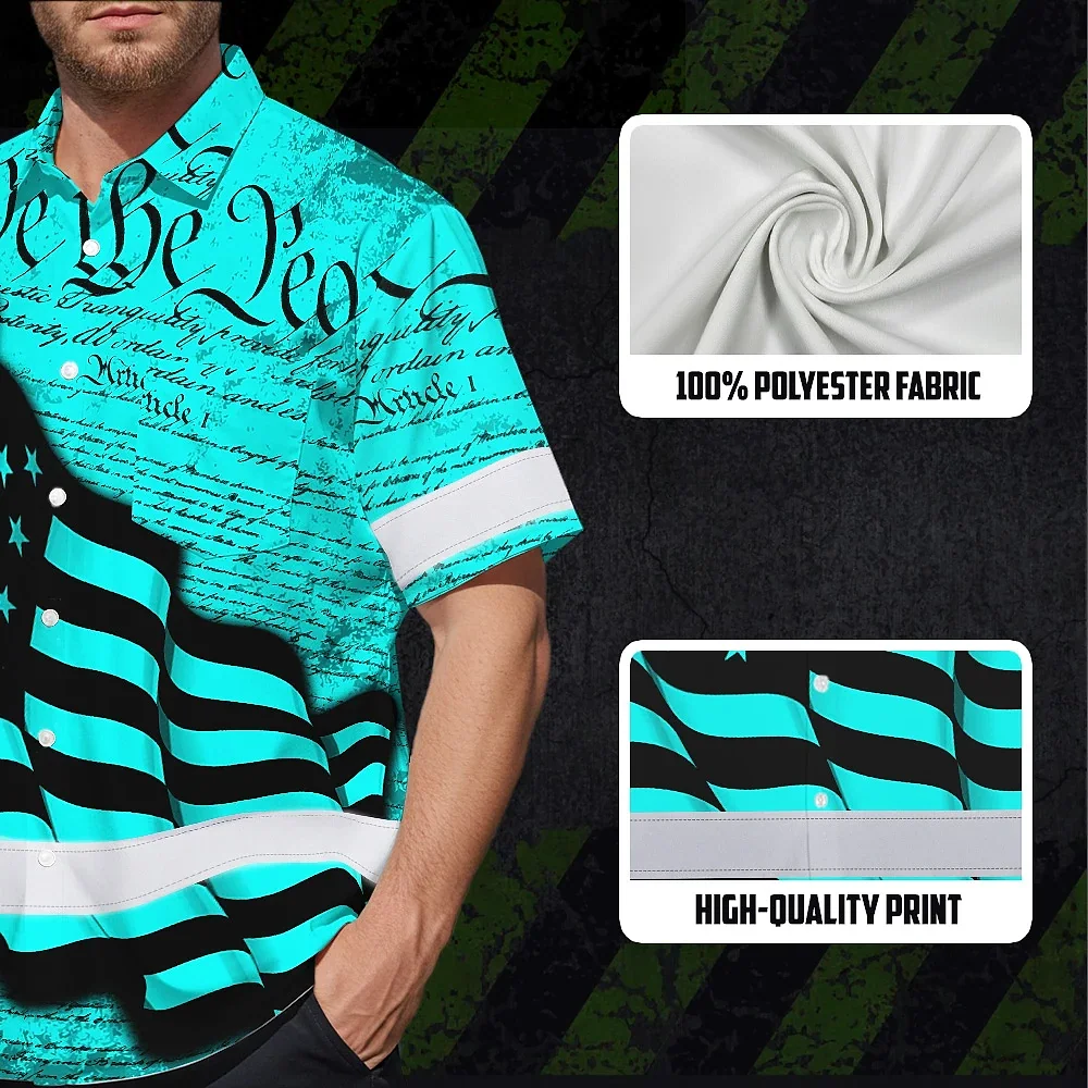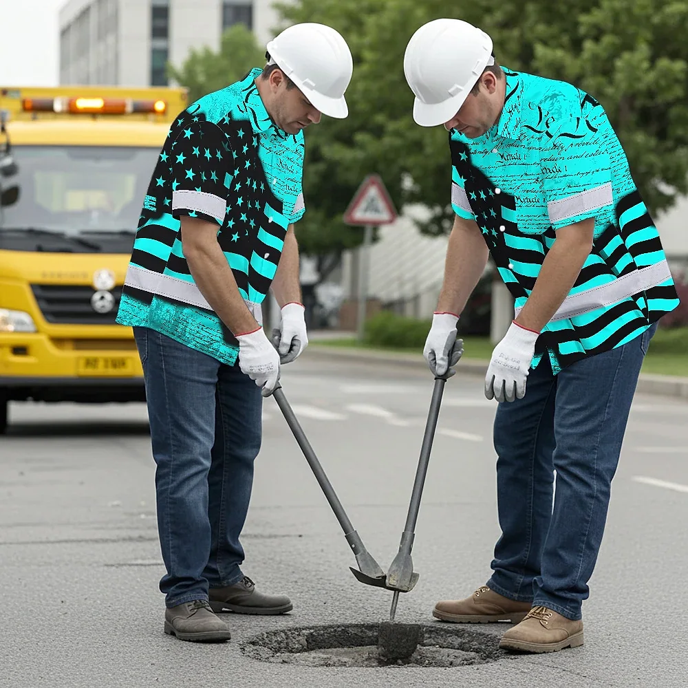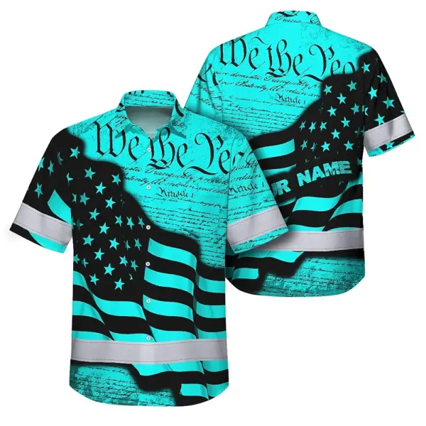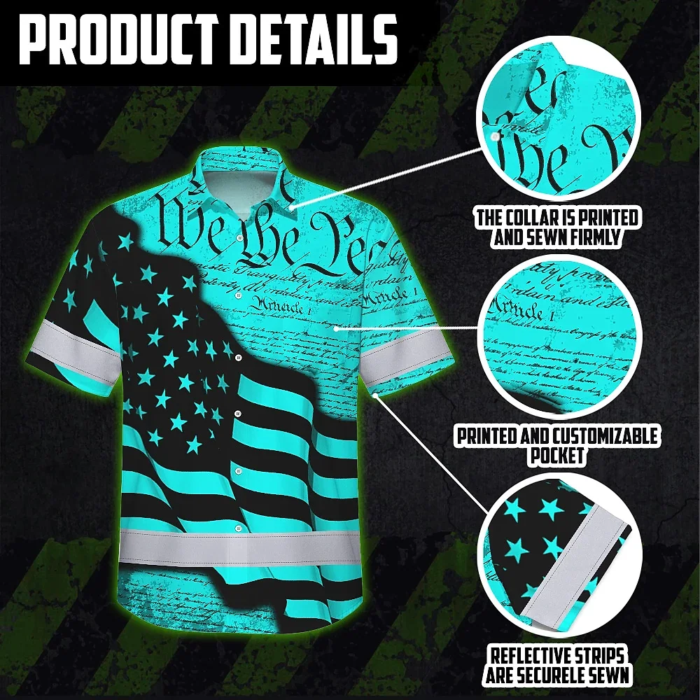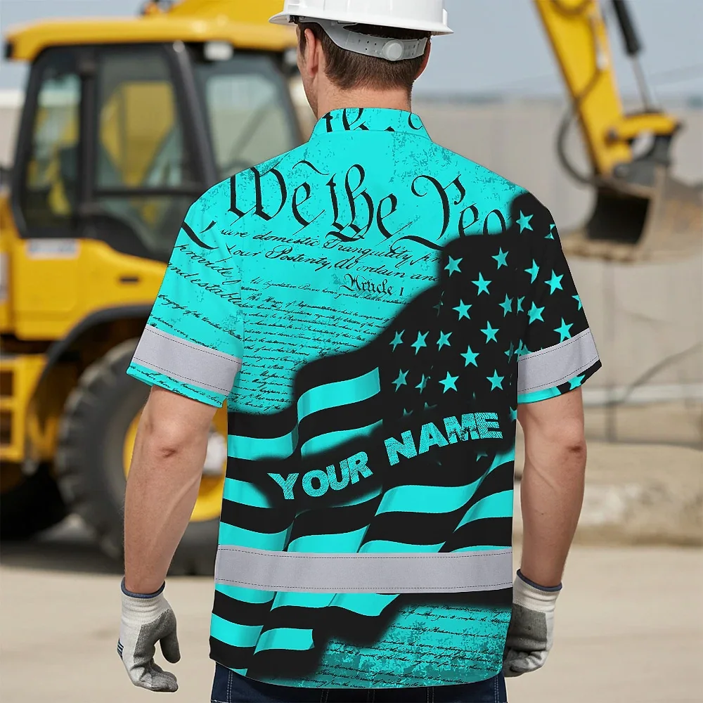 Hi Vis Hawaiian American Flag Shirt, Blue Neon Custom Name Reflective Short Sleeve Button-up Safety Shirt for Workers