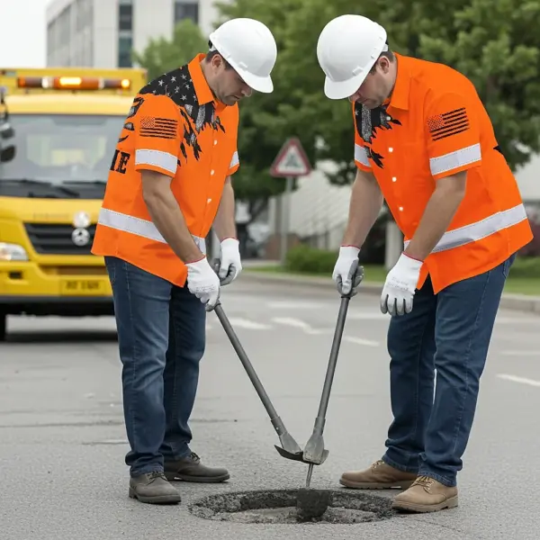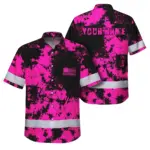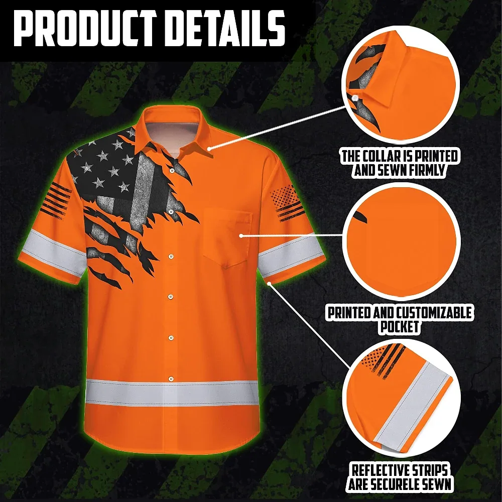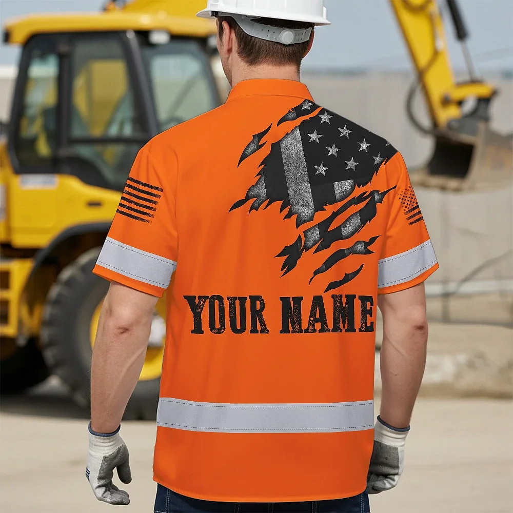 Hi Vis Hawaiian American Flag Shirt, Orange Neon Custom Name Reflective Short Sleeve Button-up Safety Shirt for Workers