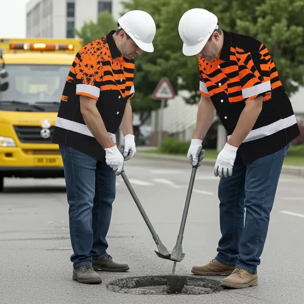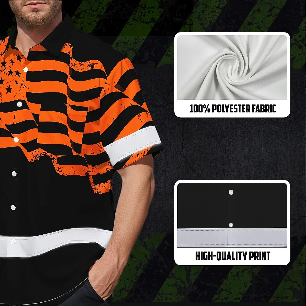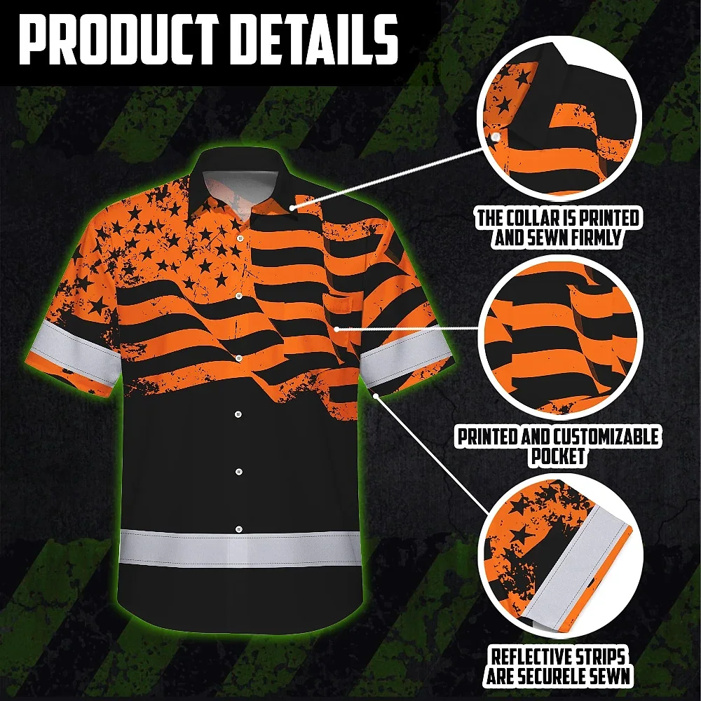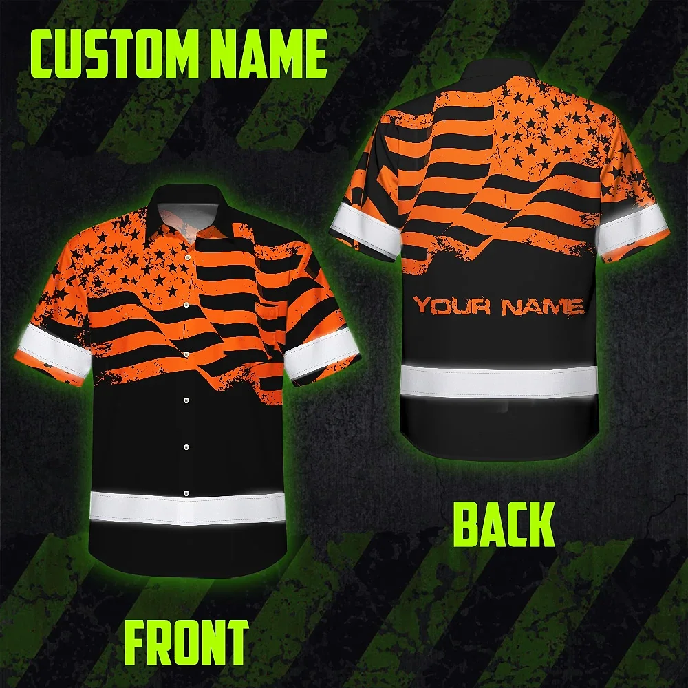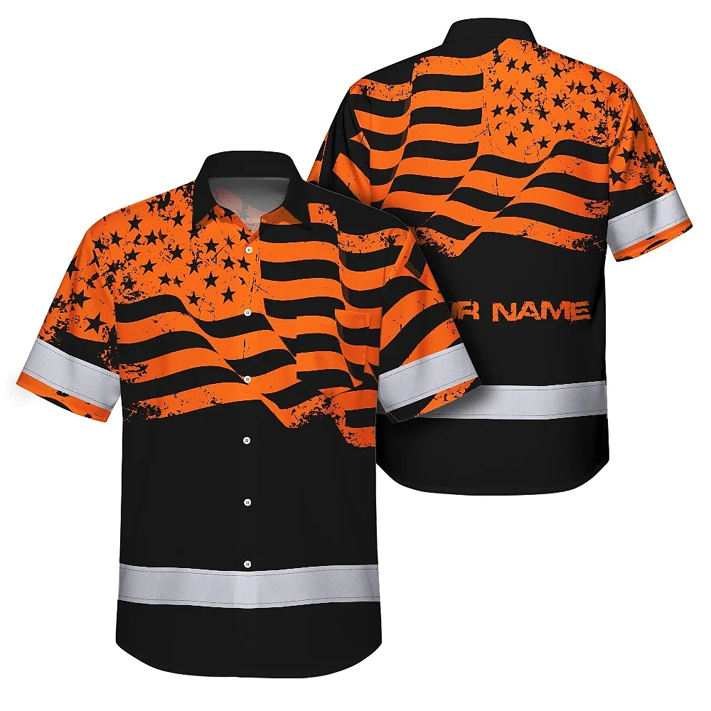Hi Vis Hawaiian American Flag Shirt, Orange Neon Custom Name Reflective Short Sleeve Button-up Safety Shirt for Workers