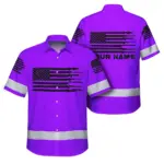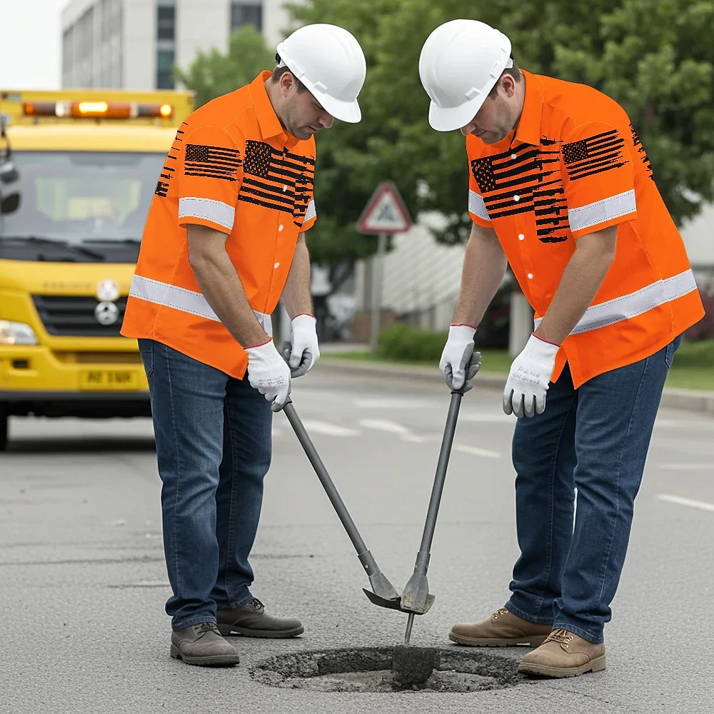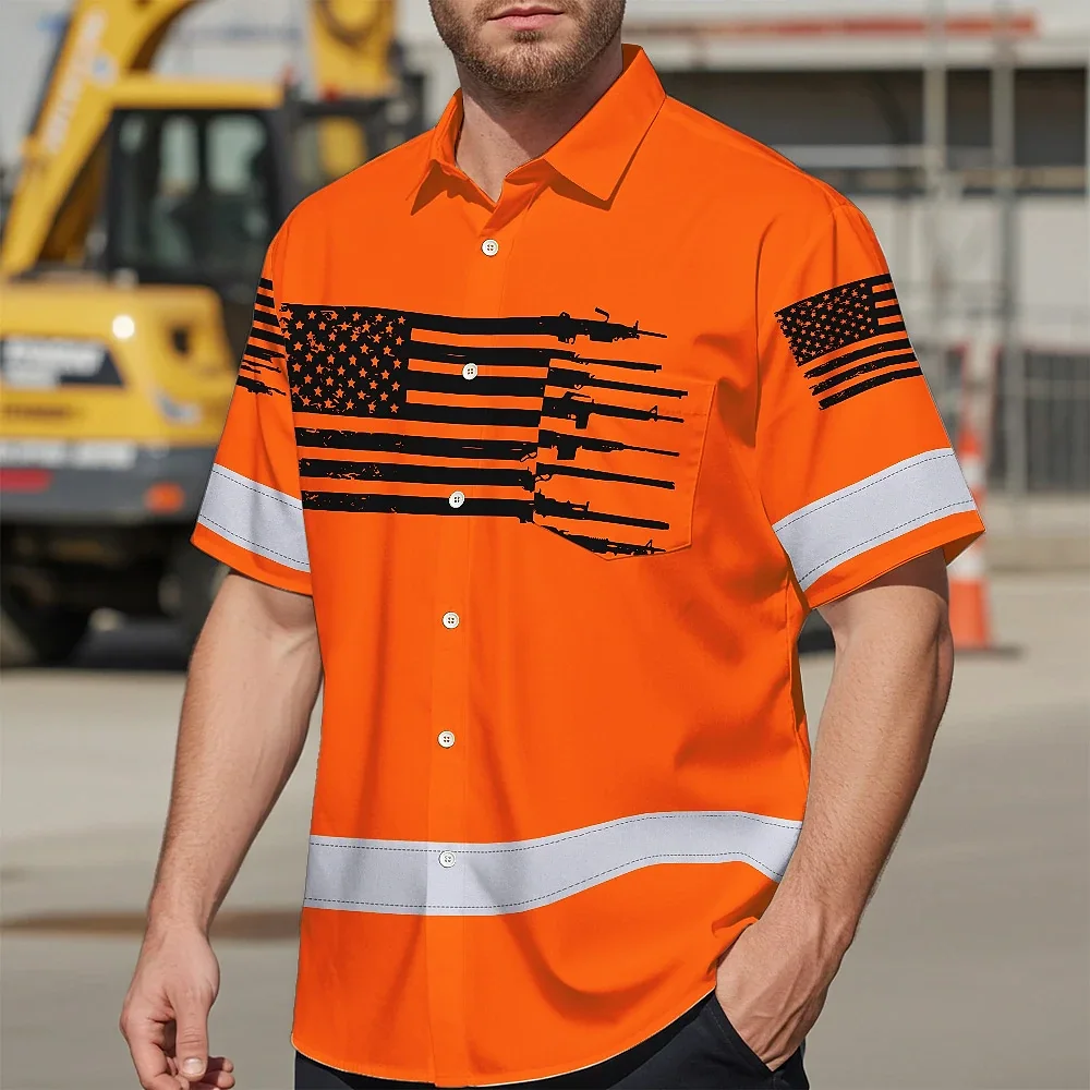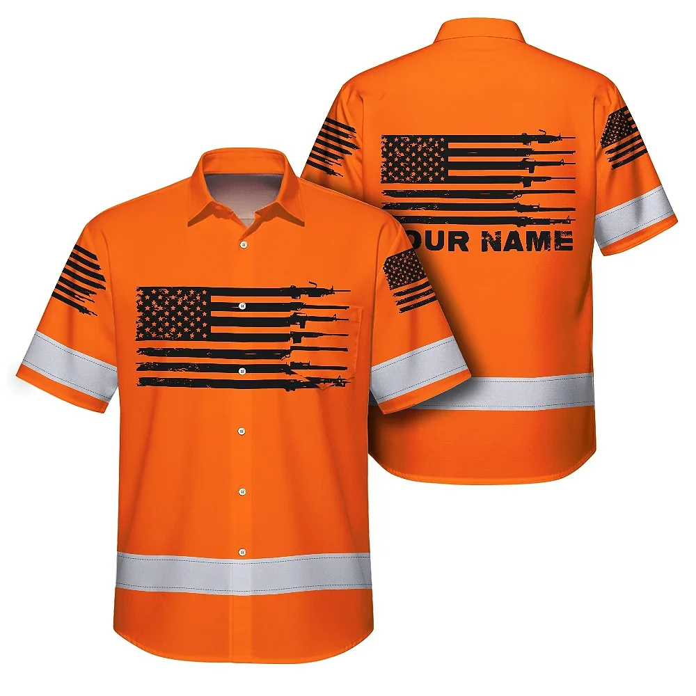 Hi Vis Hawaiian American Flag Shirt, Orange Neon Custom Name Reflective Short Sleeve Button-up Safety Shirt for Workers