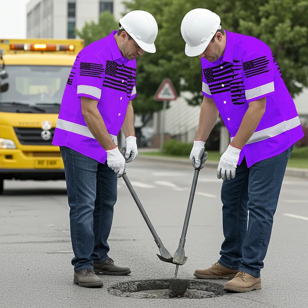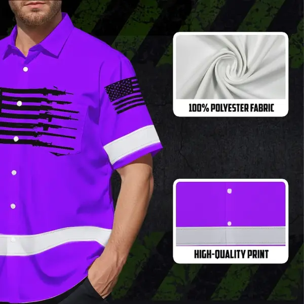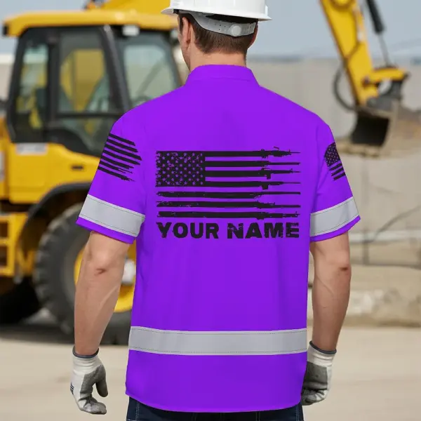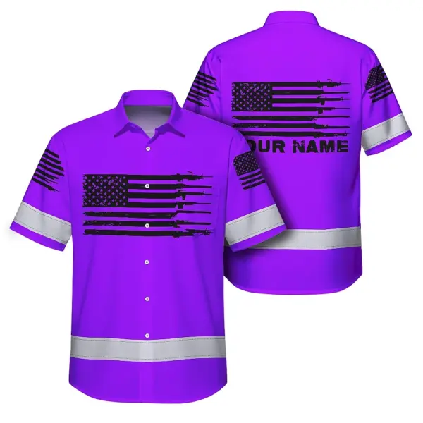 Hi Vis Hawaiian American Flag Shirt, Violet Neon Custom Name Reflective Short Sleeve Button-up Safety Shirt for Workers