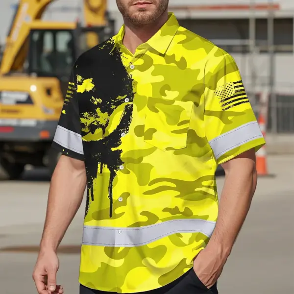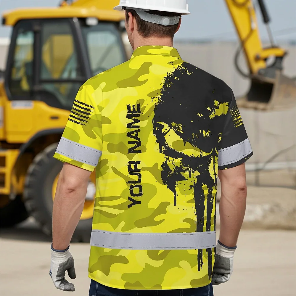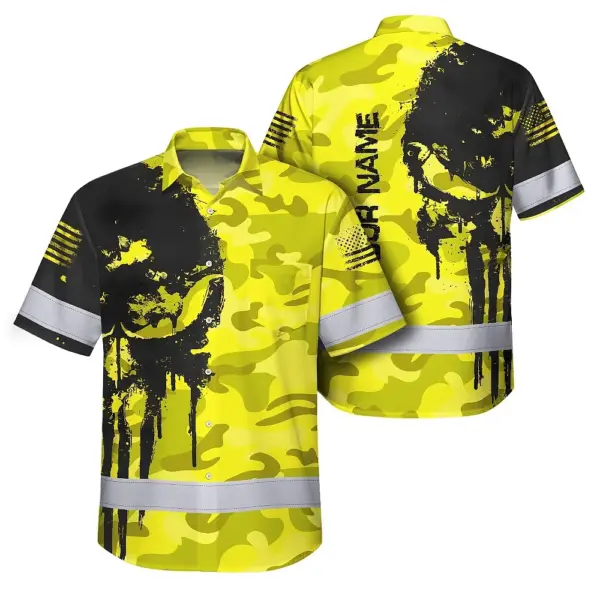 Hi Vis Hawaiian American Flag Shirt, Yellow Neon Custom Name Reflective Short Sleeve Button-up Safety Shirt for Workers