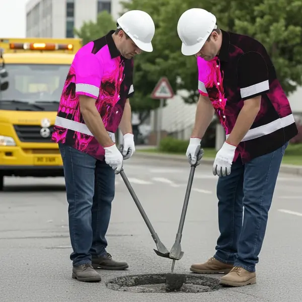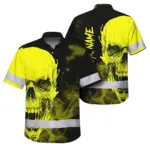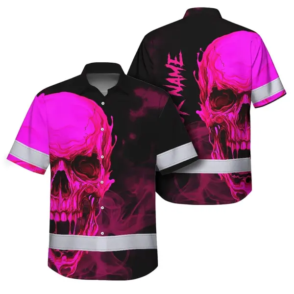 Hi Vis Hawaiian Shirt Reflective Tapes Black And Pink Neon Skull Custom Name Safety Workwear For Workers, Truckers, Operators
