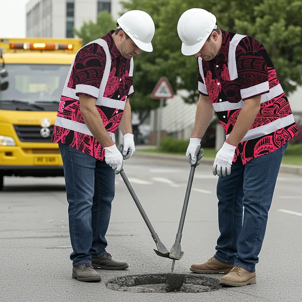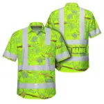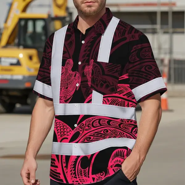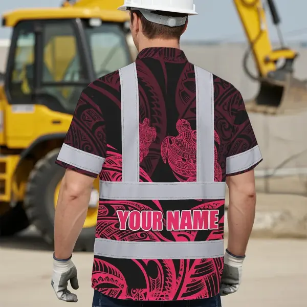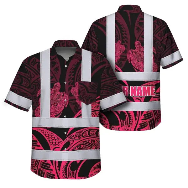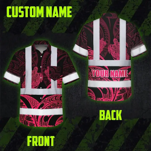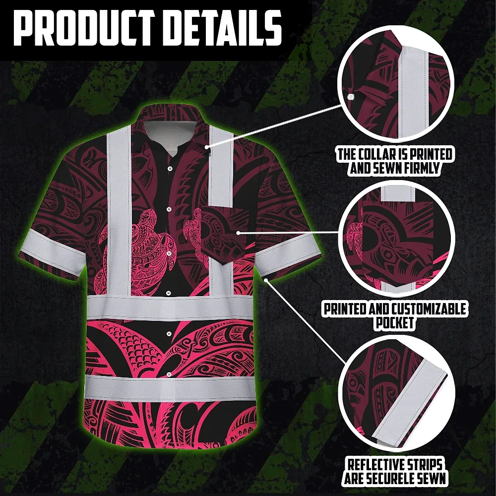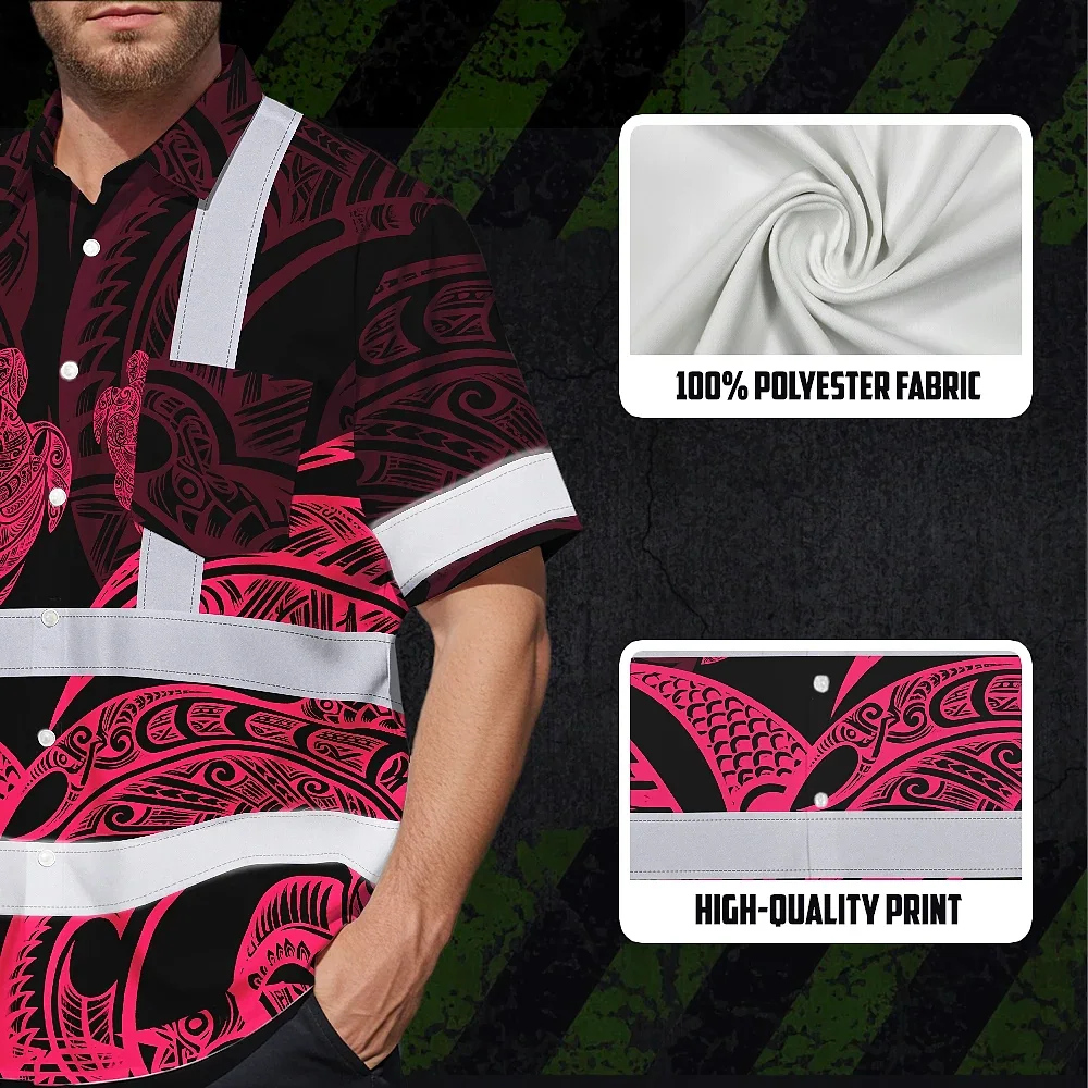 Hi Vis Hawaiian Shirt Reflective Tapes Black Light Pink Polynesian Custom Name Safety Workwear For Workers, Truckers, Operators