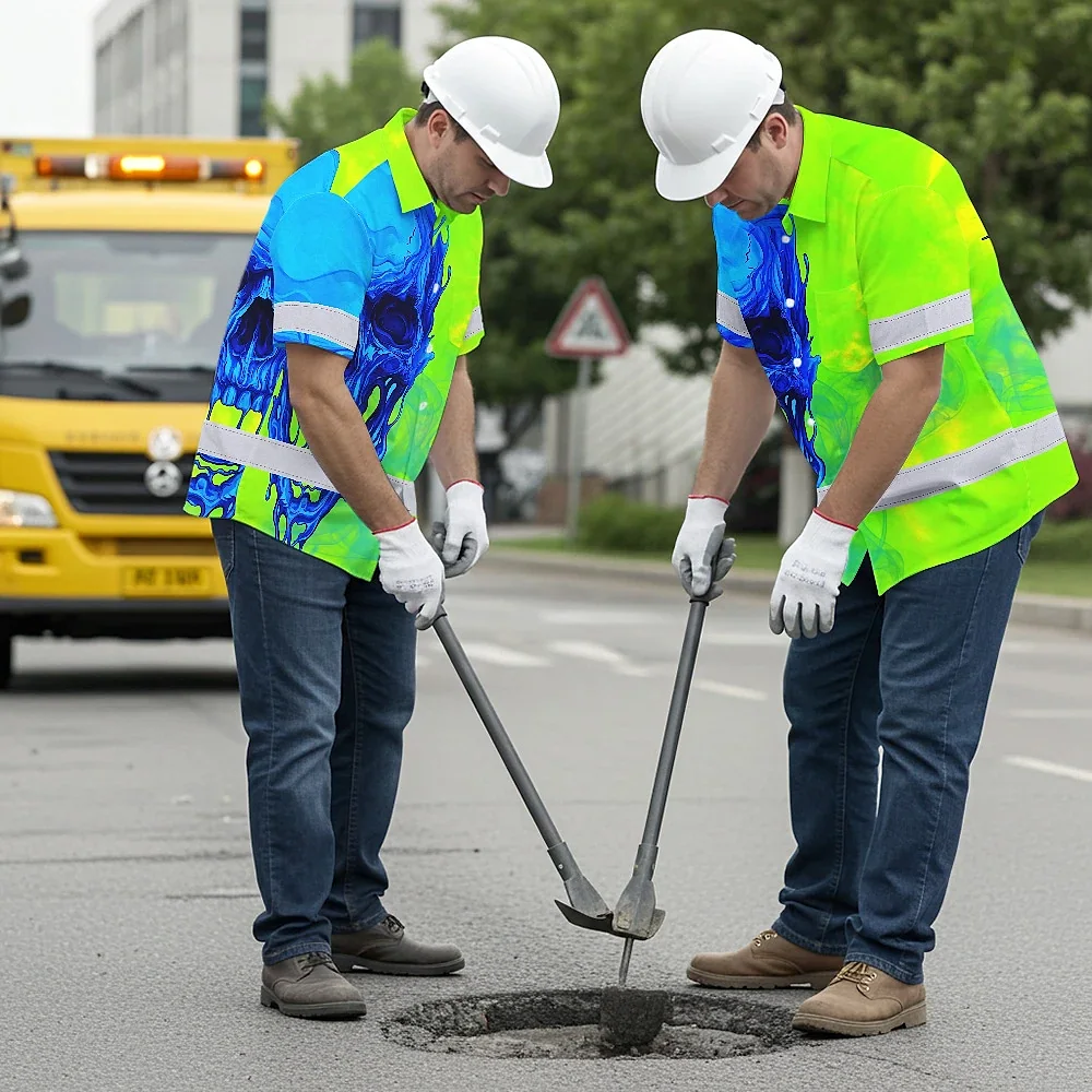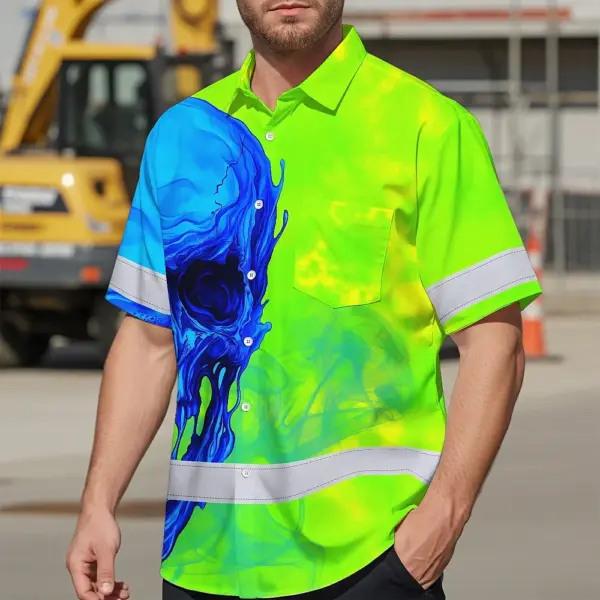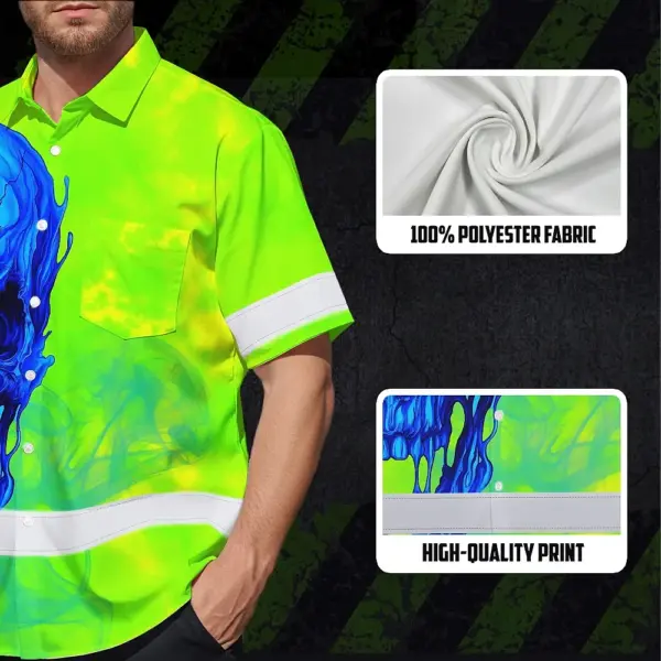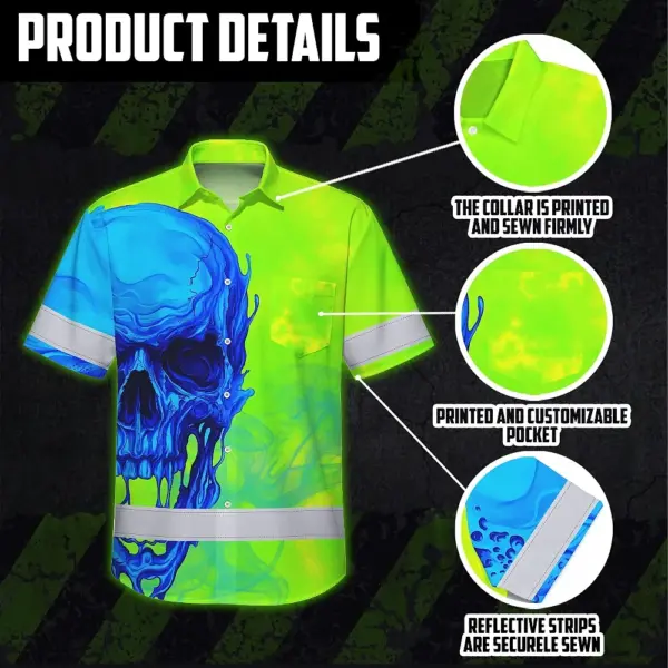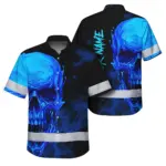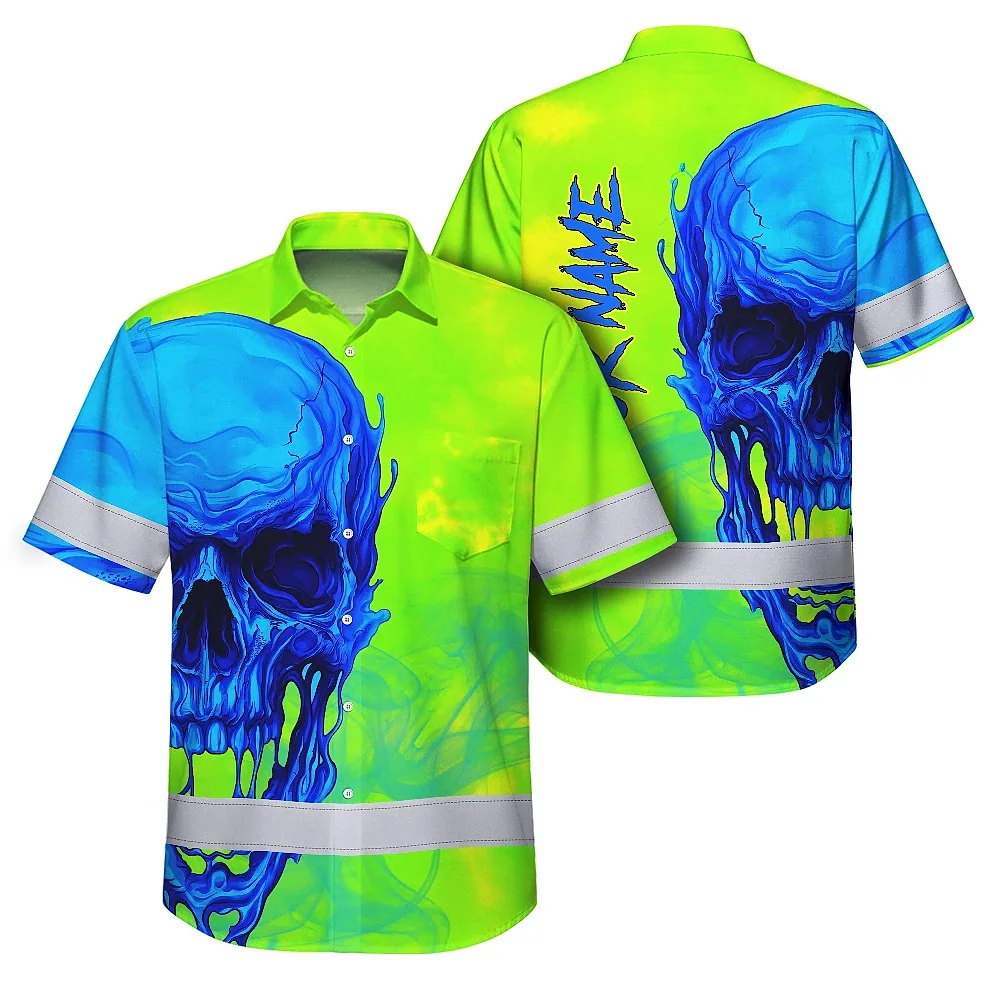 Hi Vis Hawaiian Shirt Reflective Tapes Blue Green Skull Custom Name Safety Workwear For Workers, Truckers, Operators