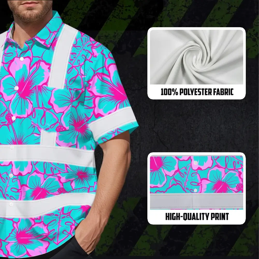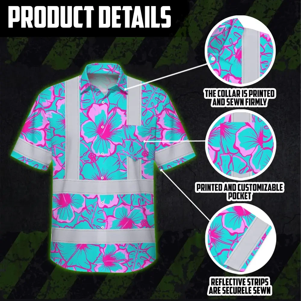 Hi Vis Hawaiian Shirt Reflective Tapes Blue Neon And Pink Flowers Custom Name Safety Workwear For Workers, Truckers, Operators