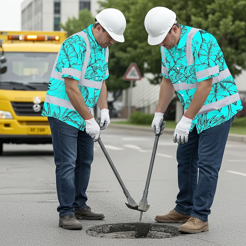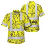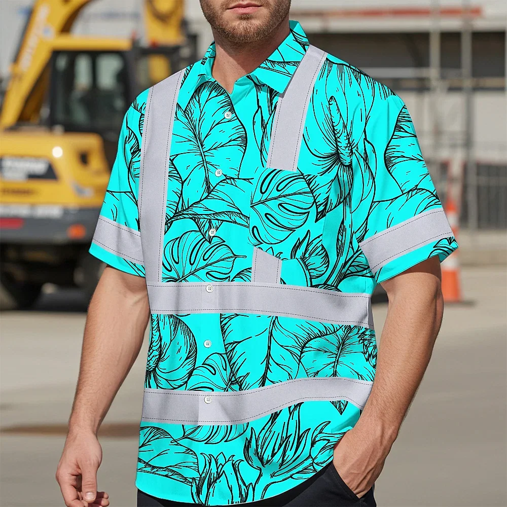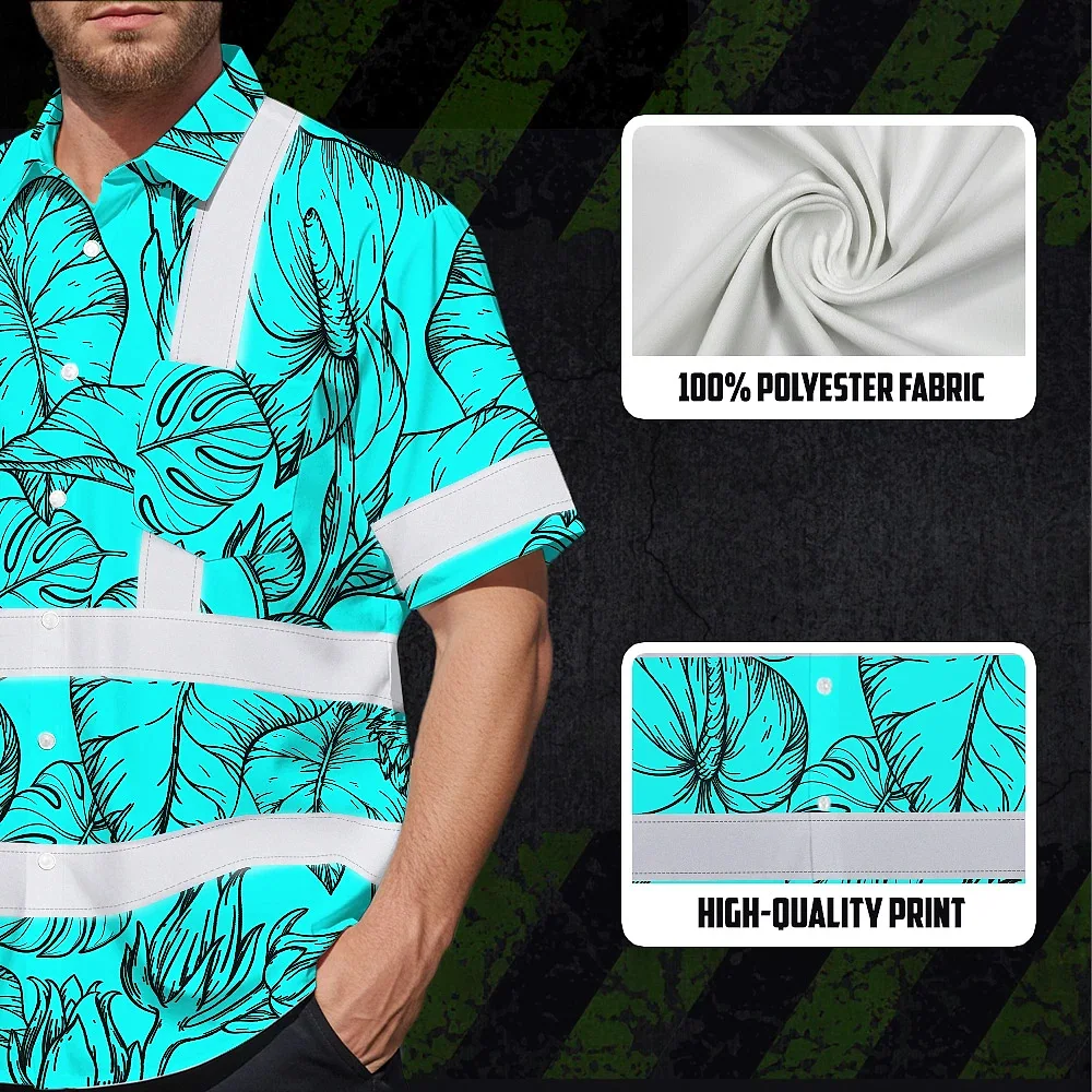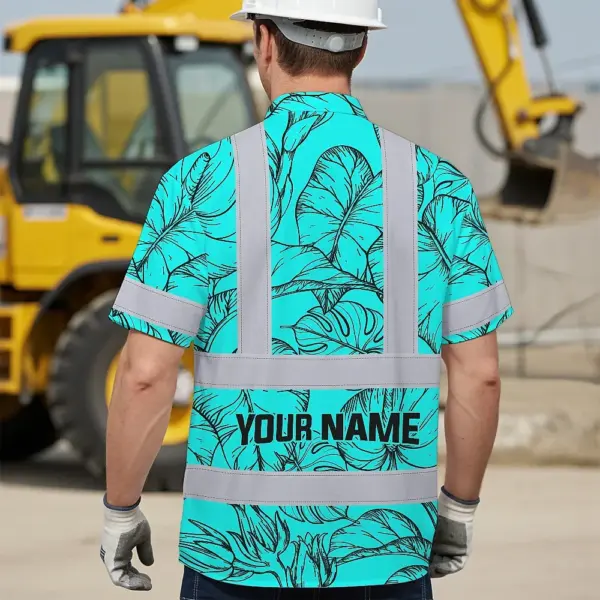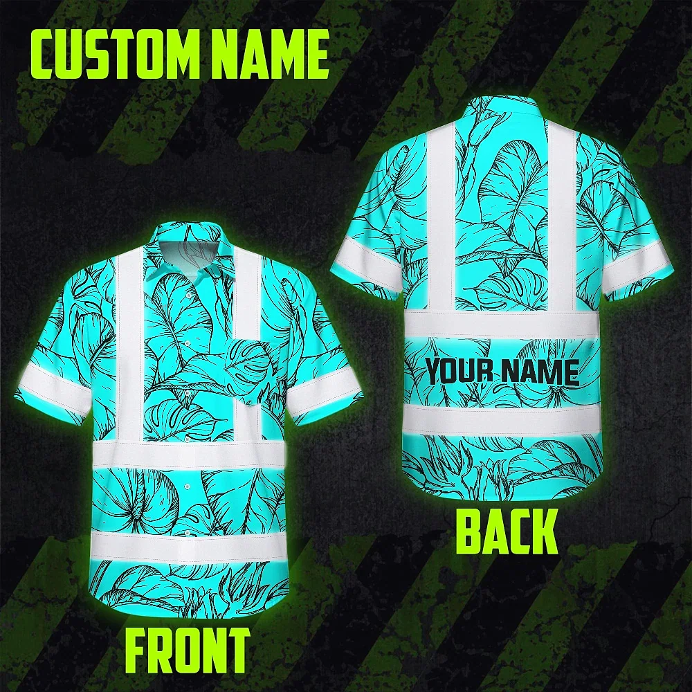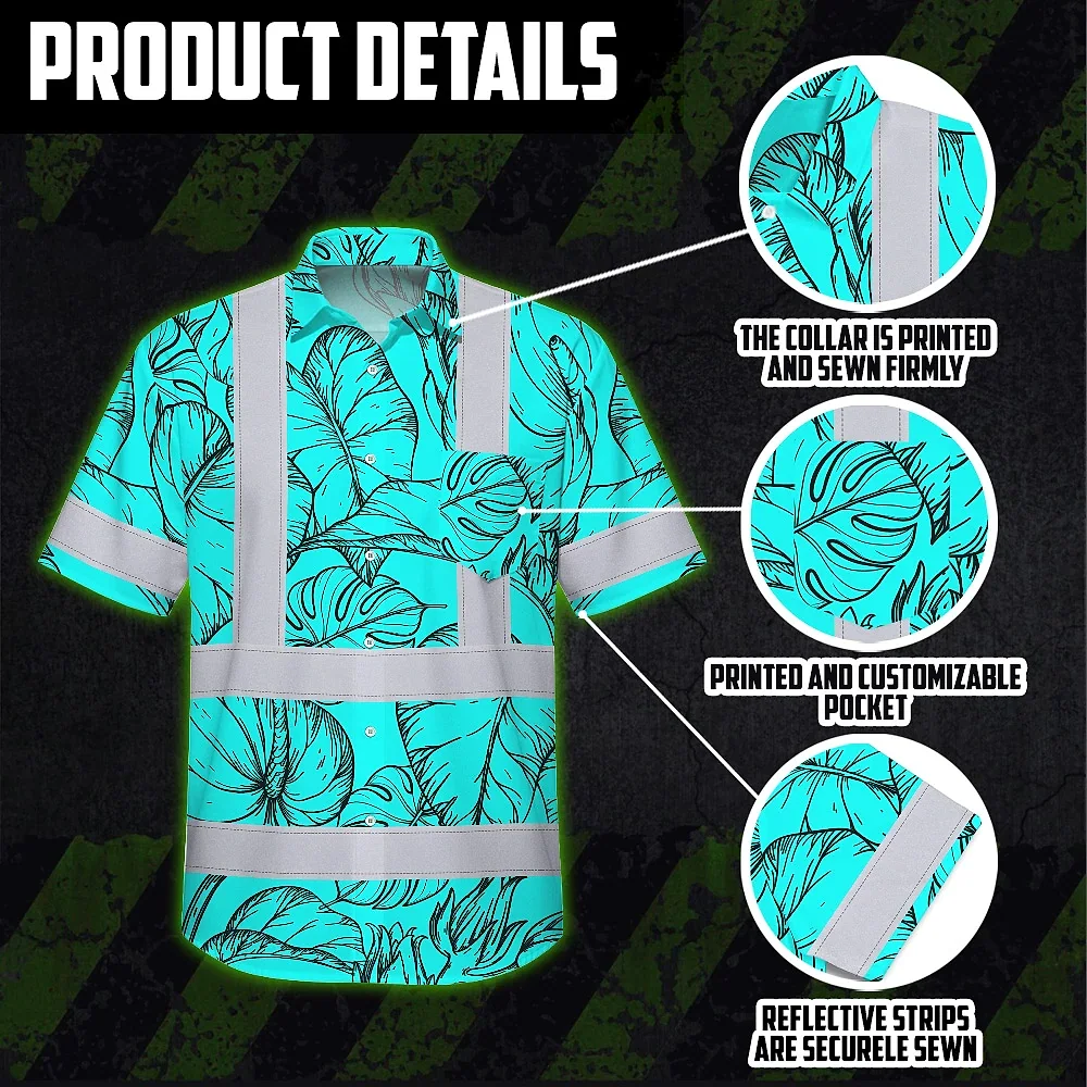 Hi Vis Hawaiian Shirt Reflective Tapes Blue Neon Flowers Custom Name Safety Workwear For Workers, Truckers, Operators