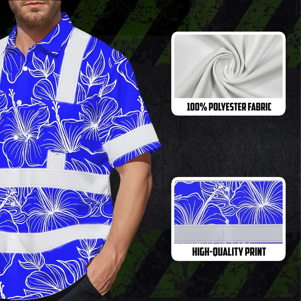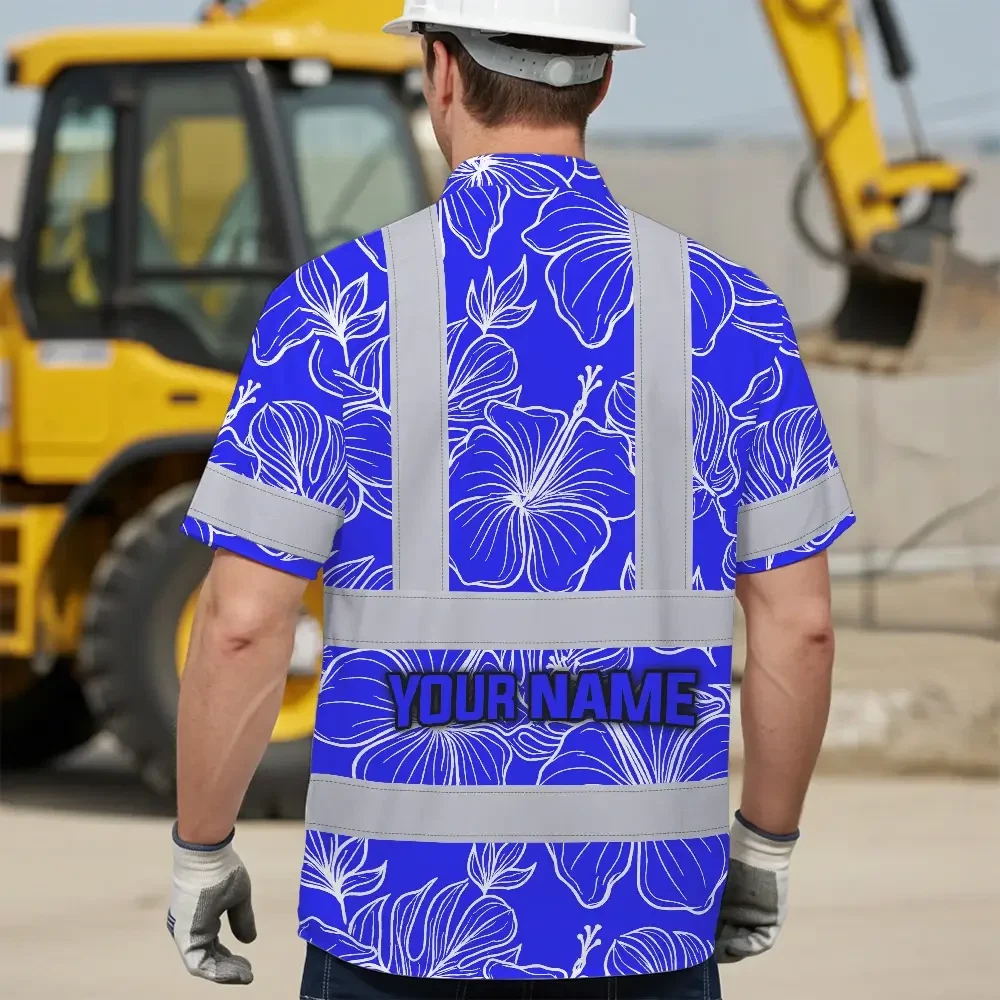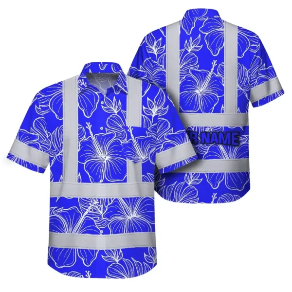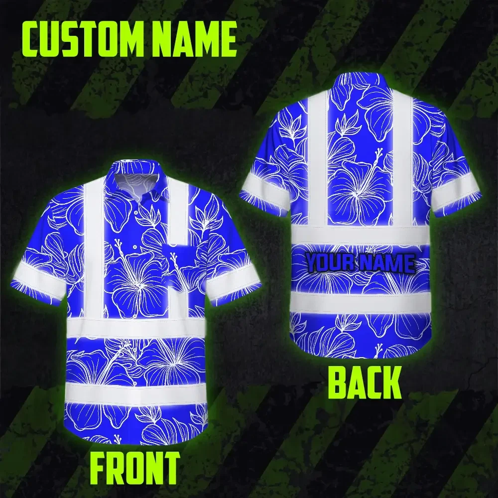 Hi Vis Hawaiian Shirt Reflective Tapes Blue Neon Flowers Custom Name Safety Workwear For Workers, Truckers, Operators