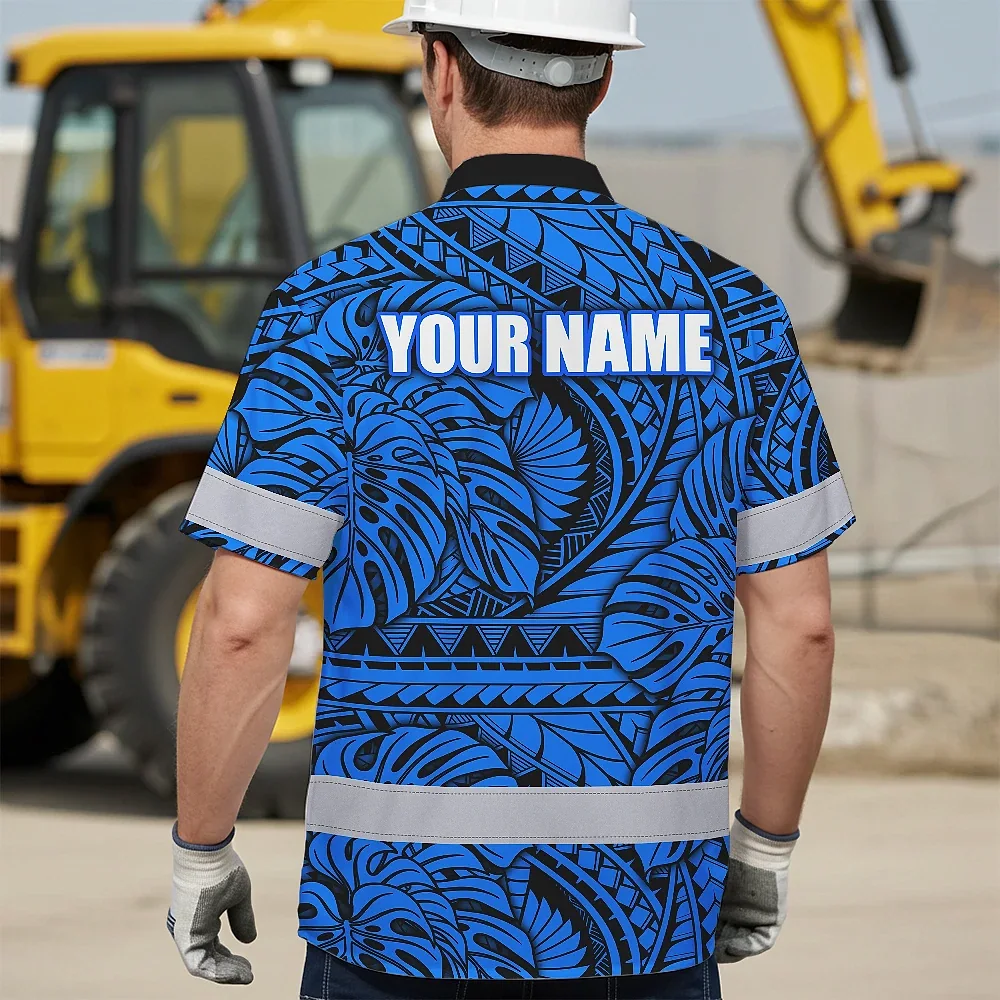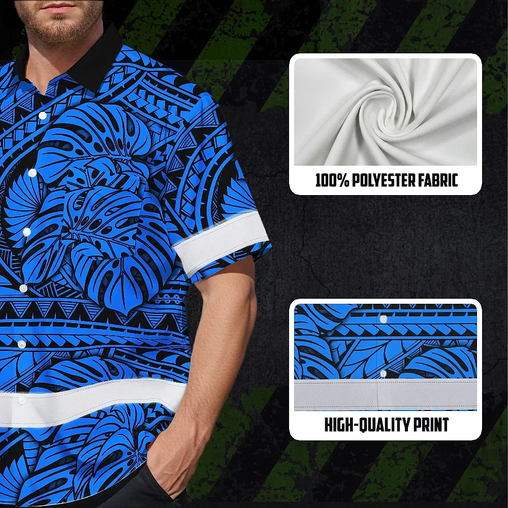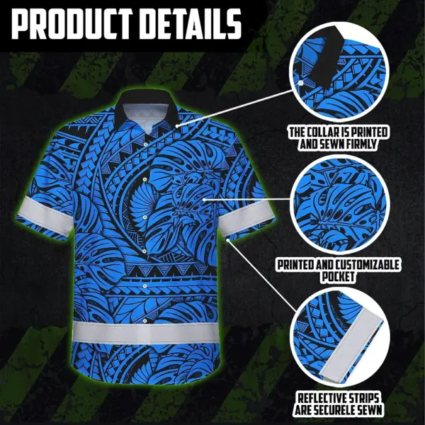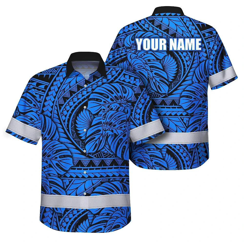 Hi Vis Hawaiian Shirt Reflective Tapes Blue Neon Polynesian Tribal Custom Name Safety Workwear For Workers, Truckers, Operators
