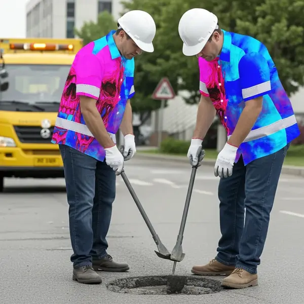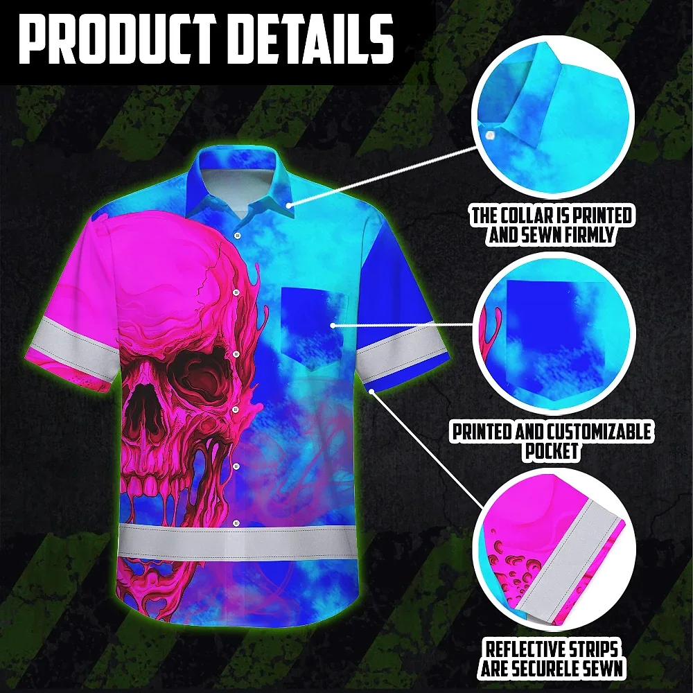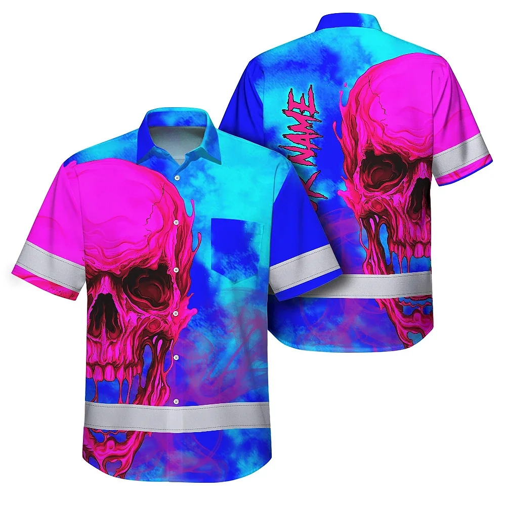 Hi Vis Hawaiian Shirt Reflective Tapes Blue Pink Skull Custom Name Safety Workwear For Workers, Truckers, Operators