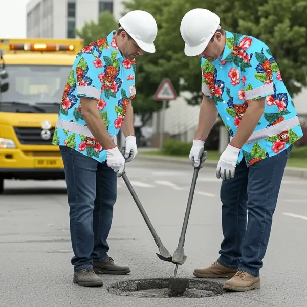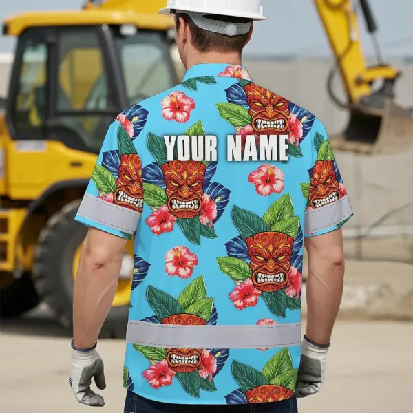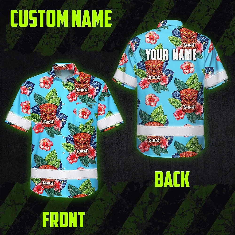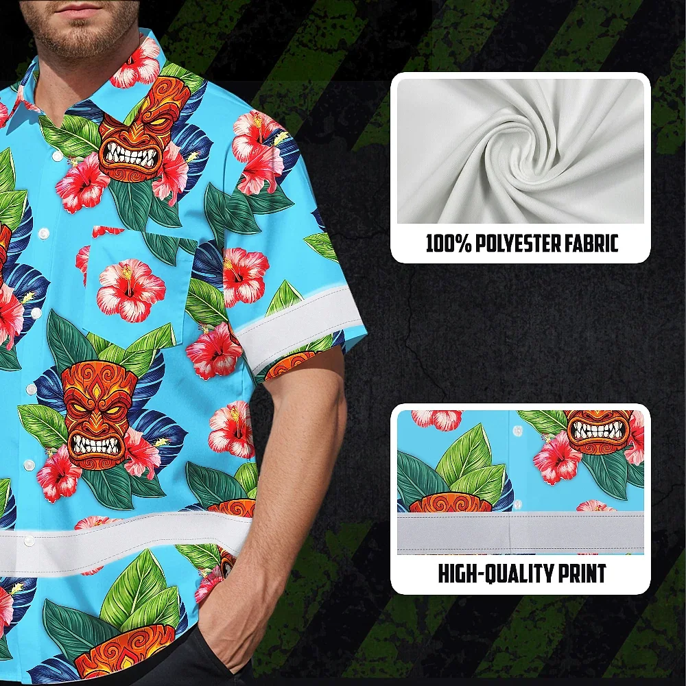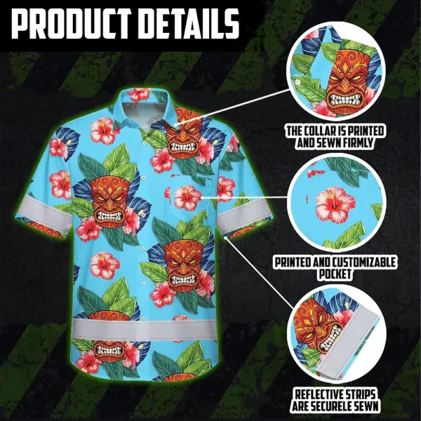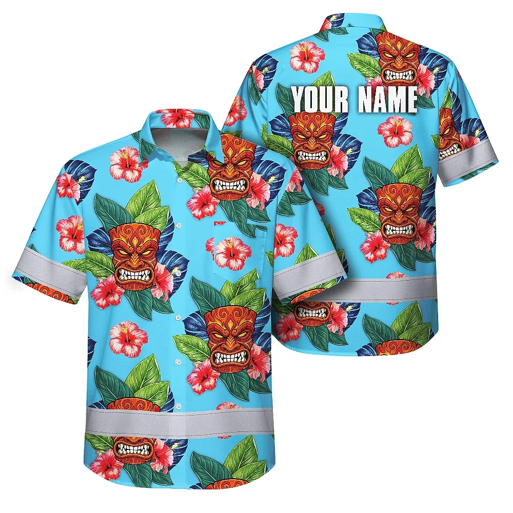 Hi Vis Hawaiian Shirt Reflective Tapes Blue Tiki Flower Custom Name Safety Workwear For Workers, Truckers, Operators