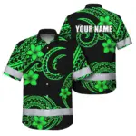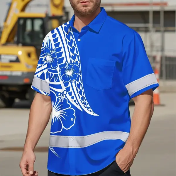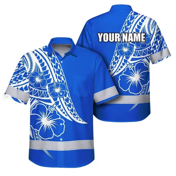 Hi Vis Hawaiian Shirt Reflective Tapes Blue White Polynesian Custom Name Safety Workwear For Workers, Truckers, Operators