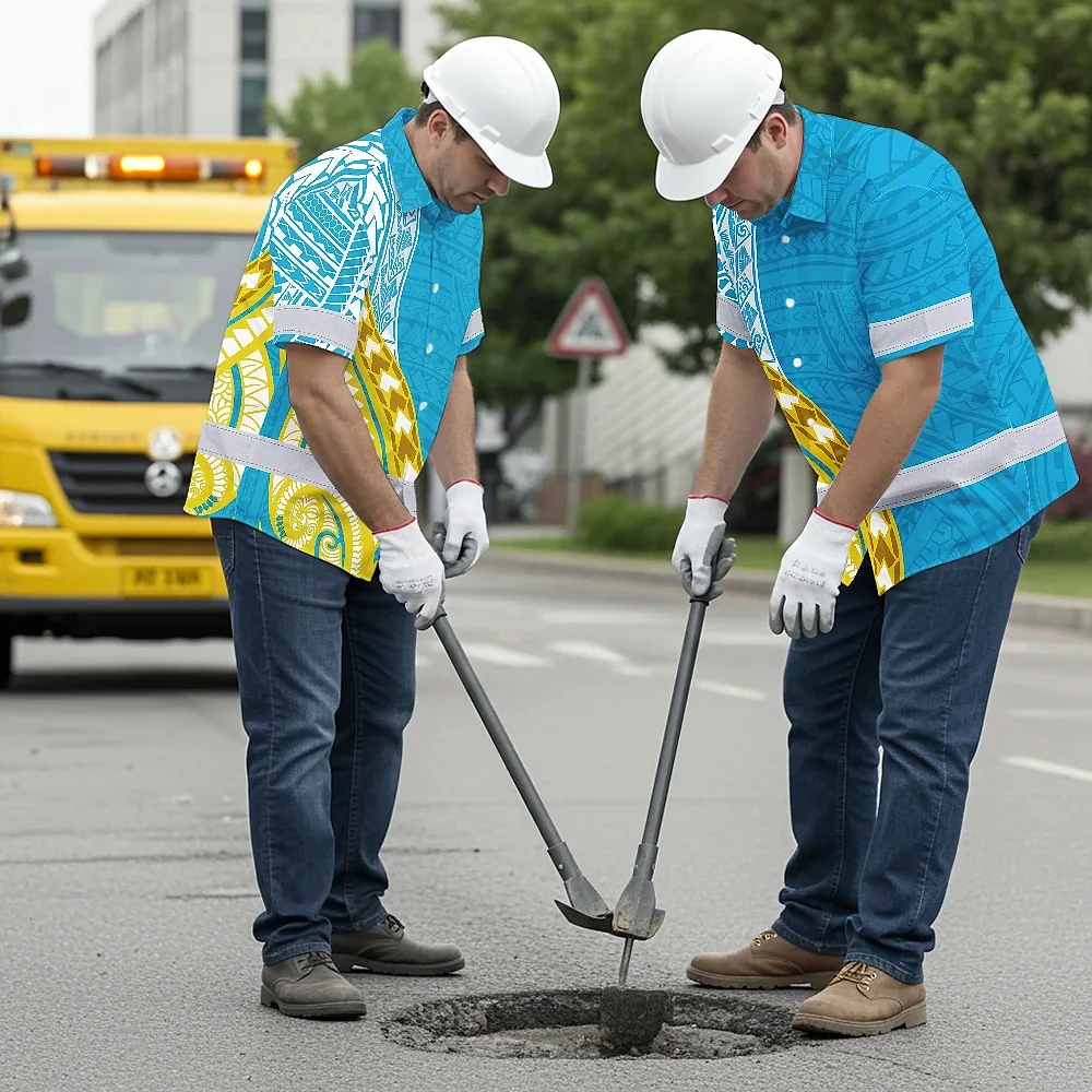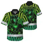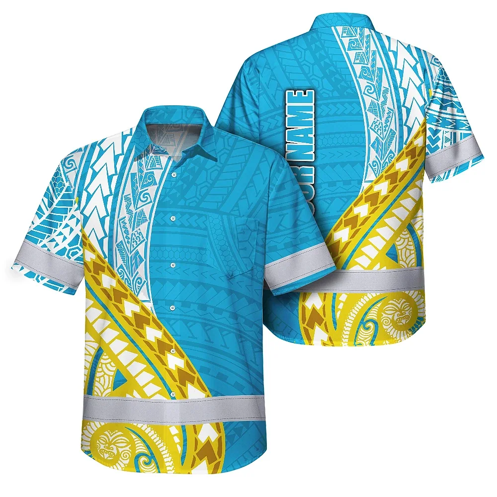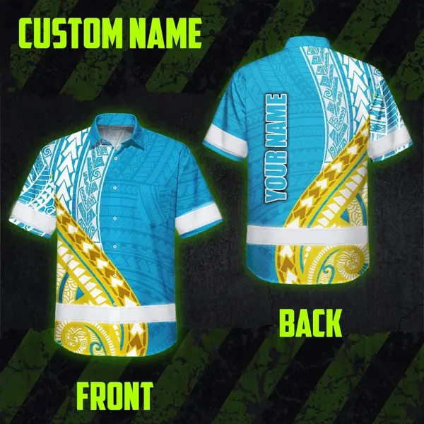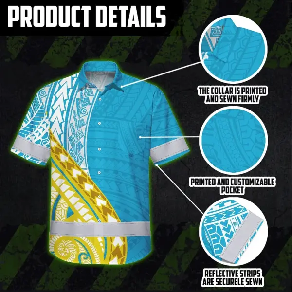 Hi Vis Hawaiian Shirt Reflective Tapes Blue Yellow Polynesian Custom Name Safety Workwear For Workers, Truckers, Operators