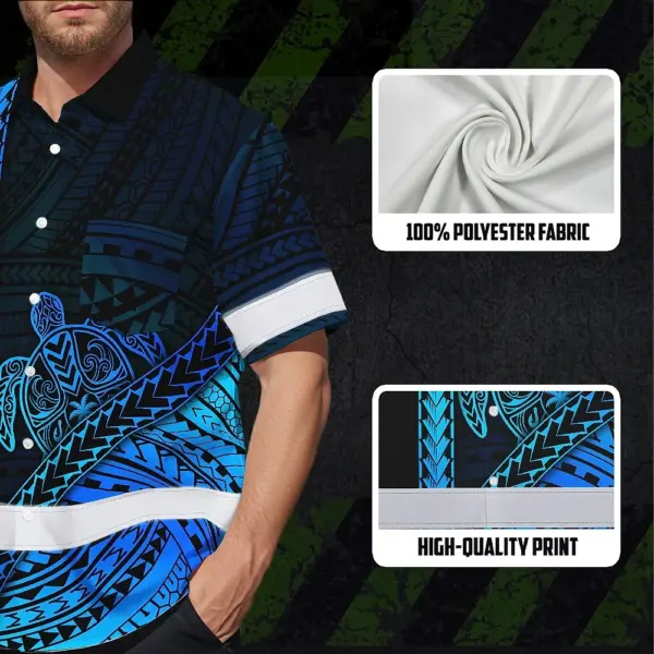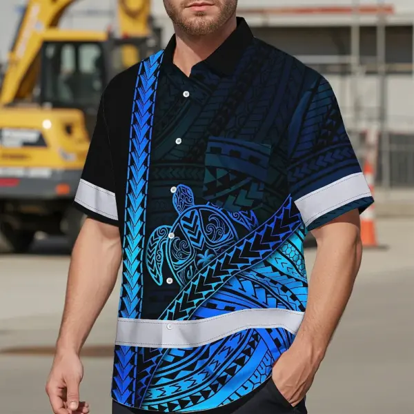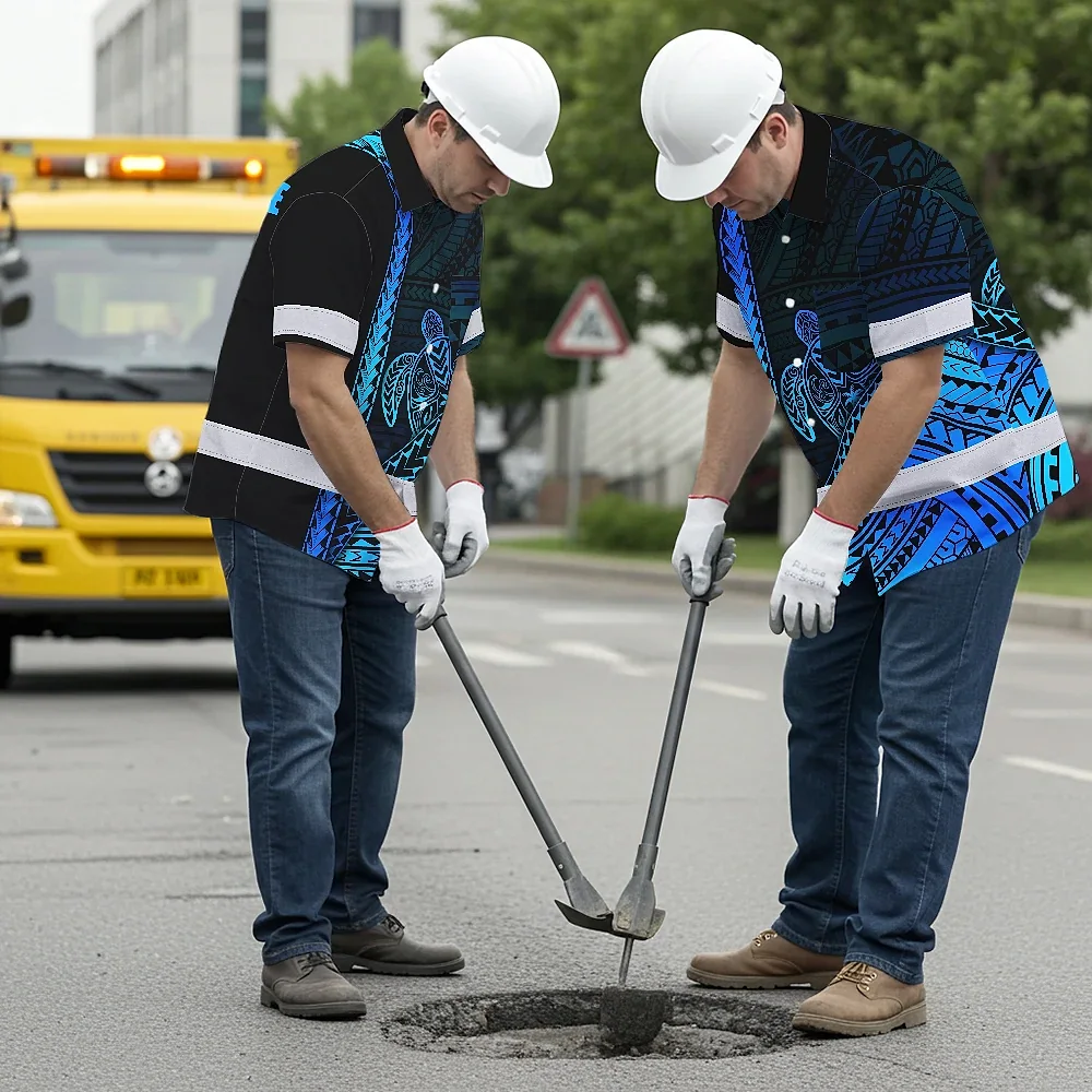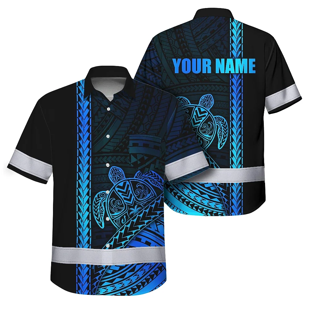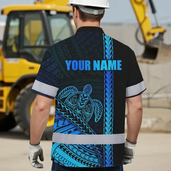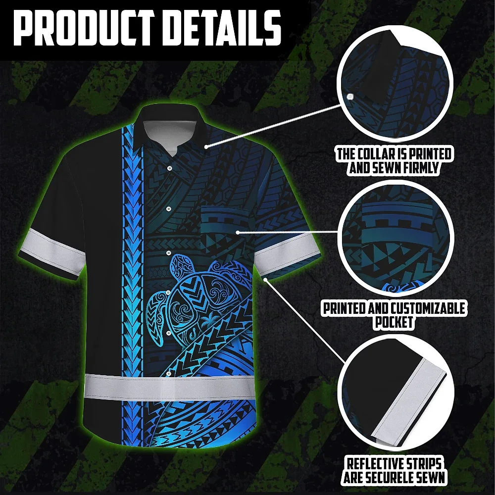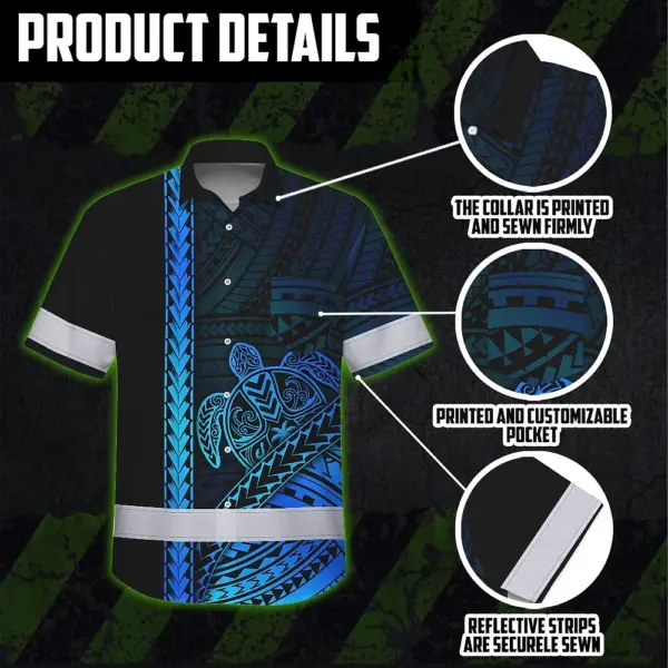 Hi Vis Hawaiian Shirt Reflective Tapes Gradient Blue Neon Polynesian Turtle Custom Name Safety Workwear For Workers, Truckers, Operators