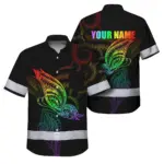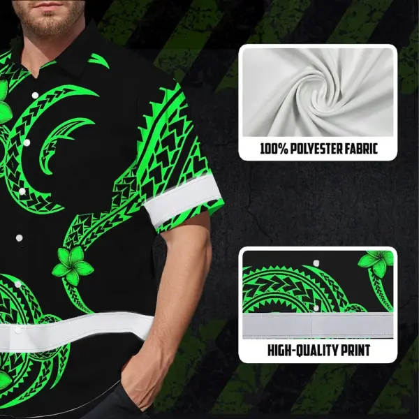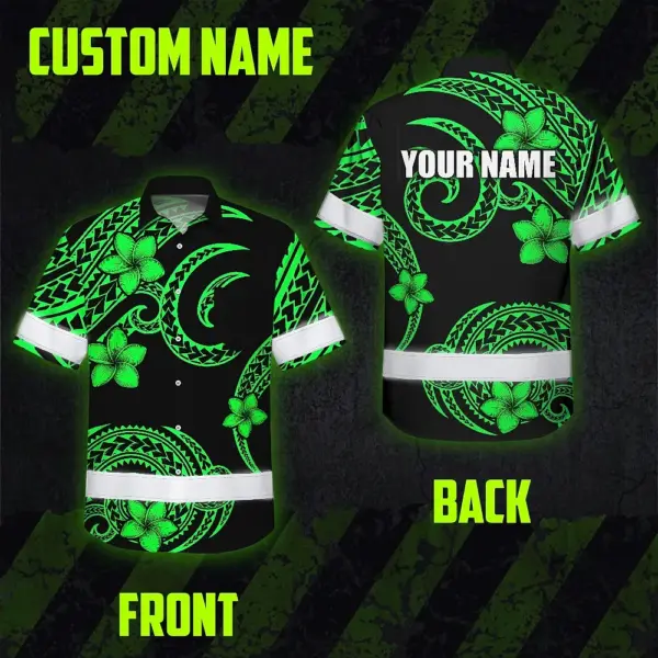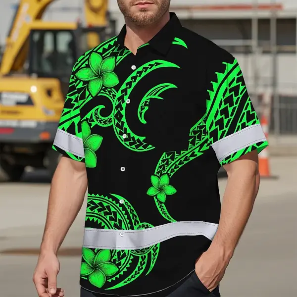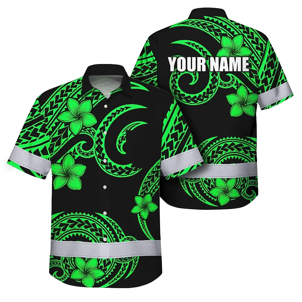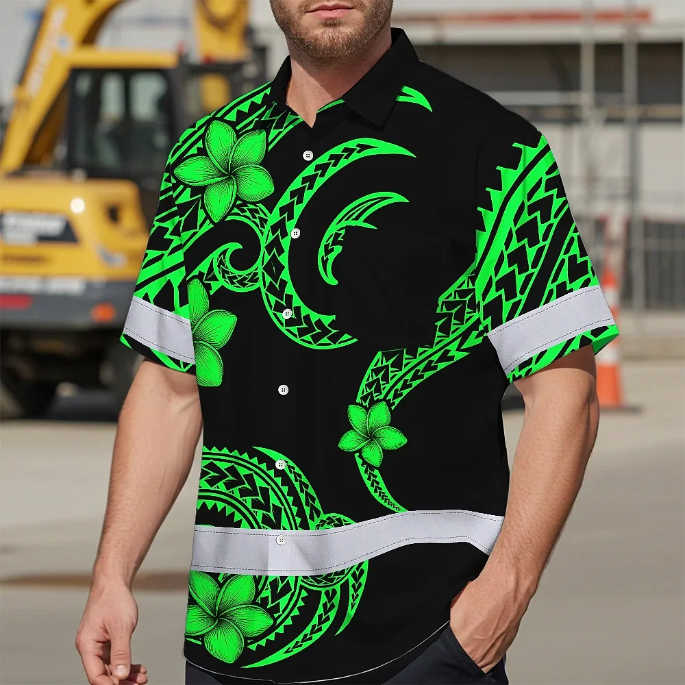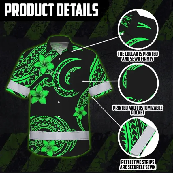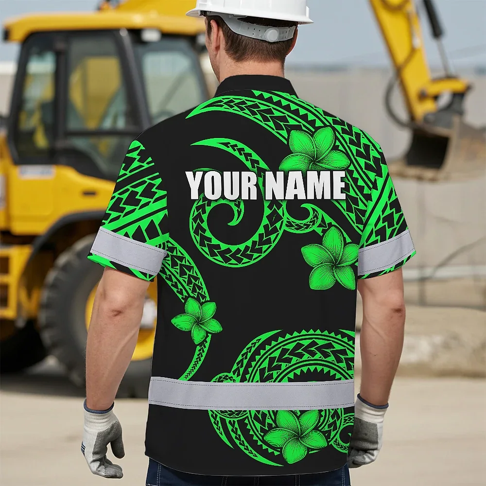 Hi Vis Hawaiian Shirt Reflective Tapes Green Black Polynesian Custom Name Safety Workwear For Workers, Truckers, Operators
