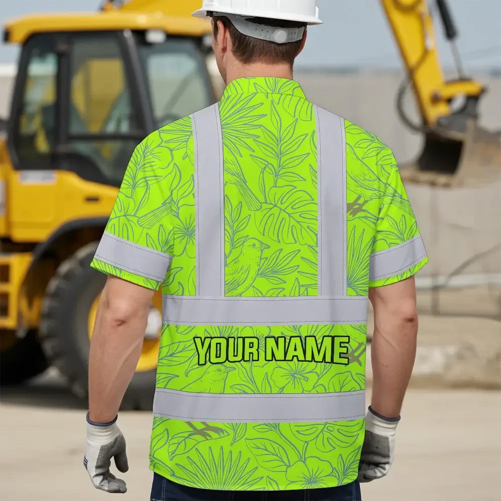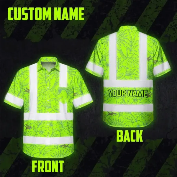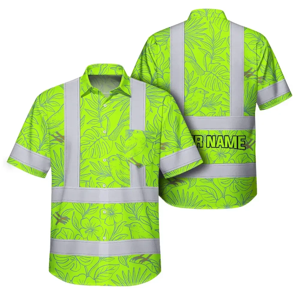 Hi Vis Hawaiian Shirt Reflective Tapes Green Grey Flowers Custom Name Safety Workwear For Workers, Truckers, Operators