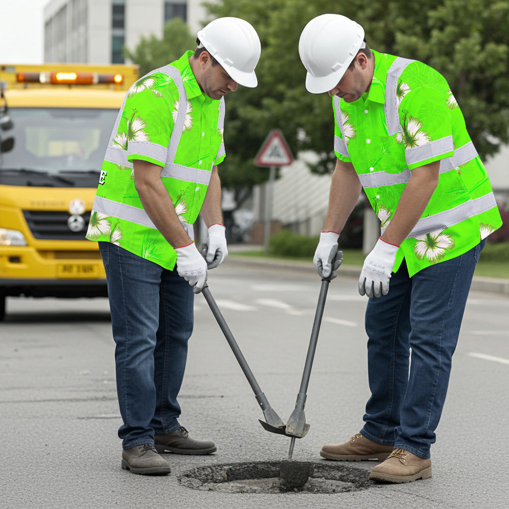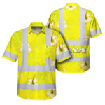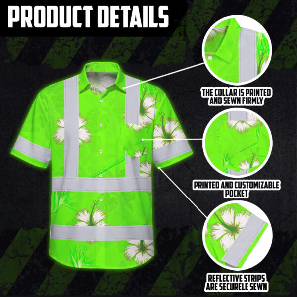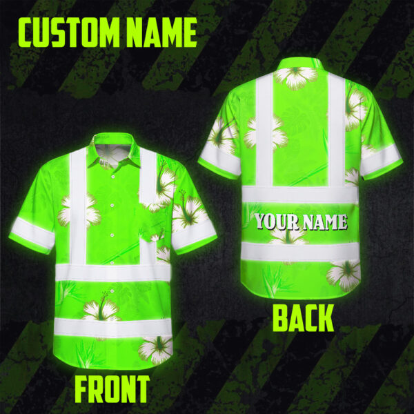 Hi Vis Hawaiian Shirt Reflective Tapes Green Neon Custom Name Safety Workwear For Workers, Truckers, Operators