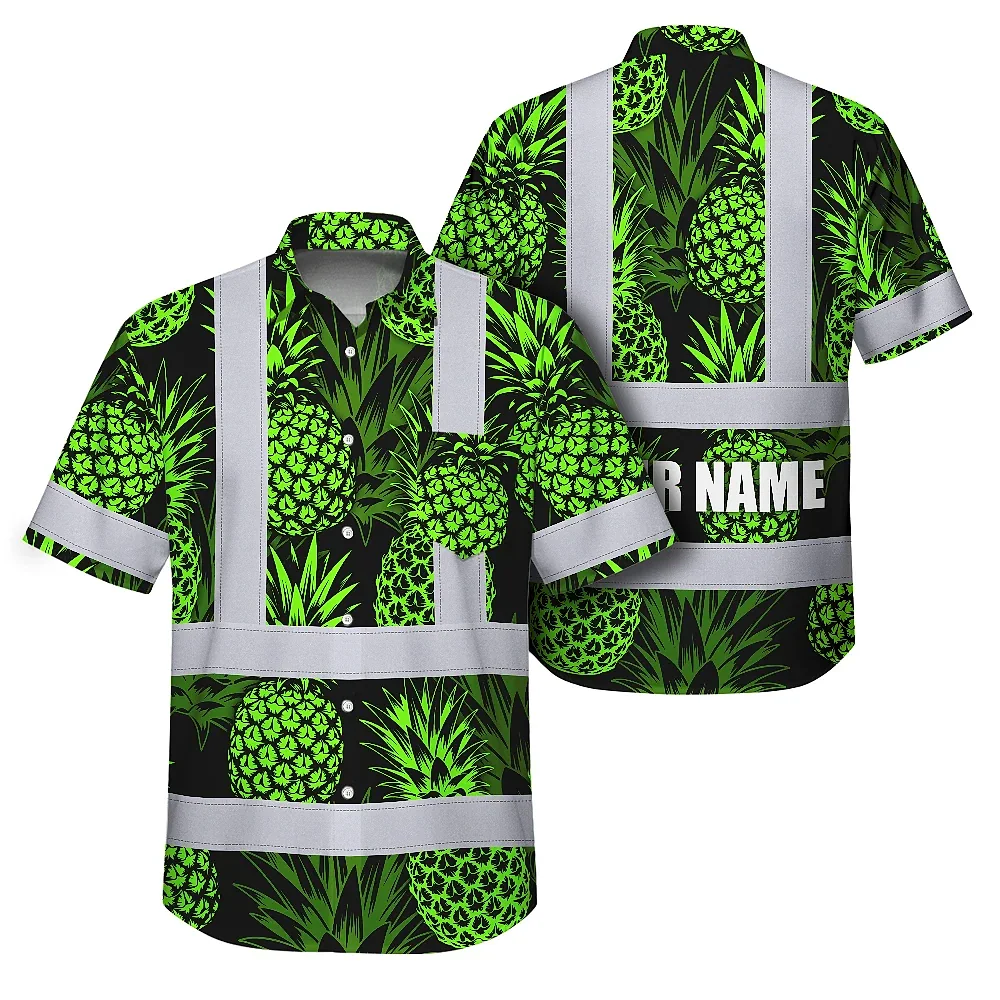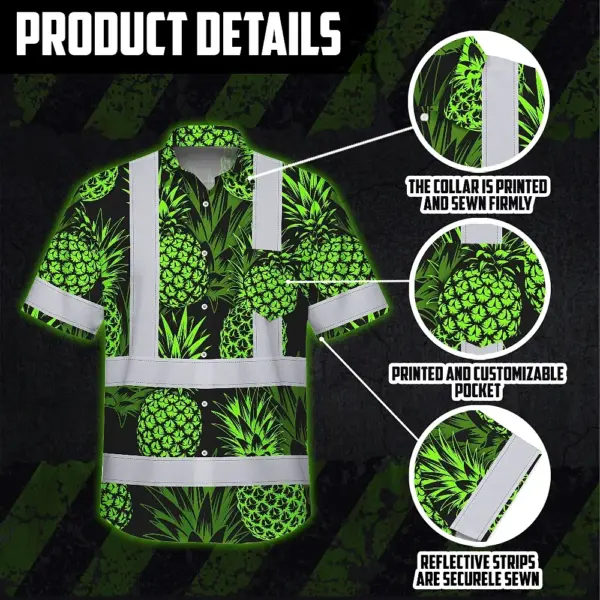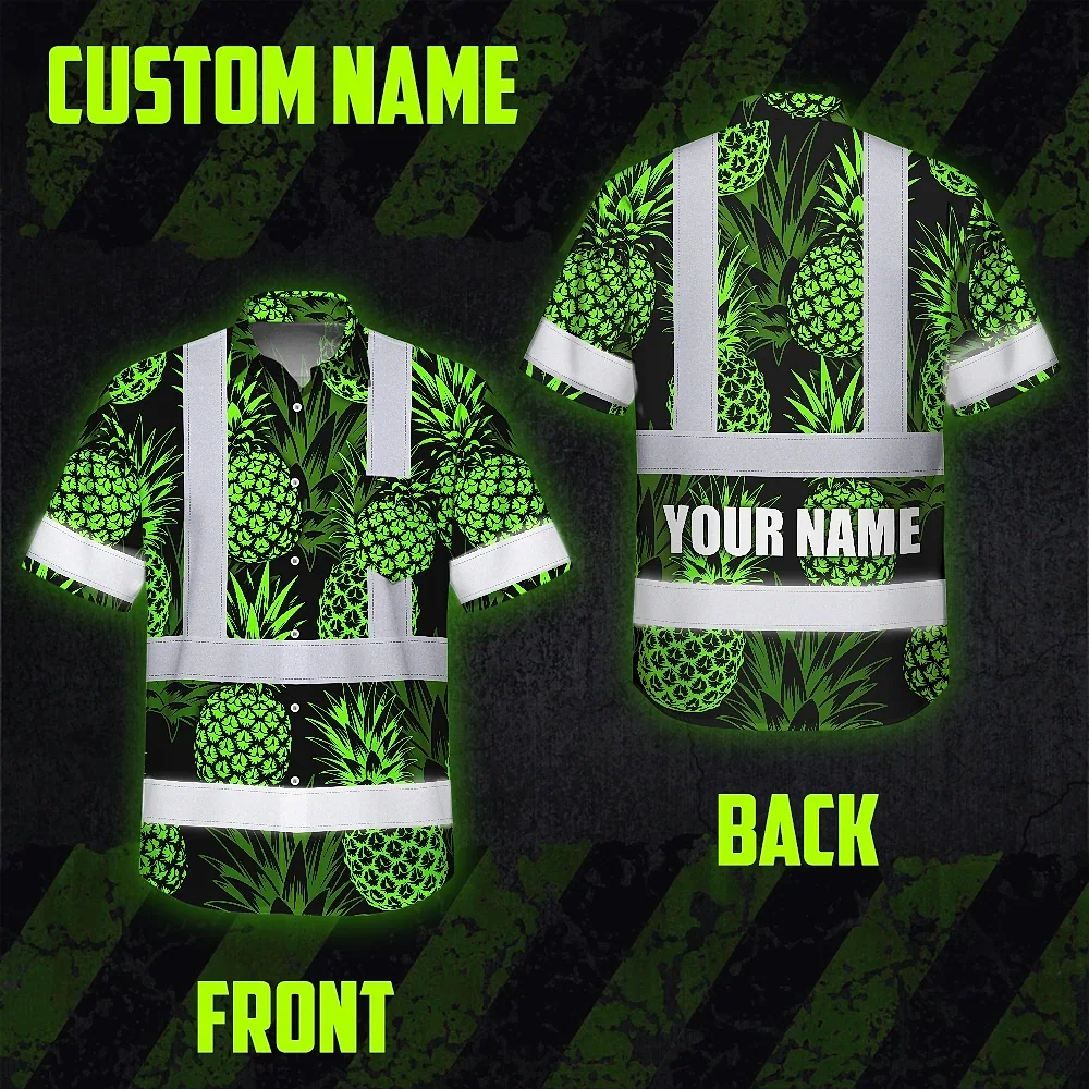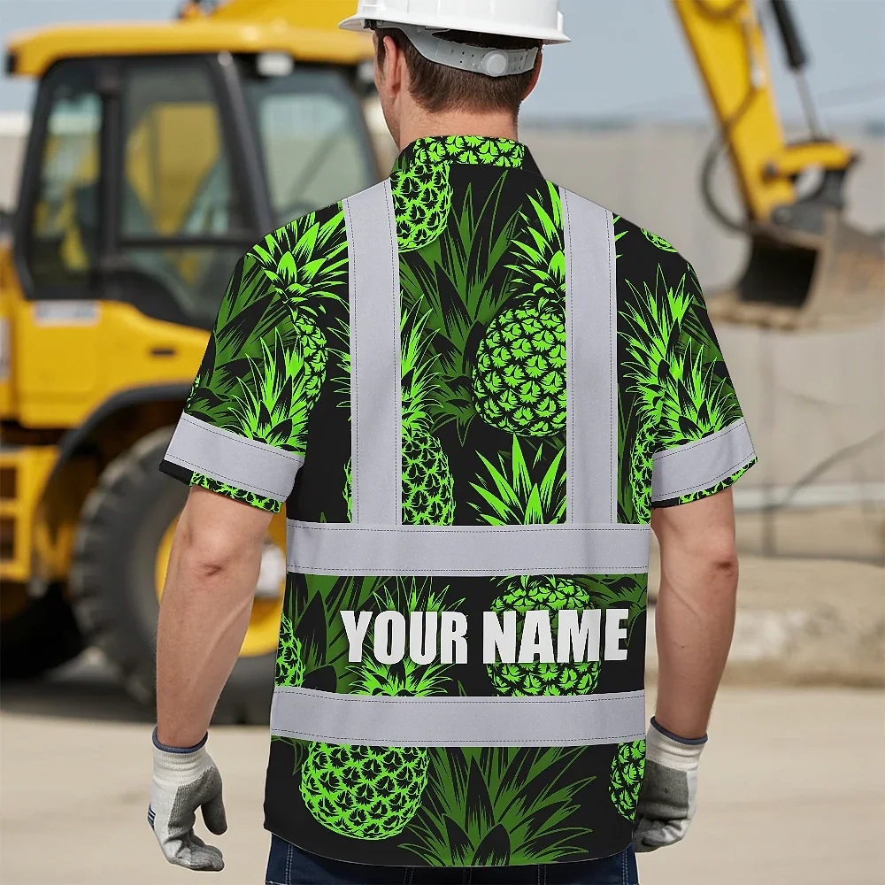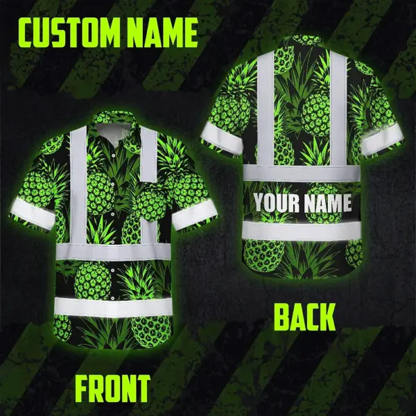 Hi Vis Hawaiian Shirt Reflective Tapes Green Neon Pineapple Custom Name Safety Workwear For Workers, Truckers, Operators