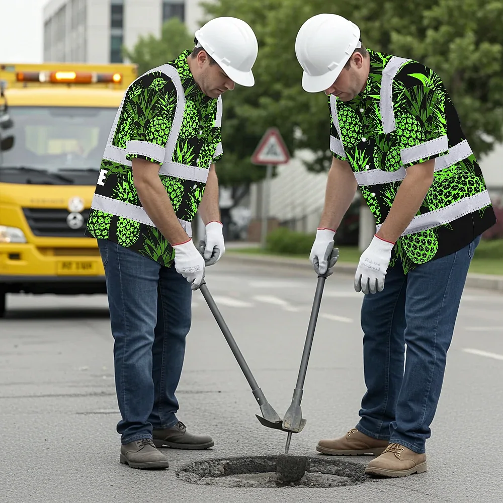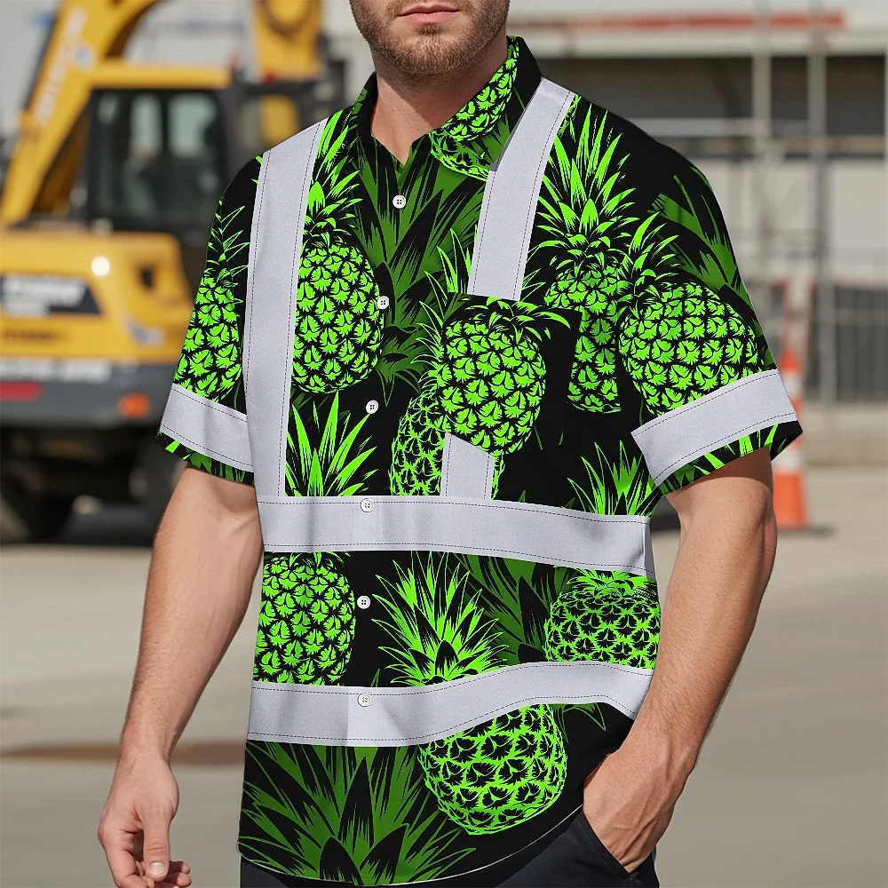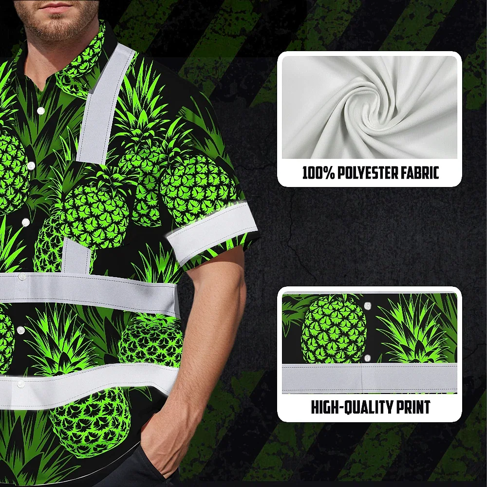 Hi Vis Hawaiian Shirt Reflective Tapes Green Neon Pineapple Custom Name Safety Workwear For Workers, Truckers, Operators