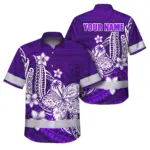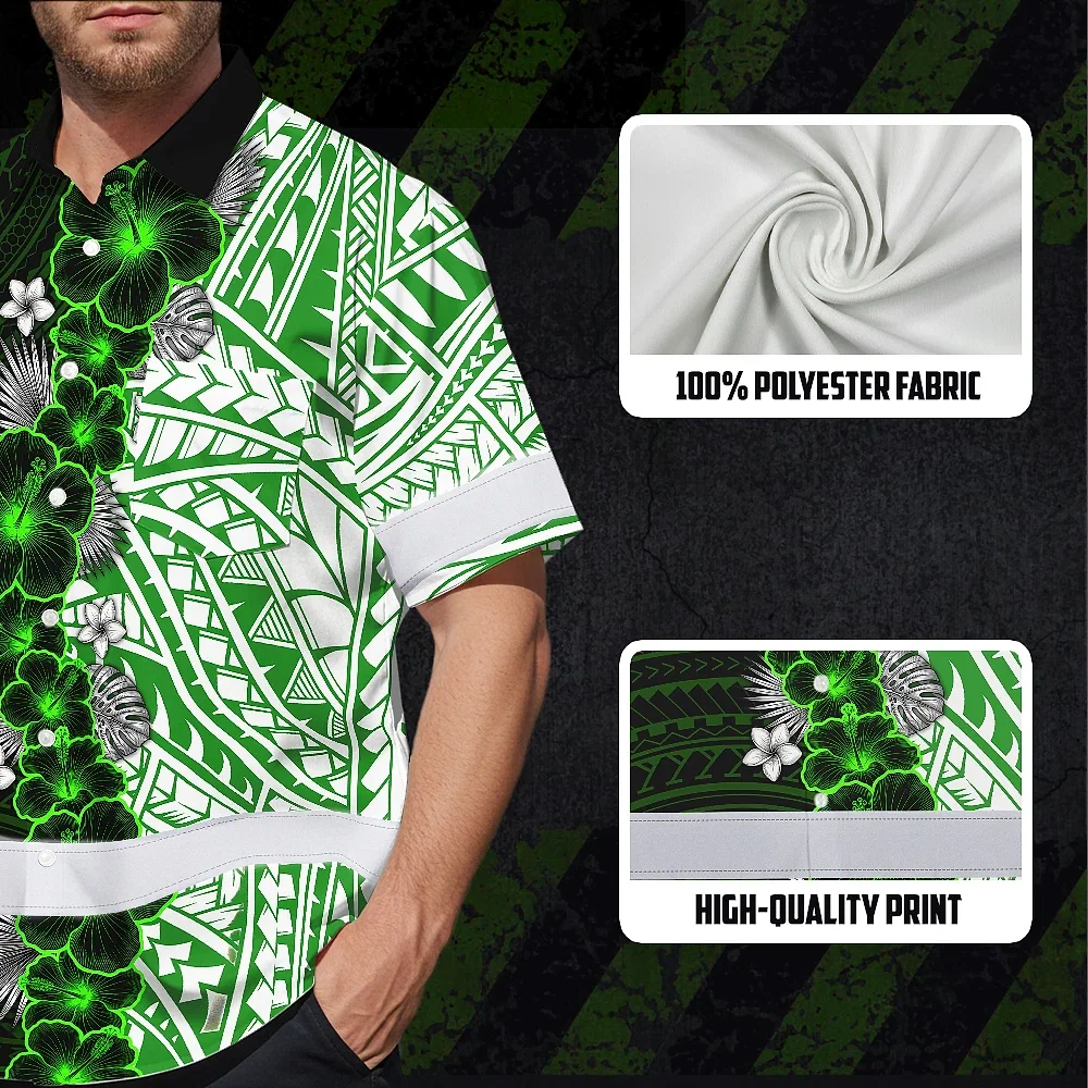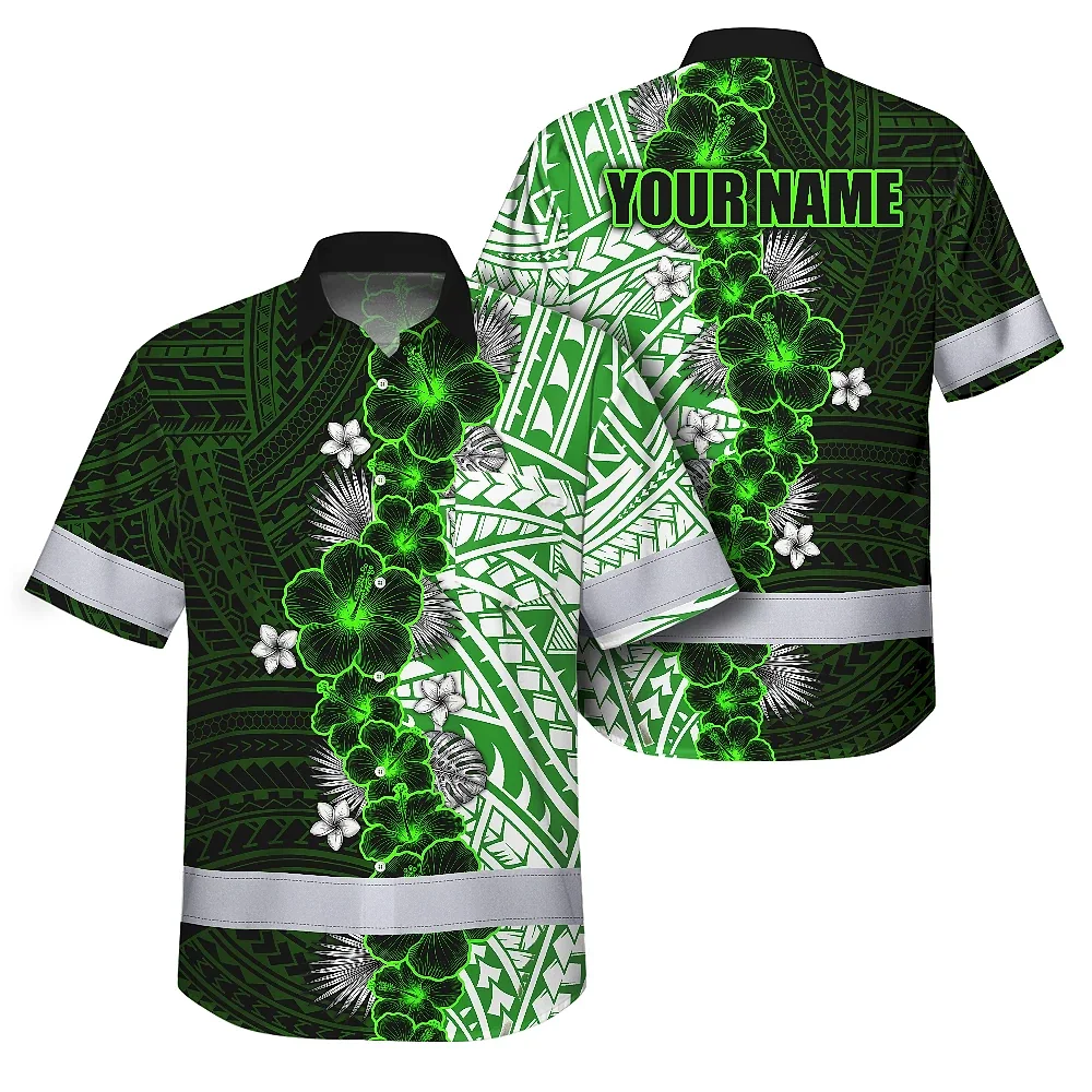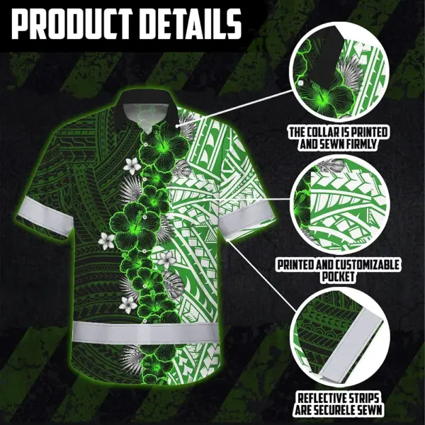 Hi Vis Hawaiian Shirt Reflective Tapes Green Neon Polynesian Tribal Flowers Custom Name Safety Workwear For Workers, Truckers, Operators