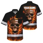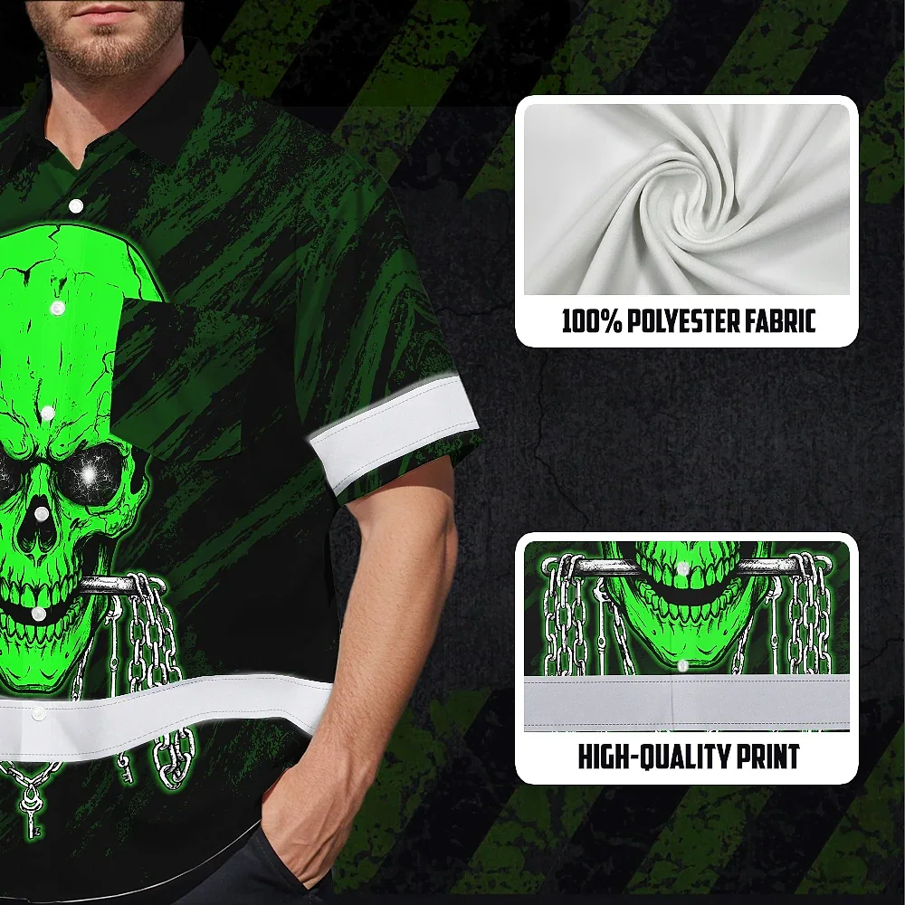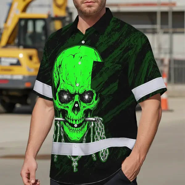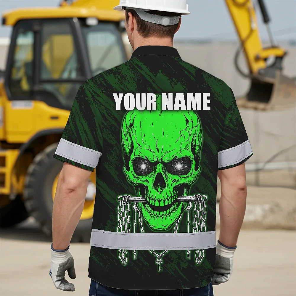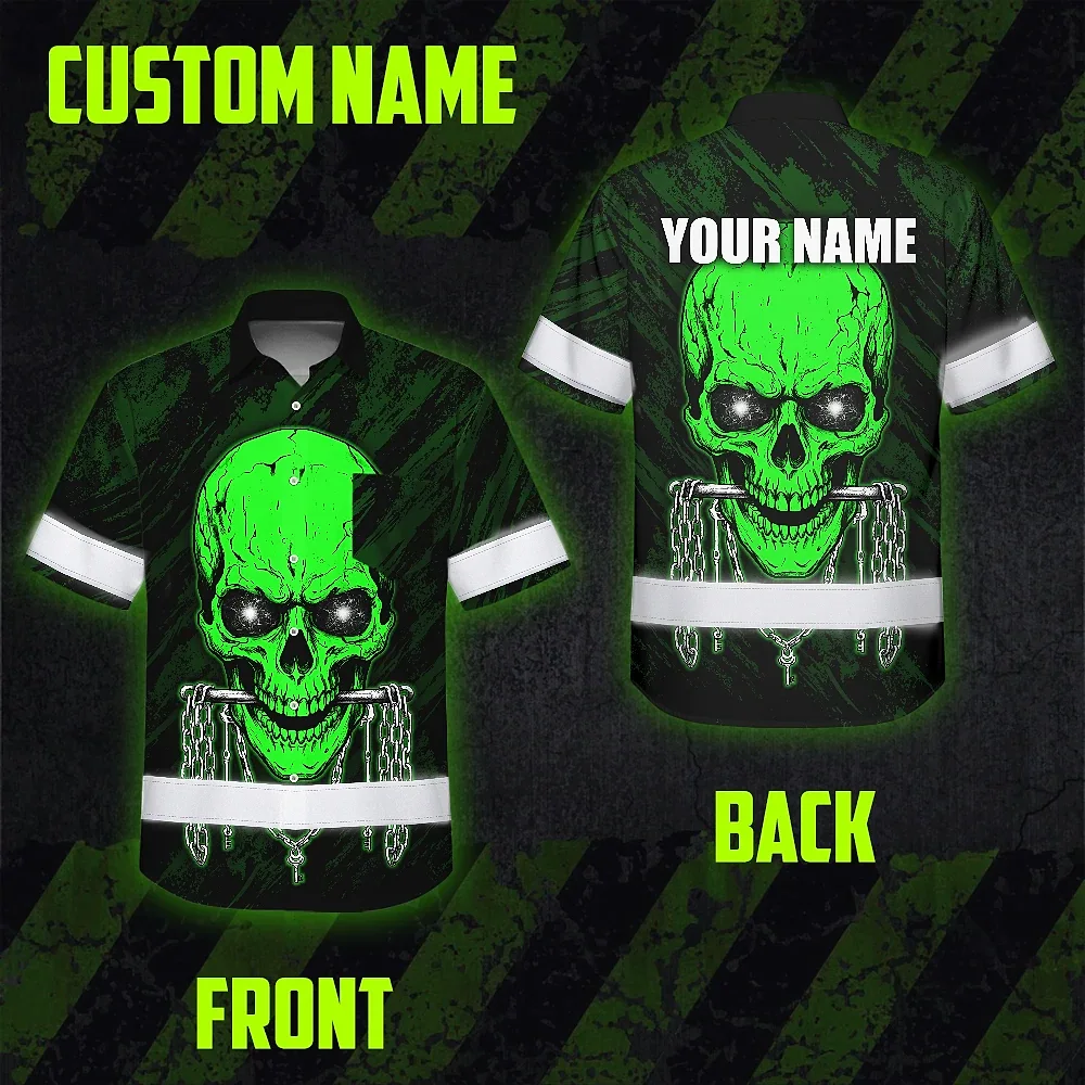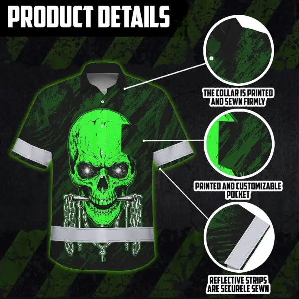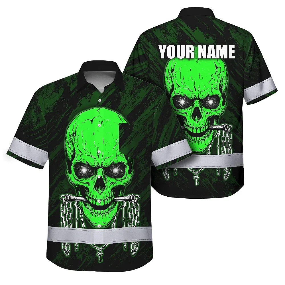 Hi Vis Hawaiian Shirt Reflective Tapes Green Neon Skull Chain Custom Name Safety Workwear For Workers, Truckers, Operators