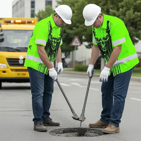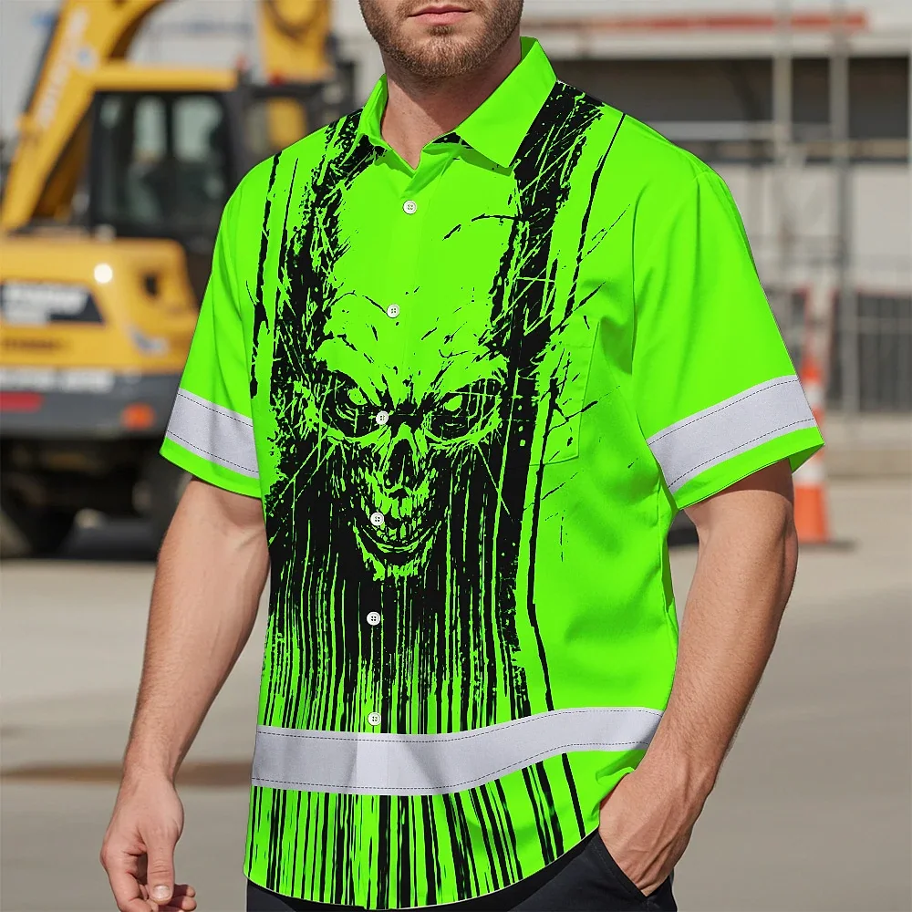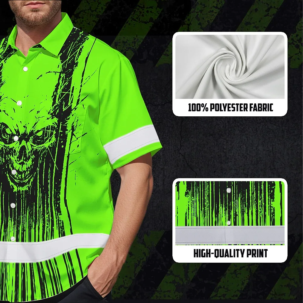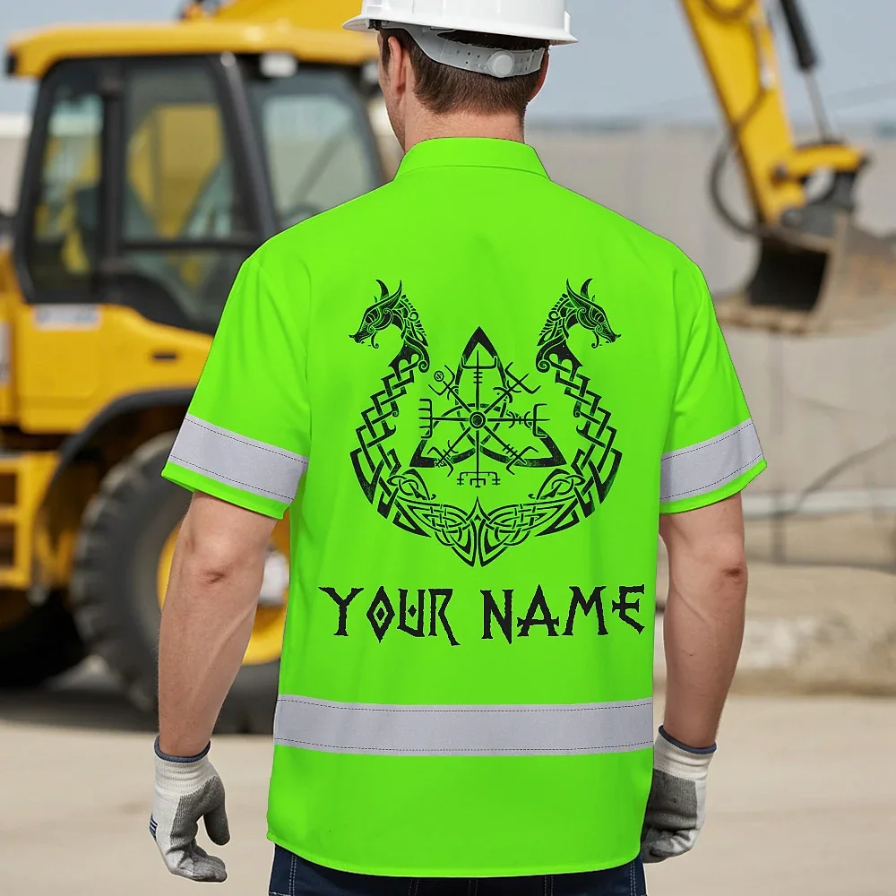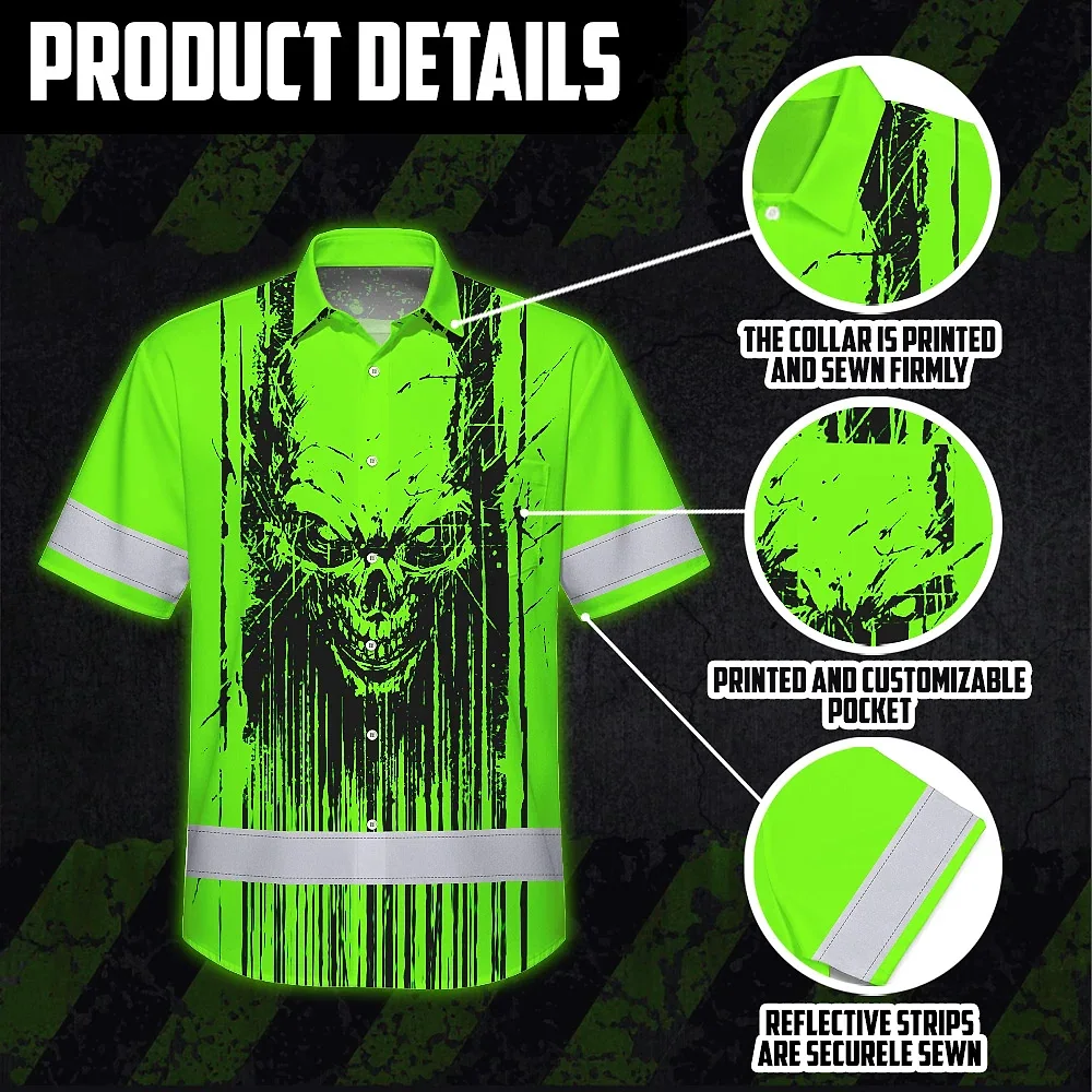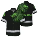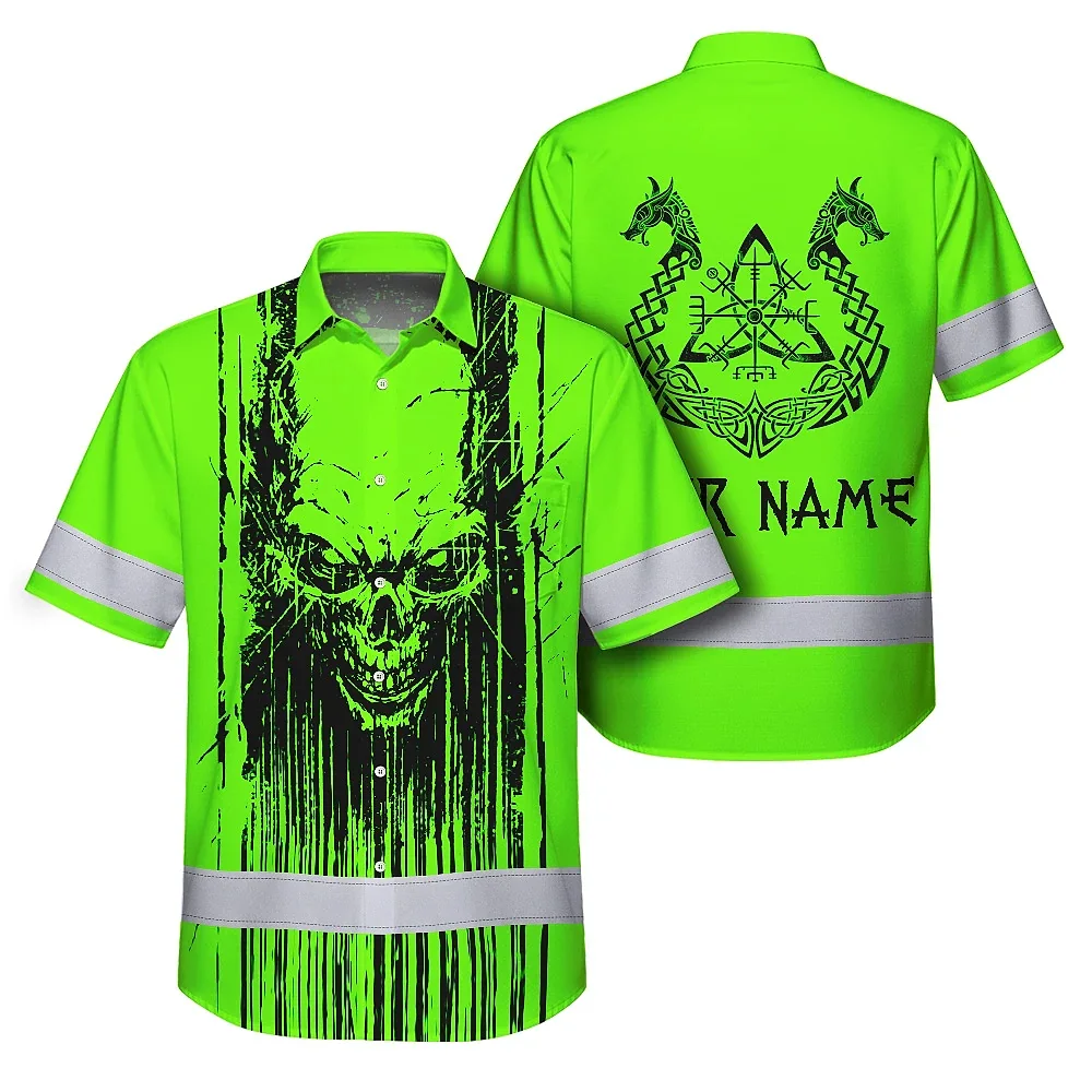 Hi Vis Hawaiian Shirt Reflective Tapes Green Neon Skull Viking Symbol Custom Name Safety Workwear For Workers, Truckers, Operators