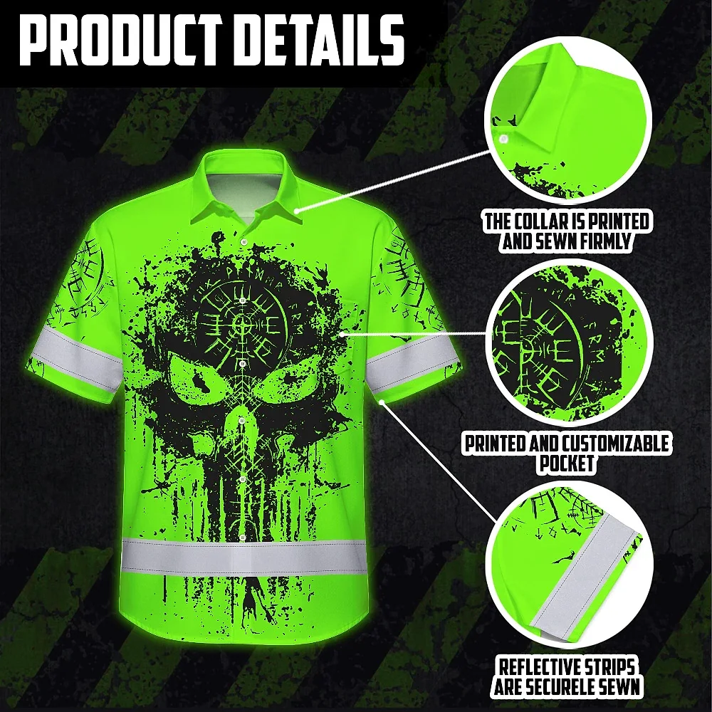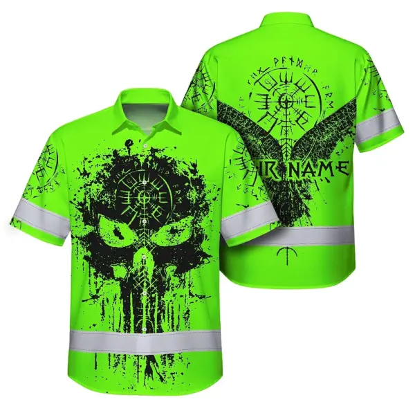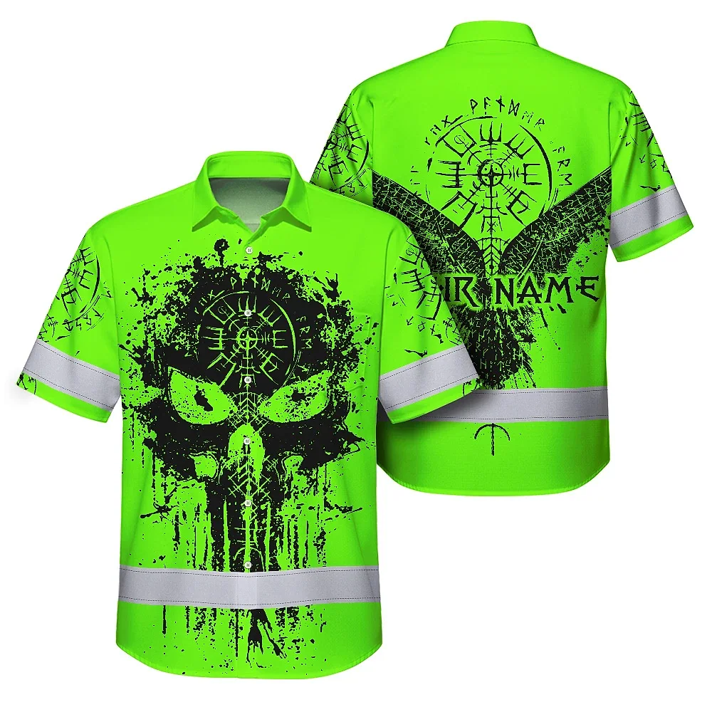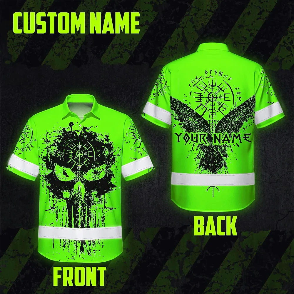 Hi Vis Hawaiian Shirt Reflective Tapes Green Neon Skull Viking Symbol Raven Custom Name For Workers, Runners, Truckers, Skull Lovers