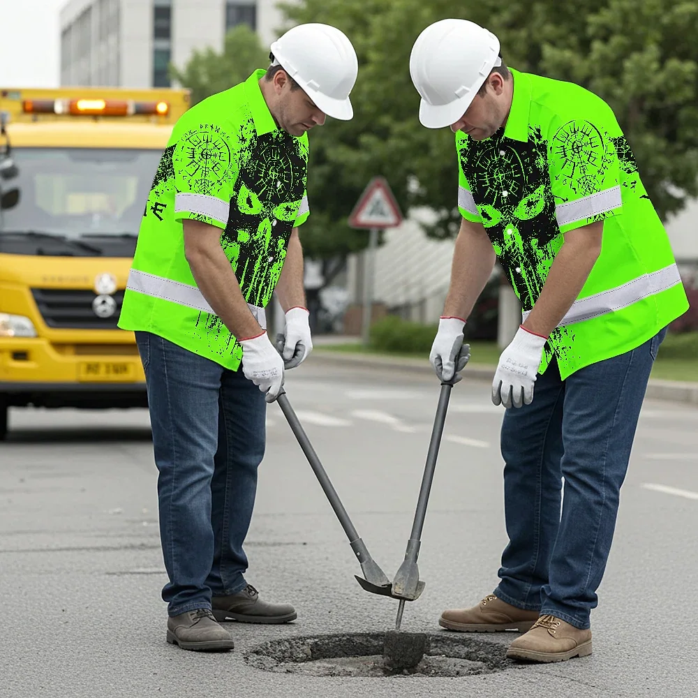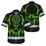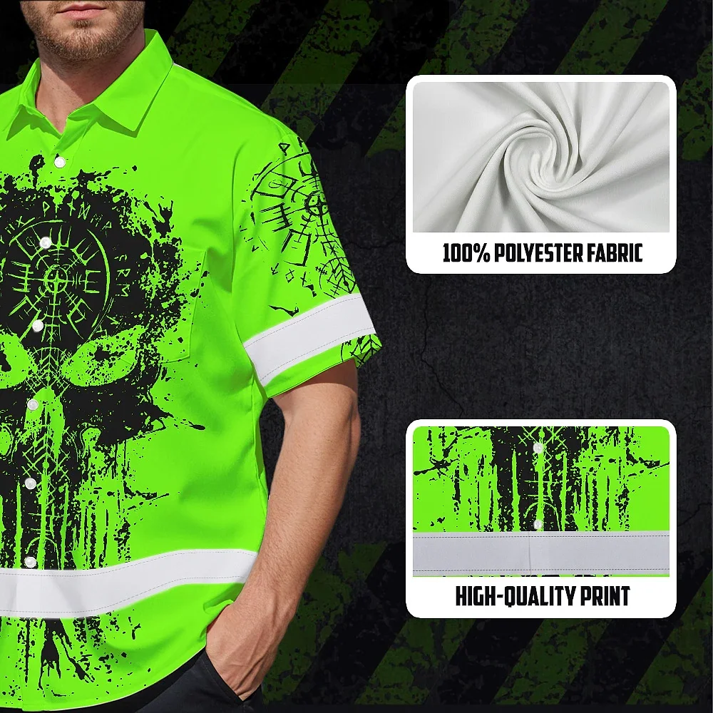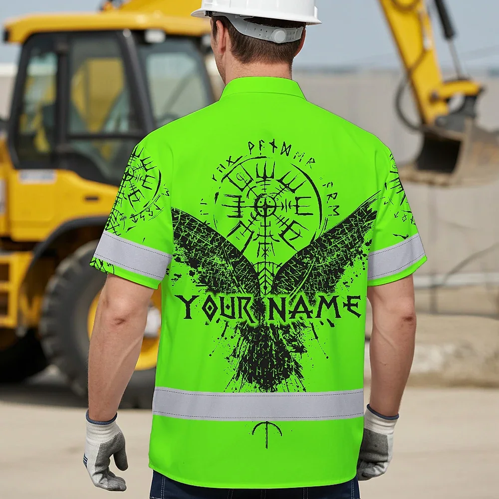 Hi Vis Hawaiian Shirt Reflective Tapes Green Neon Skull Viking Symbol Raven Custom Name For Workers, Runners, Truckers, Skull Lovers