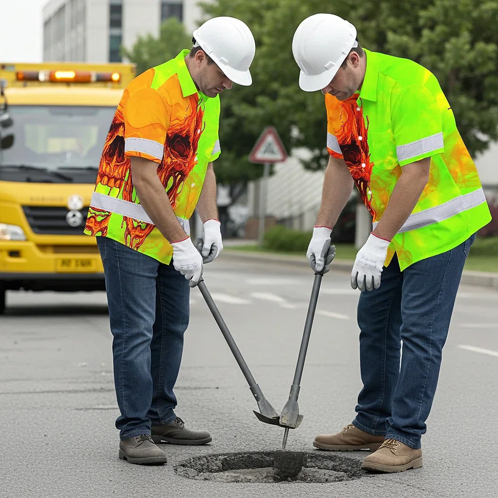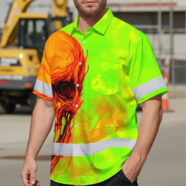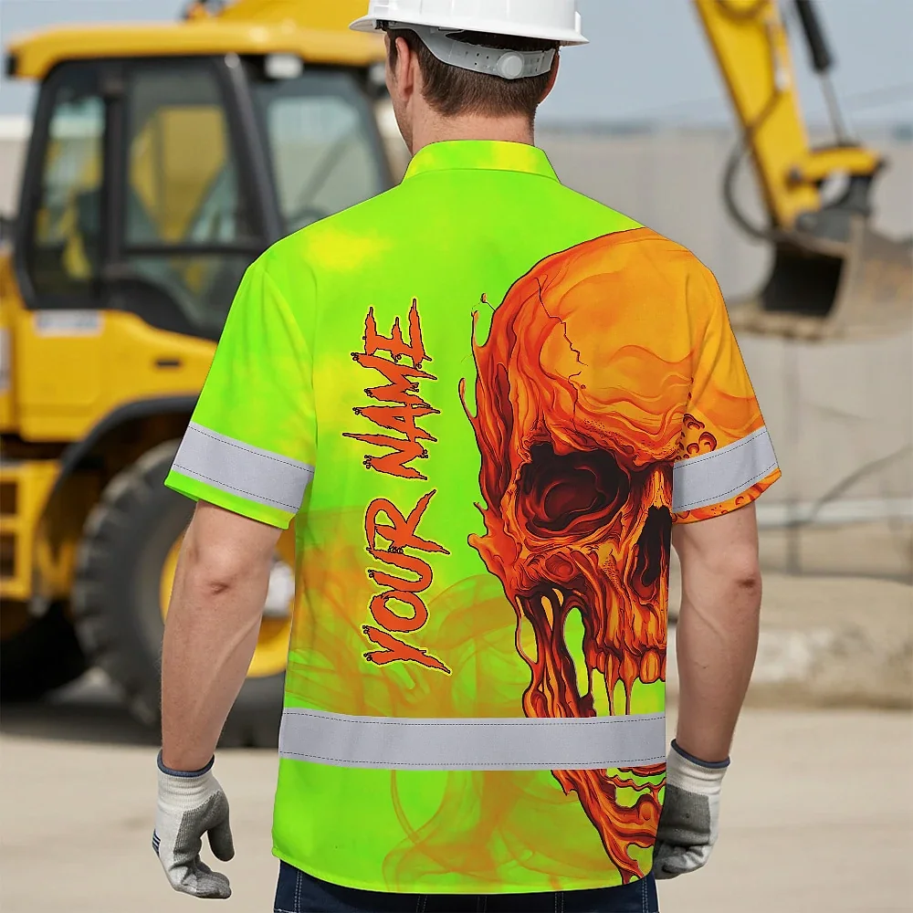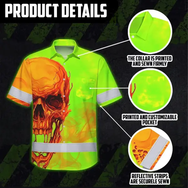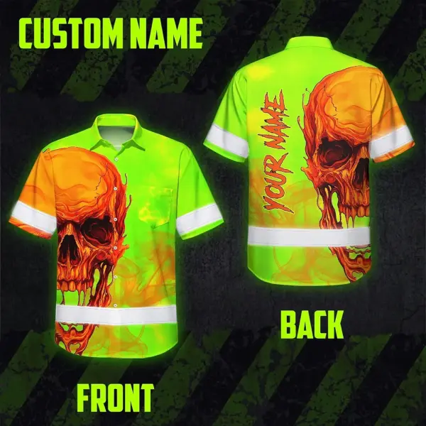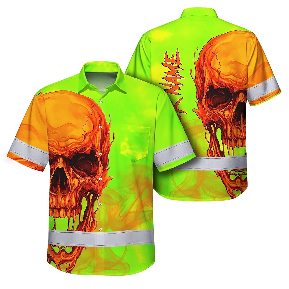 Hi Vis Hawaiian Shirt Reflective Tapes Green Orange Skull Custom Name Safety Workwear For Workers, Truckers, Operators