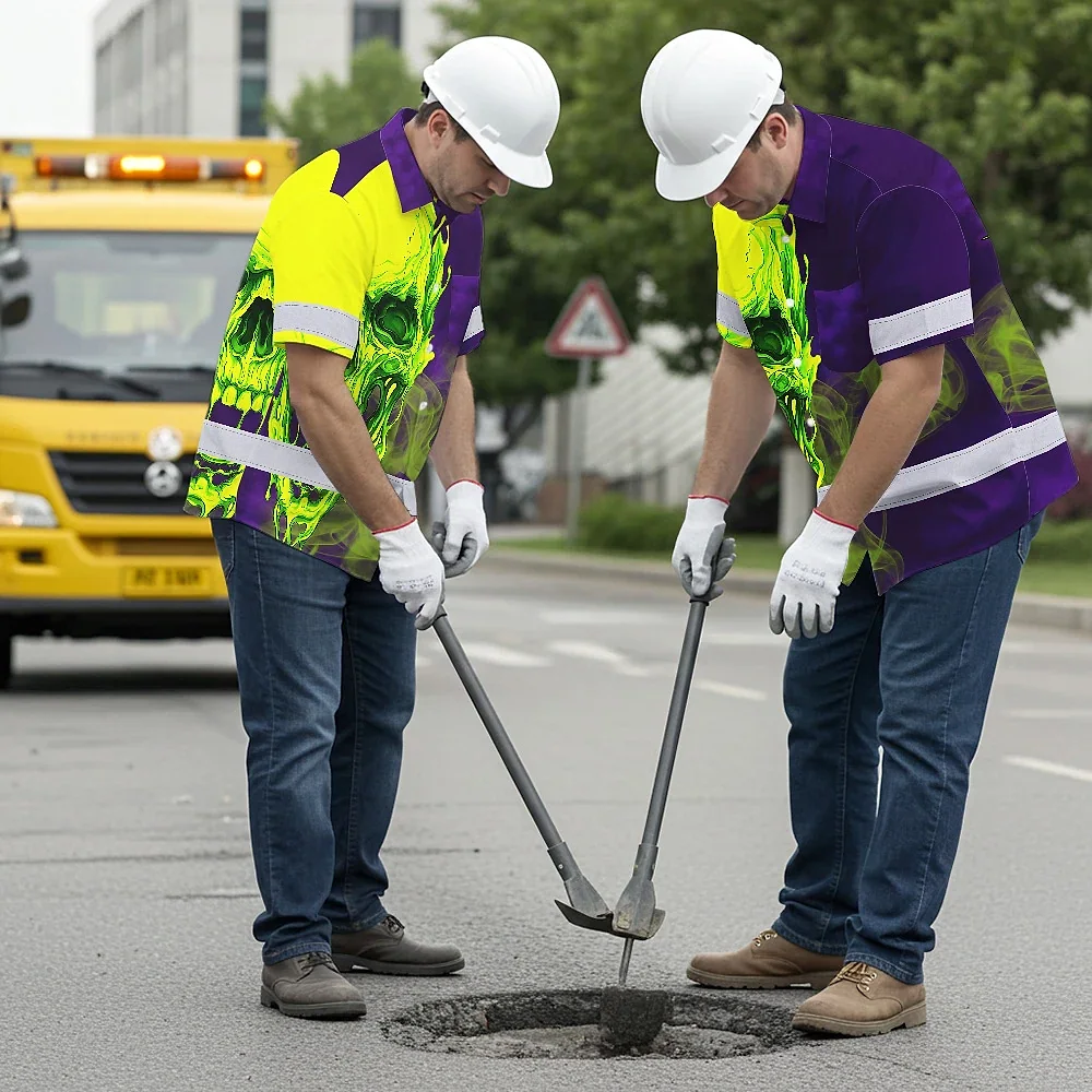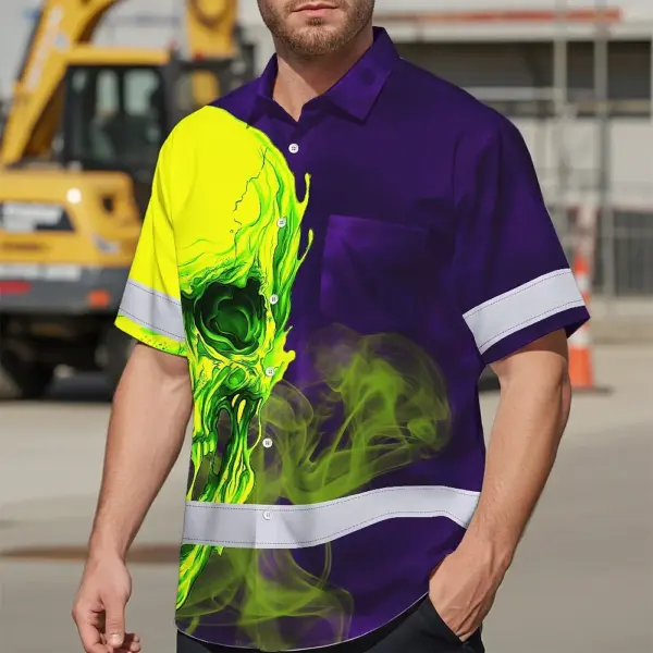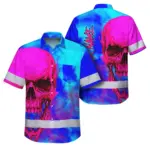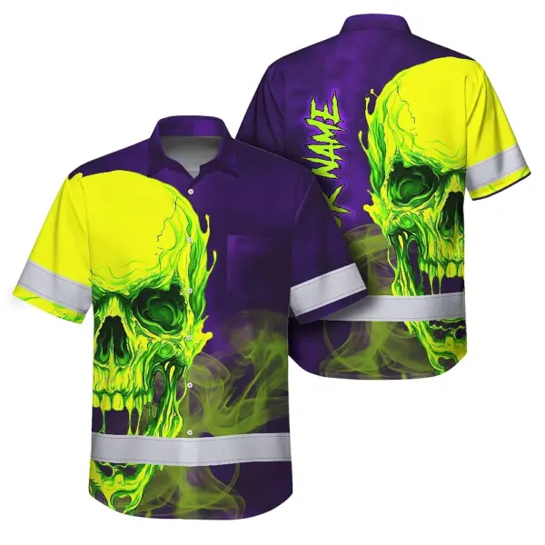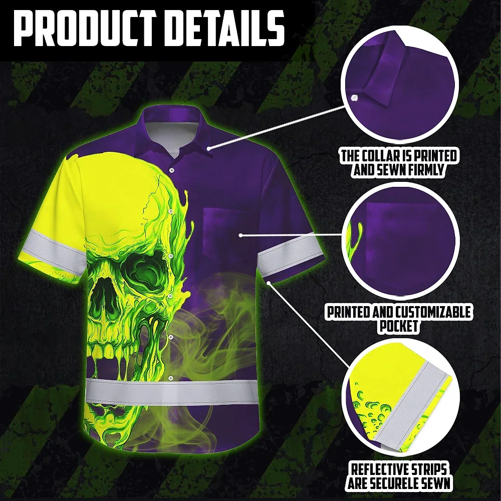 Hi Vis Hawaiian Shirt Reflective Tapes Green Violet Skull Custom Name Safety Workwear For Workers, Truckers, Operators