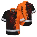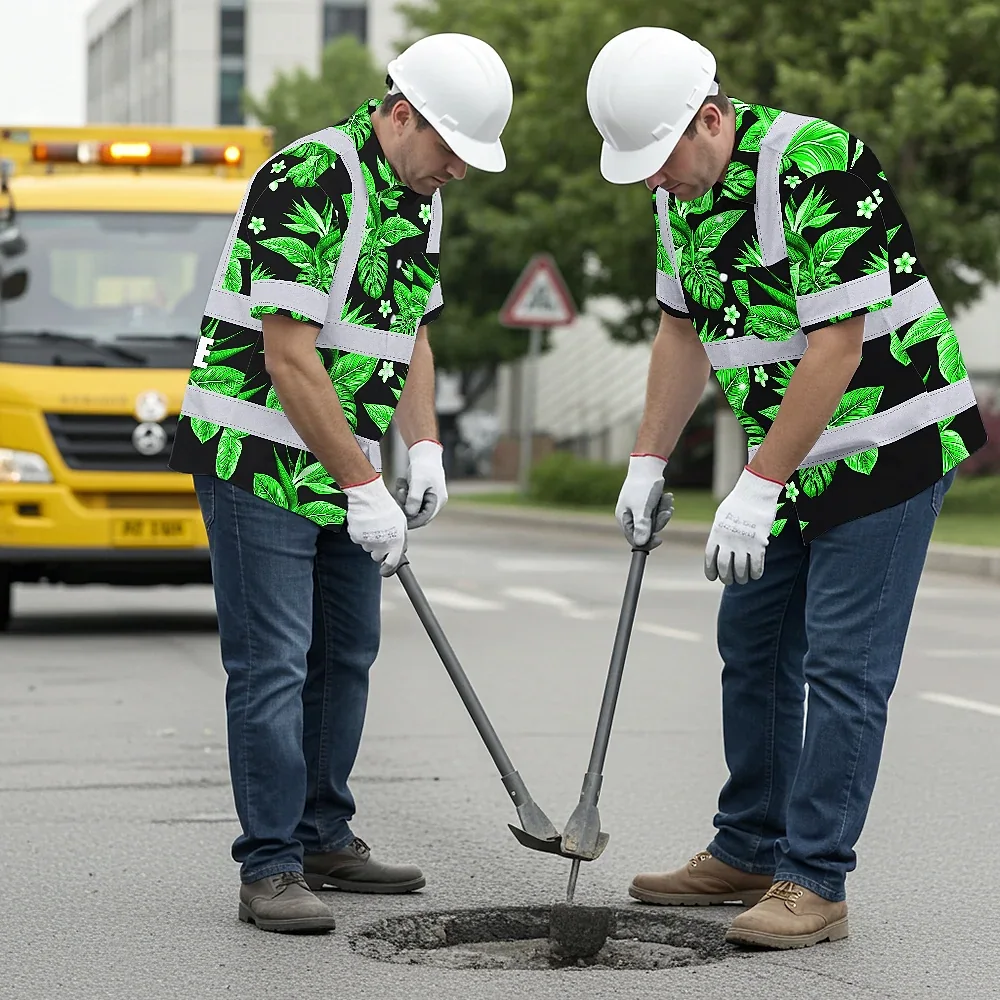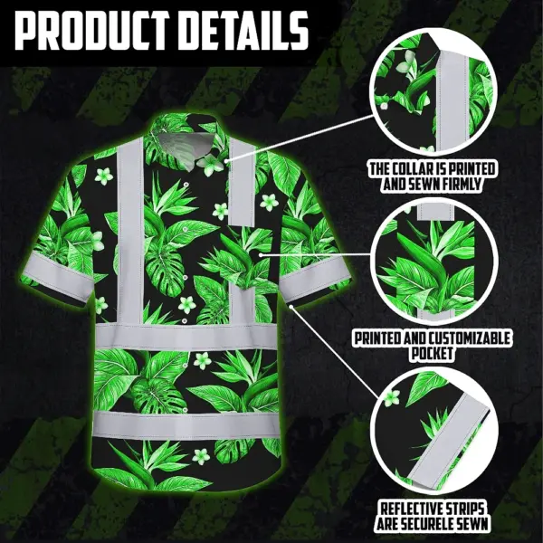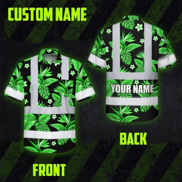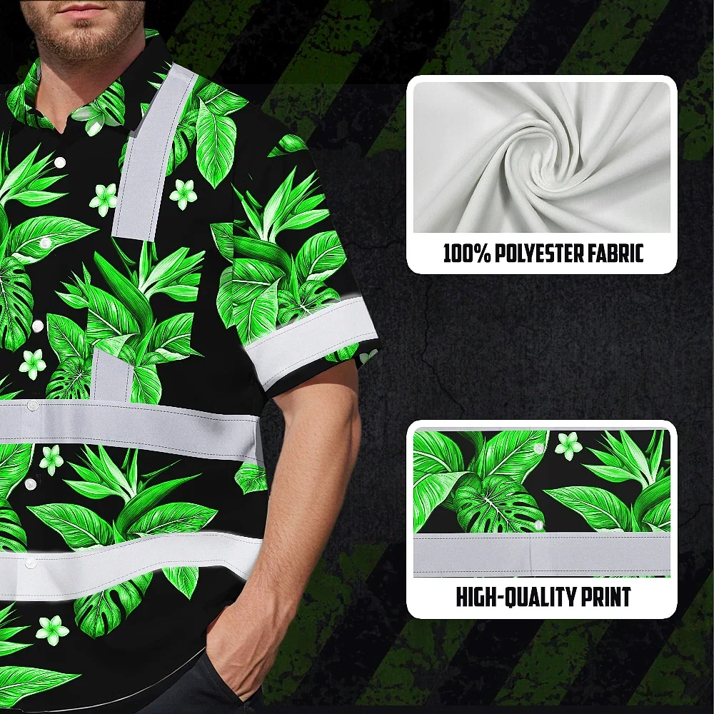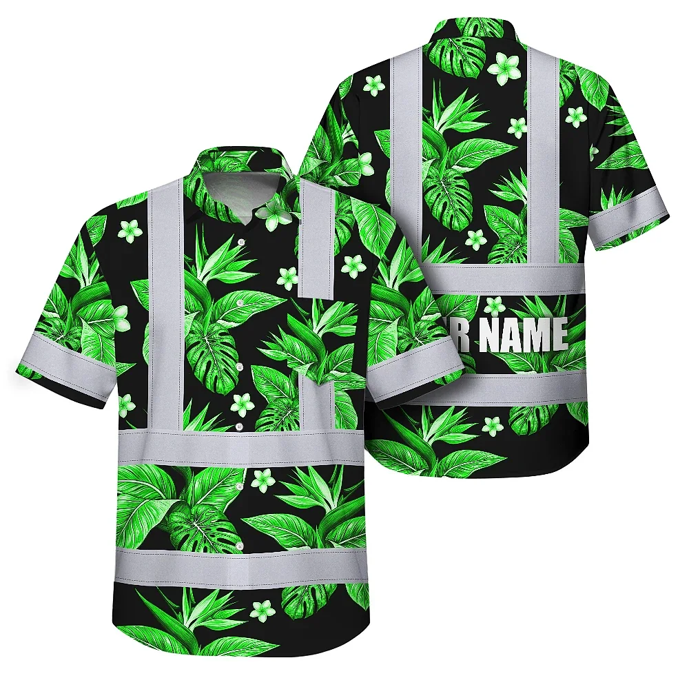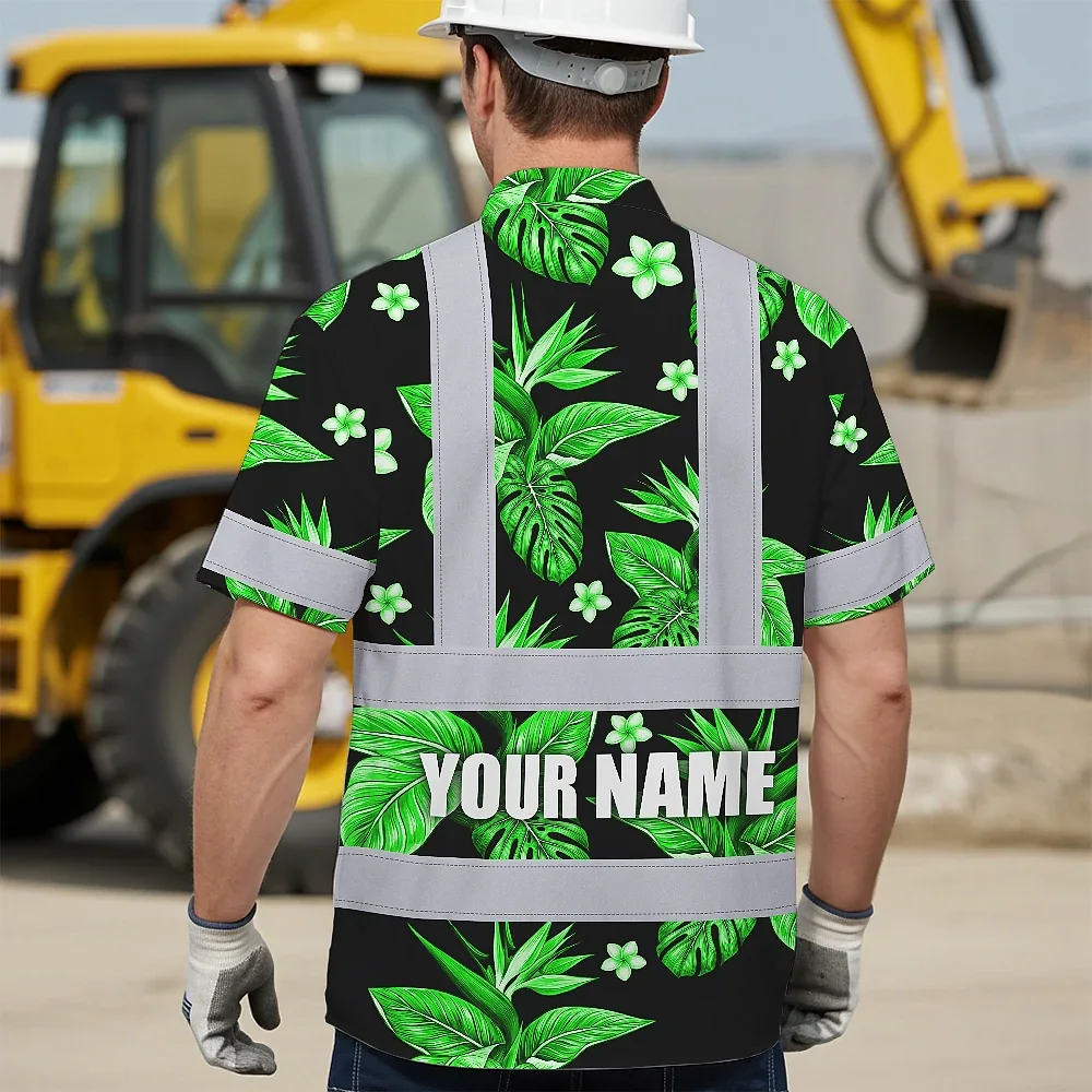 Hi Vis Hawaiian Shirt Reflective Tapes Green White Bird of Paradise Custom Name Safety Workwear For Workers, Truckers, Operators