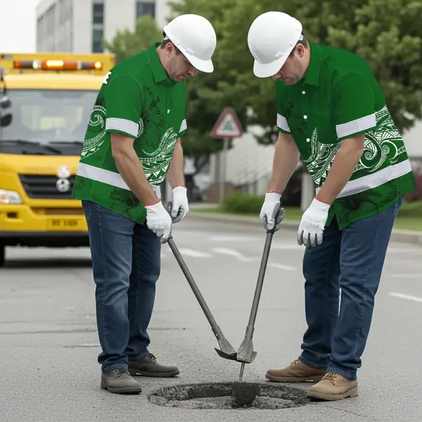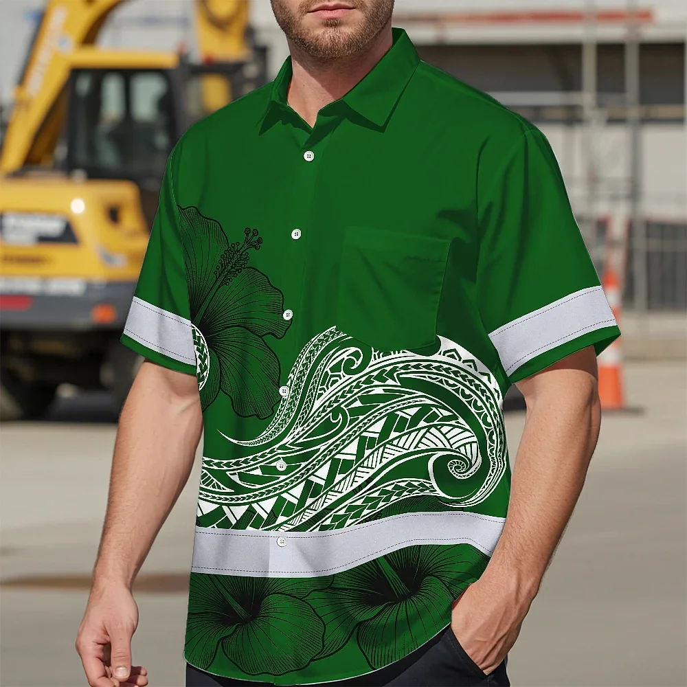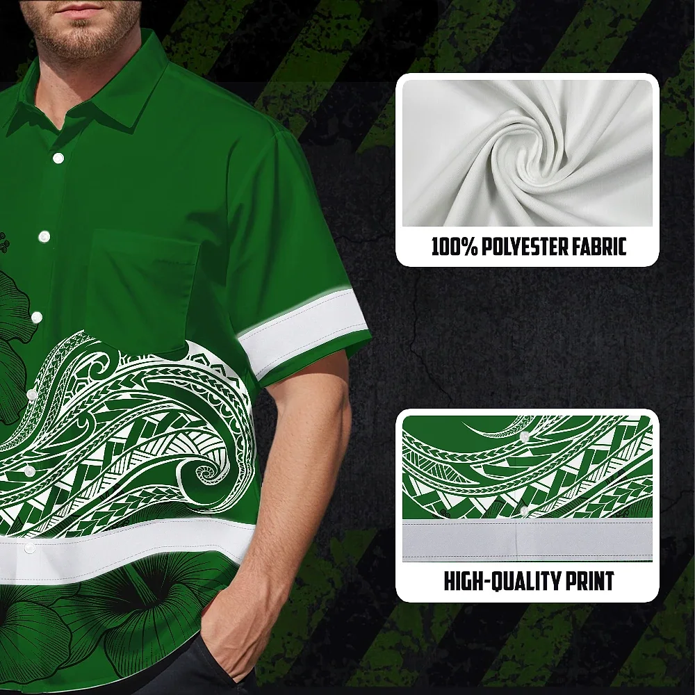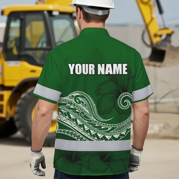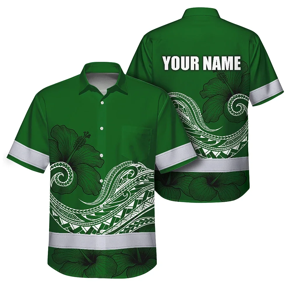 Hi Vis Hawaiian Shirt Reflective Tapes Green White Polynesian Custom Name Safety Workwear For Workers, Truckers, Operators