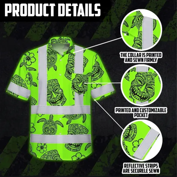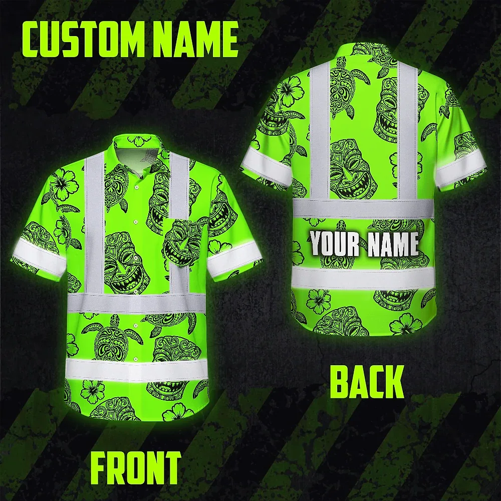 Hi Vis Hawaiian Shirt Reflective Tapes Lime Neon Tiki Custom Name Safety Workwear For Workers, Truckers, Operators