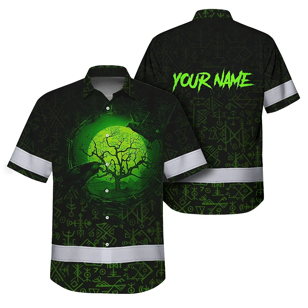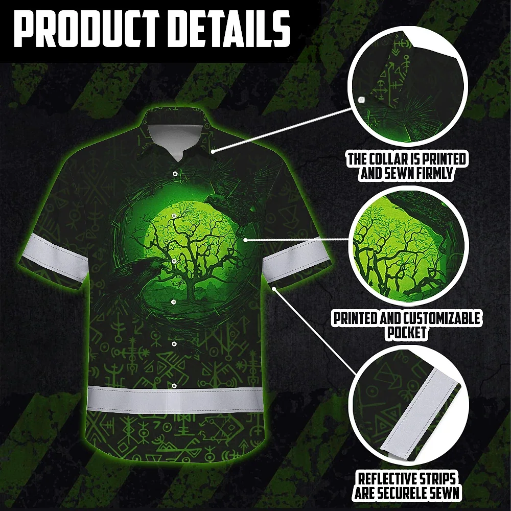 Hi Vis Hawaiian Shirt Reflective Tapes Moon Raven Viking Symbol Green Neon Custom Name Safety Workwear