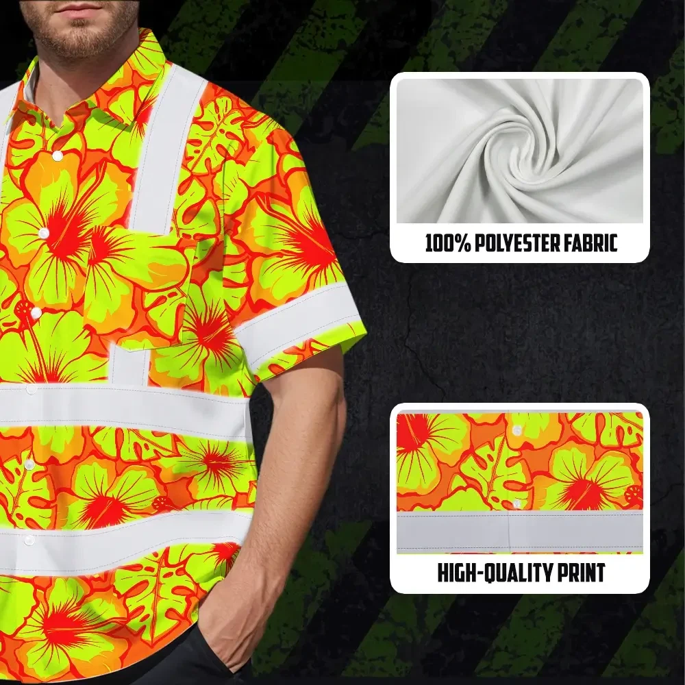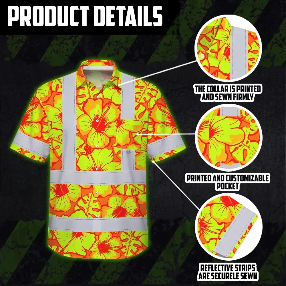 Hi Vis Hawaiian Shirt Reflective Tapes Orange Neon And Yellow Flowers Custom Name Safety Workwear For Workers, Truckers, Operators