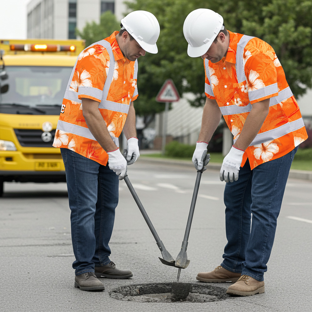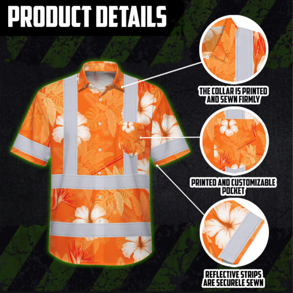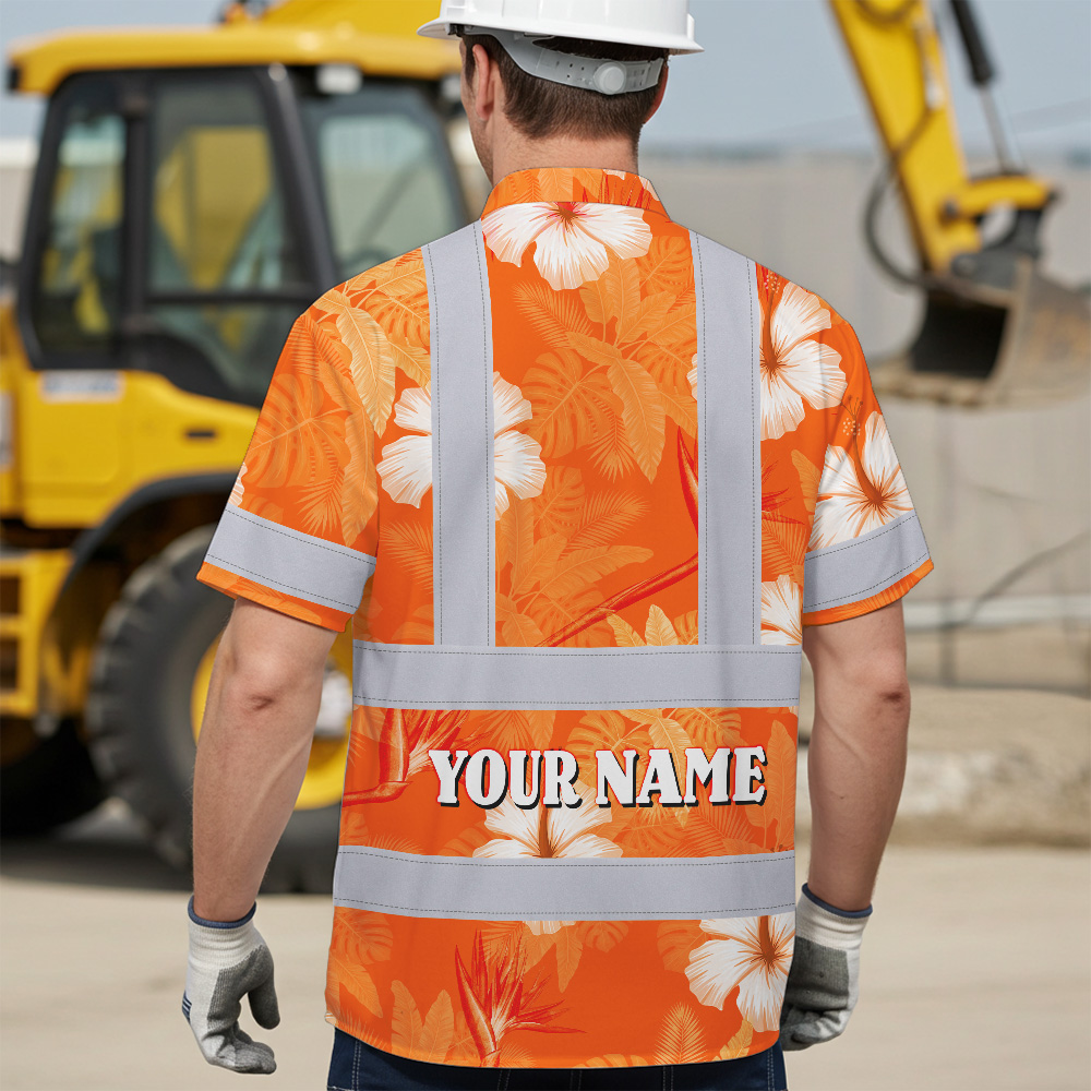 Hi Vis Hawaiian Shirt Reflective Tapes Orange Neon Custom Name Safety Workwear For Workers, Truckers, Operators