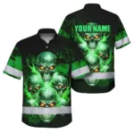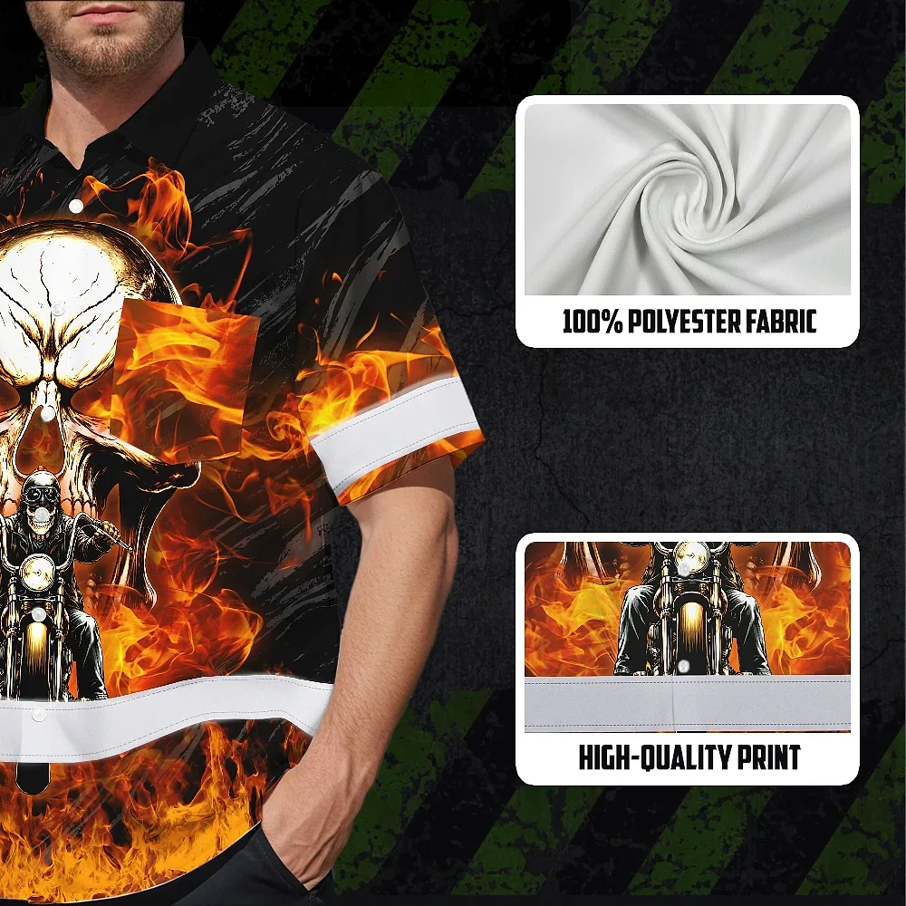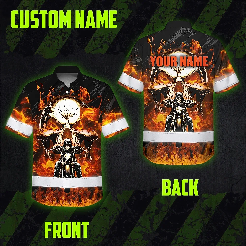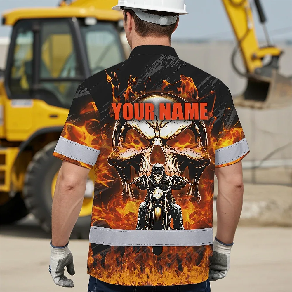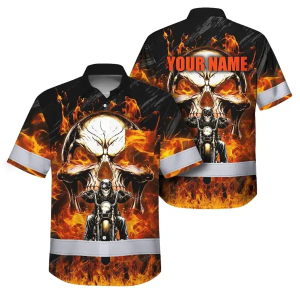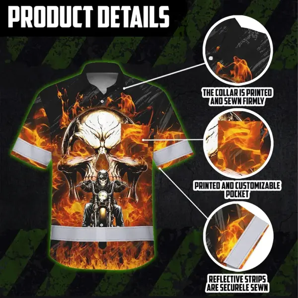 Hi Vis Hawaiian Shirt Reflective Tapes Orange Neon Fire Biker Skull Custom Name Safety Workwear For Workers, Truckers, Operators