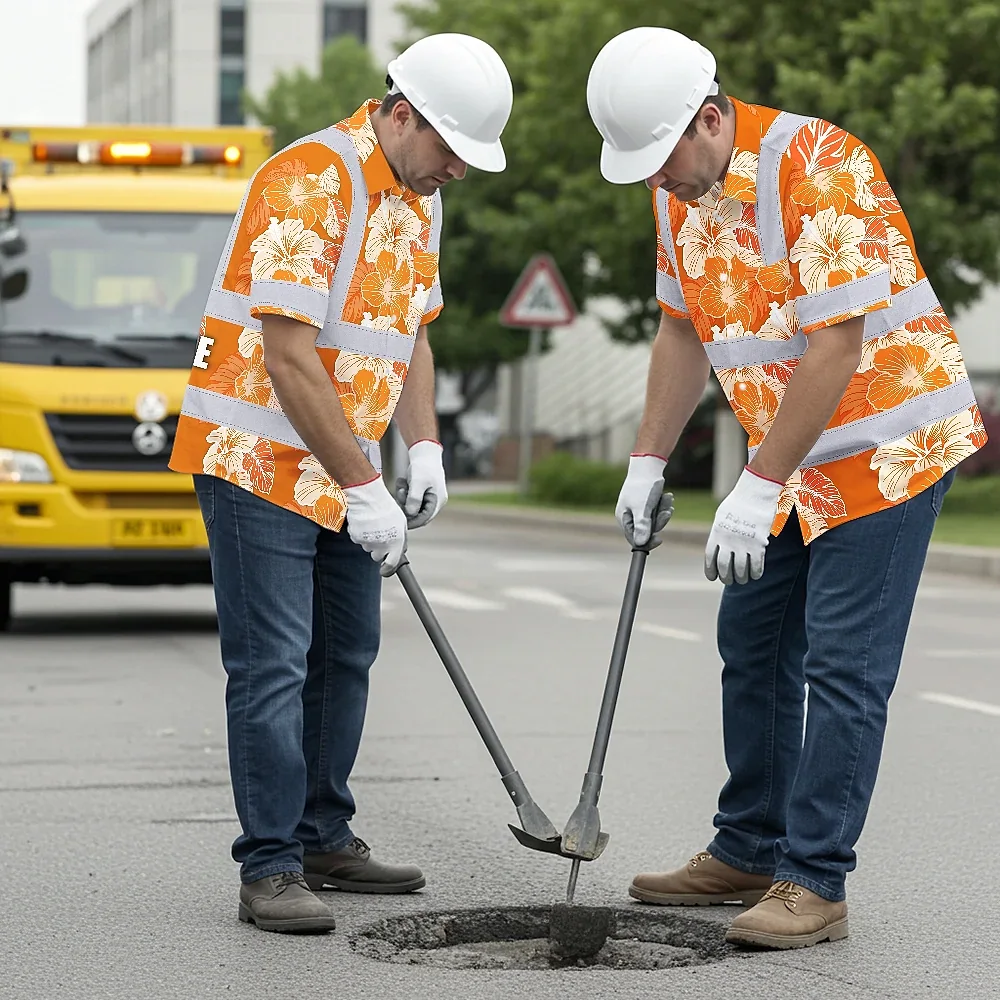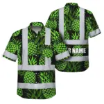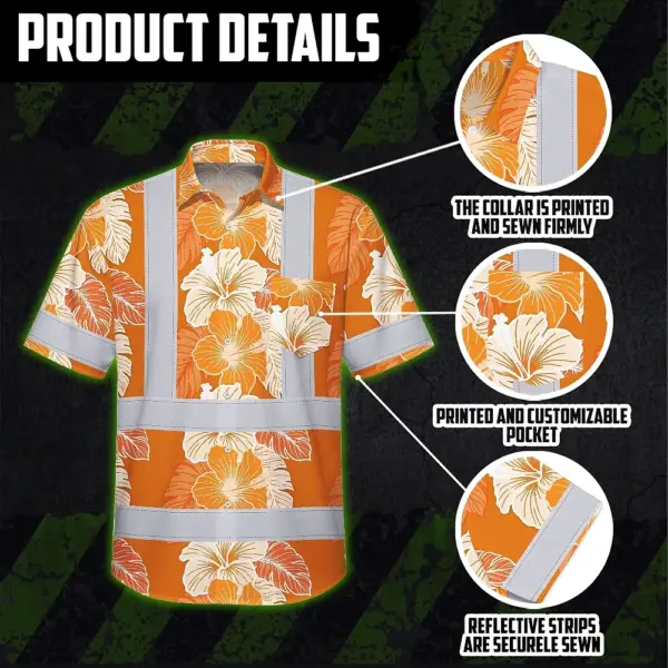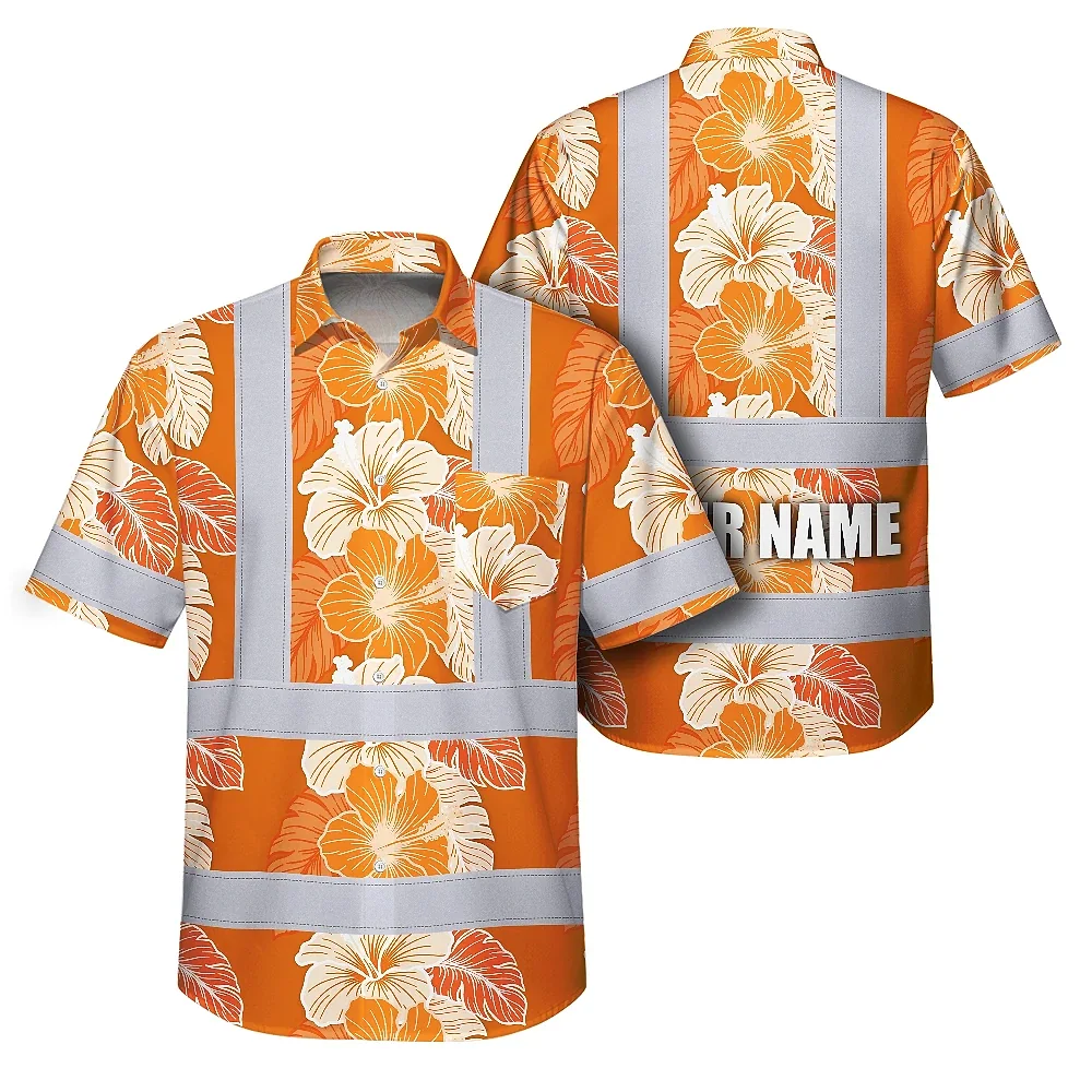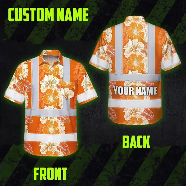 Hi Vis Hawaiian Shirt Reflective Tapes Orange Neon Hibiscus Custom Name Safety Workwear For Workers, Truckers, Operators