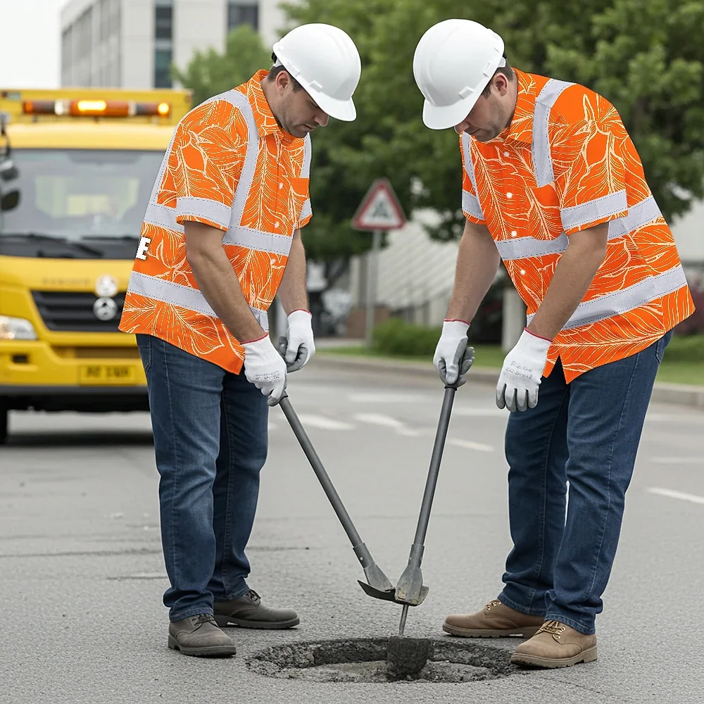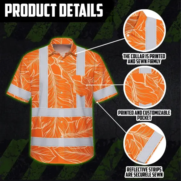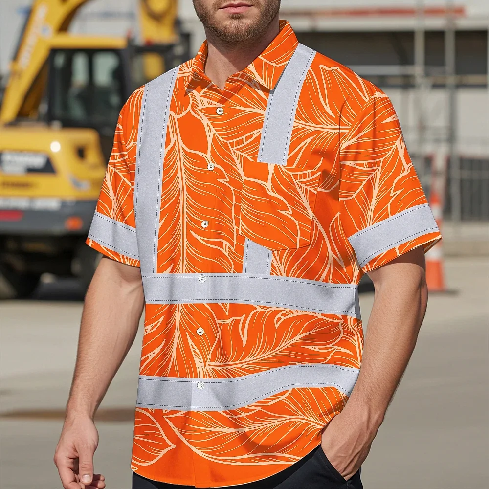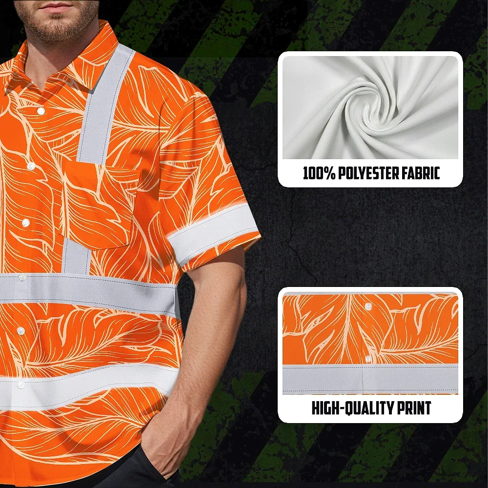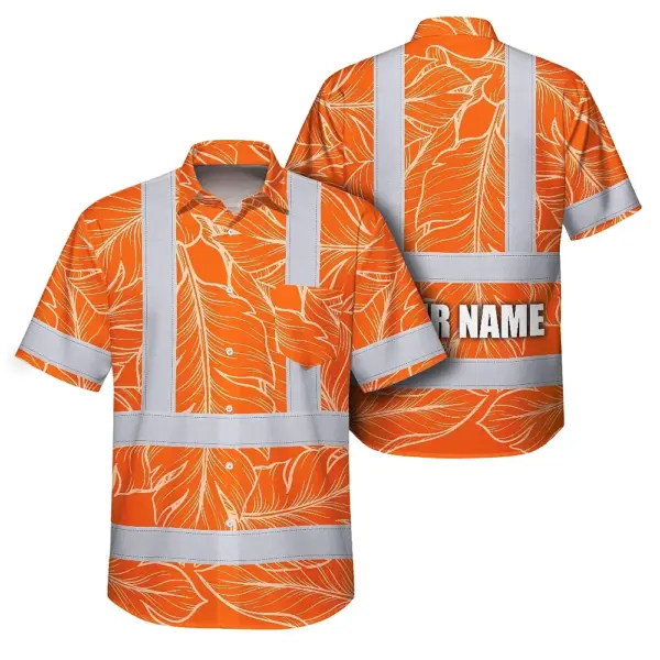 Hi Vis Hawaiian Shirt Reflective Tapes Orange Neon Leaf Custom Name Safety Workwear For Workers, Truckers, Operators
