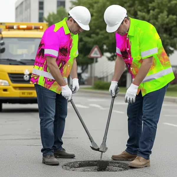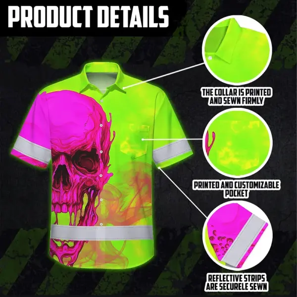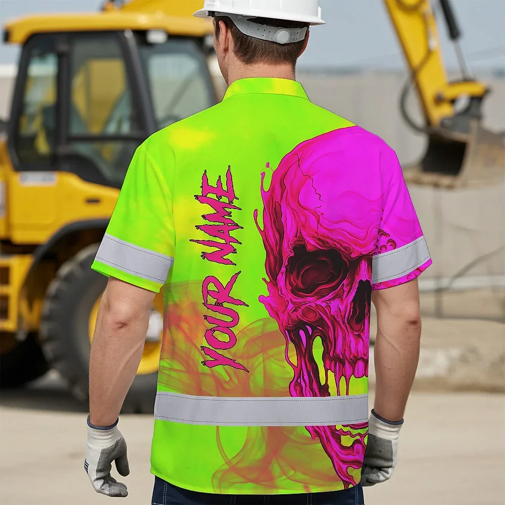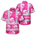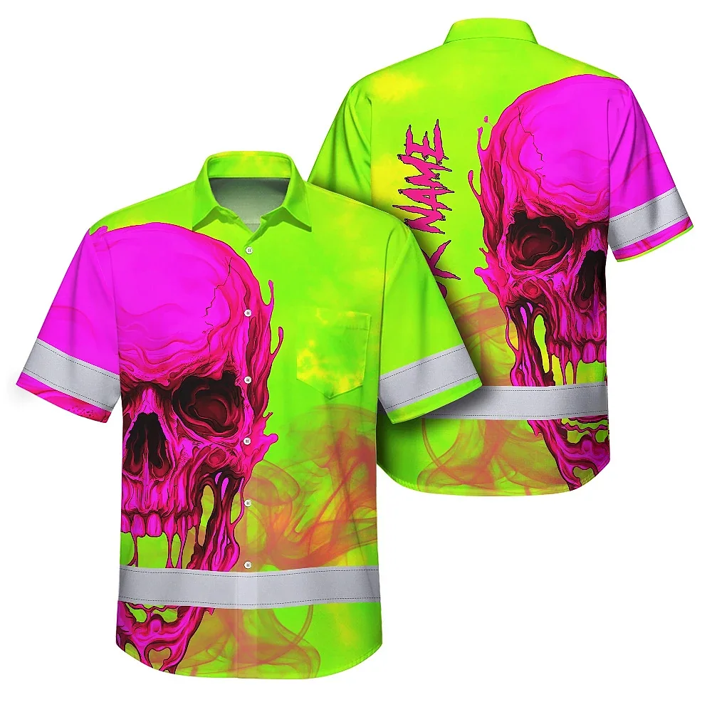 Hi Vis Hawaiian Shirt Reflective Tapes Pink And Lime Neon Skull Custom Name Safety Workwear For Workers, Truckers, Operators