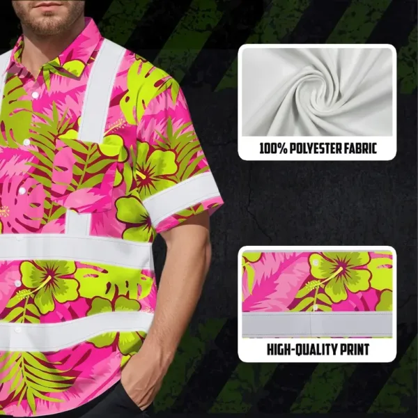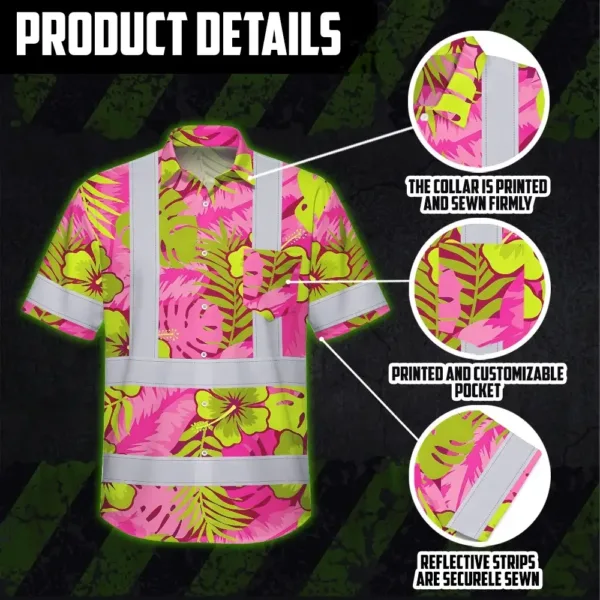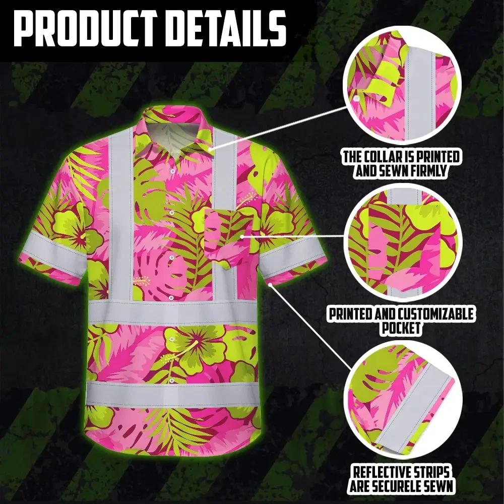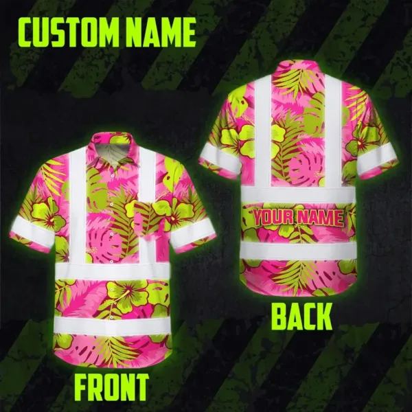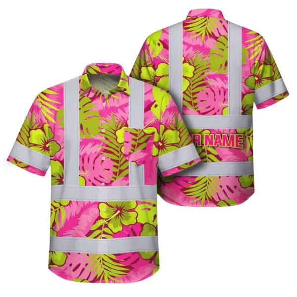 Hi Vis Hawaiian Shirt Reflective Tapes Pink Neon And Lime Flowers Custom Name Safety Workwear For Workers, Truckers, Operators