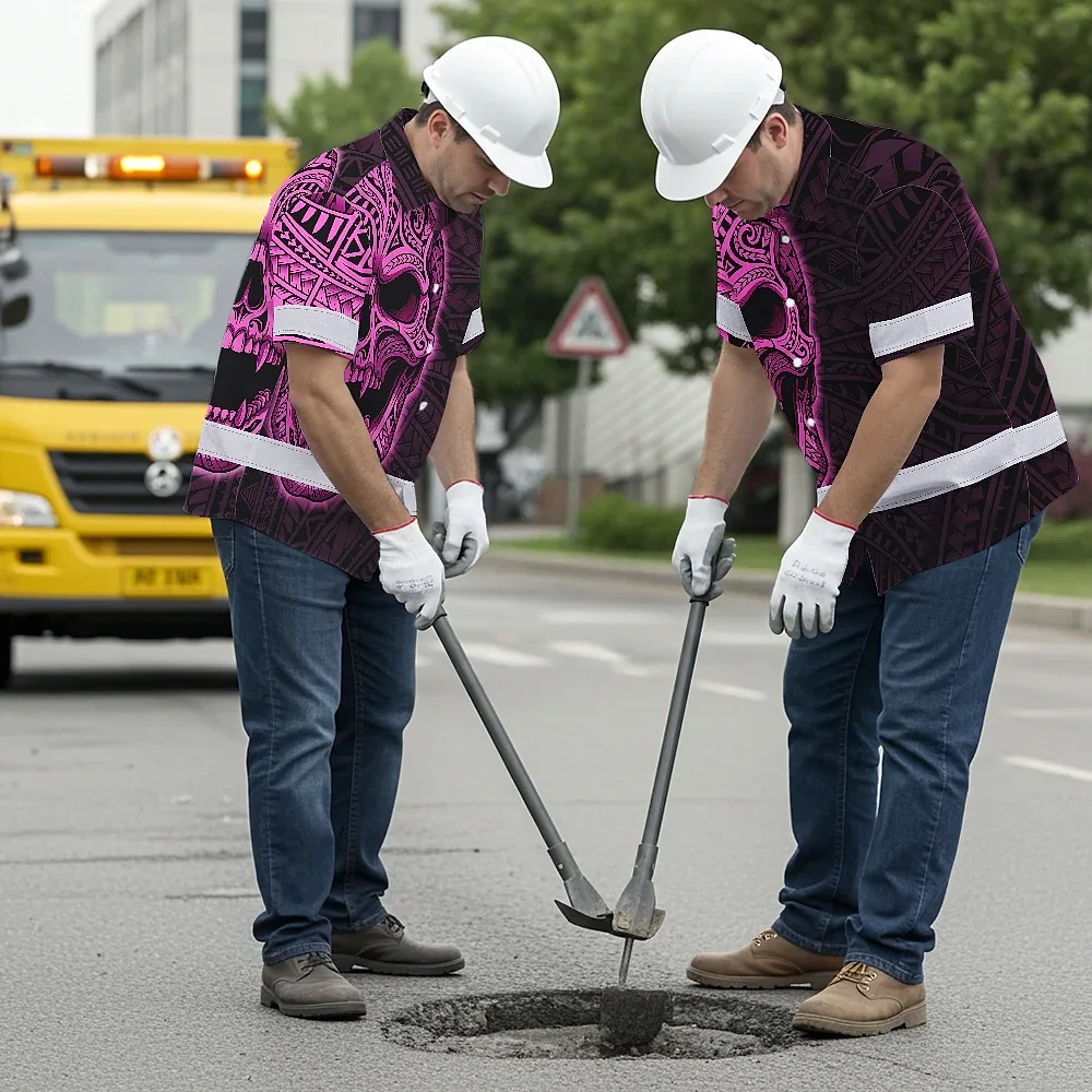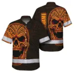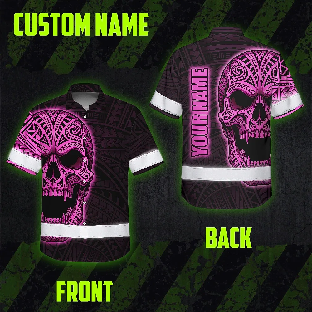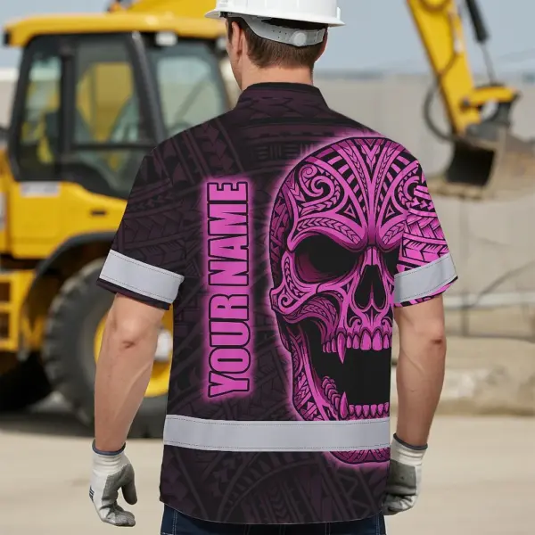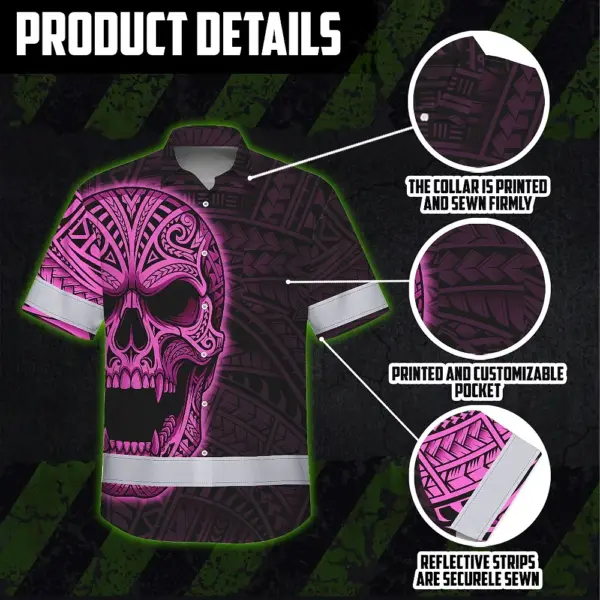 Hi Vis Hawaiian Shirt Reflective Tapes Pink Neon Polynesian Half Skull Custom Name Safety Workwear For Workers, Truckers, Operators