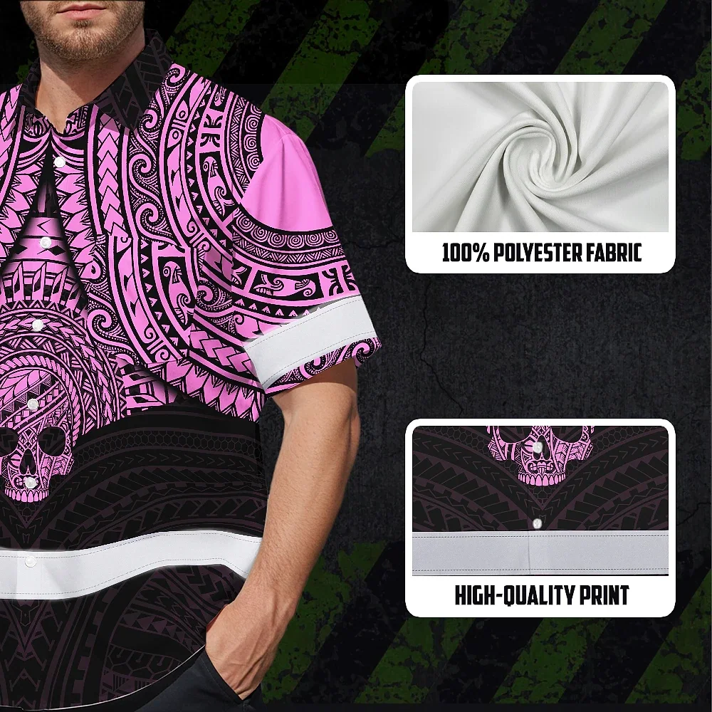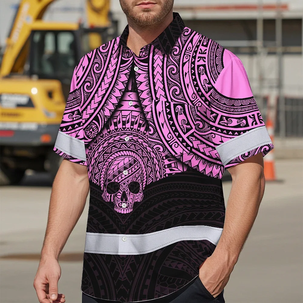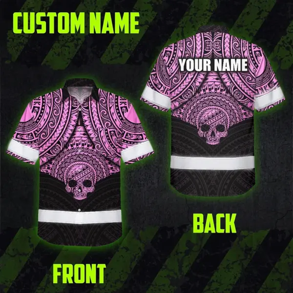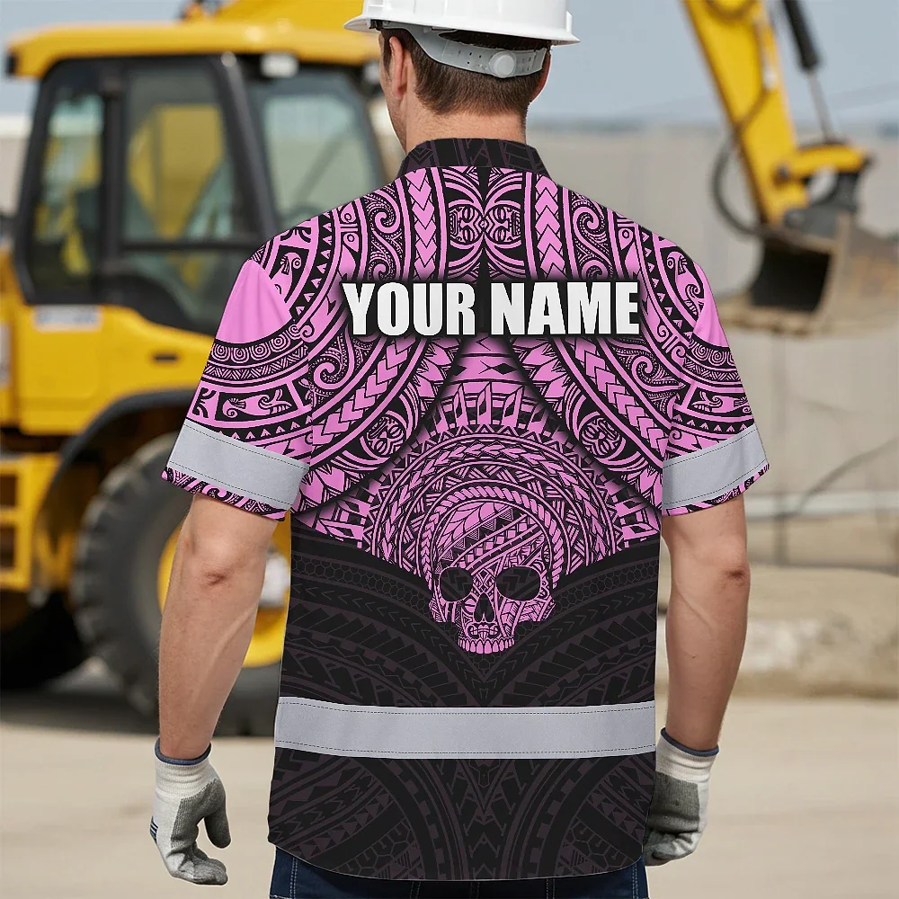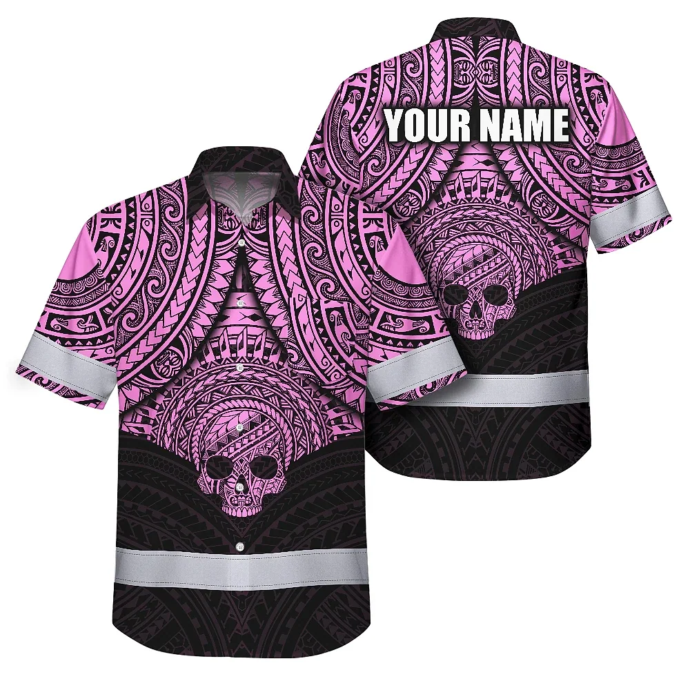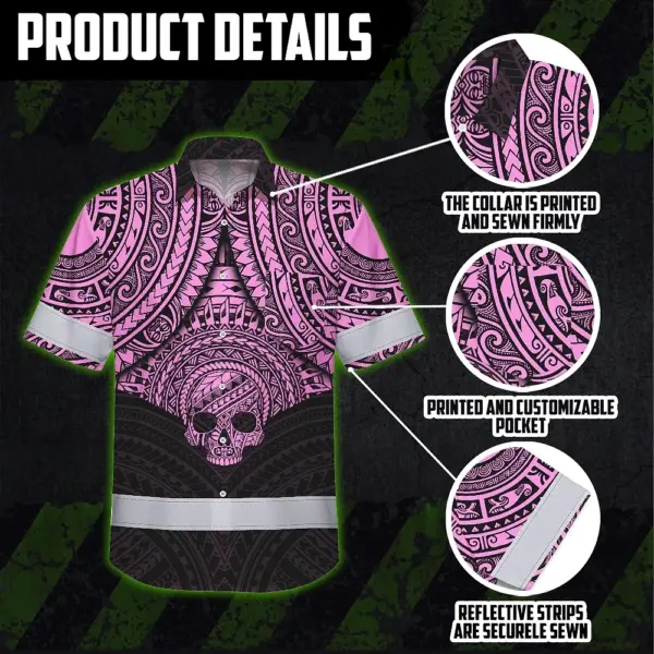 Hi Vis Hawaiian Shirt Reflective Tapes Pink Neon Polynesian Skull Custom Name Safety Workwear For Workers, Truckers, Operators