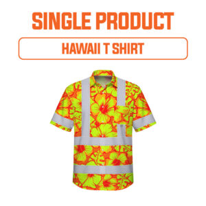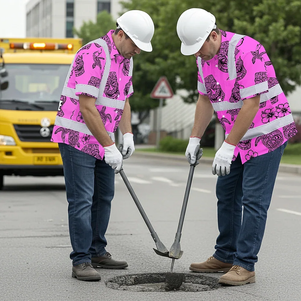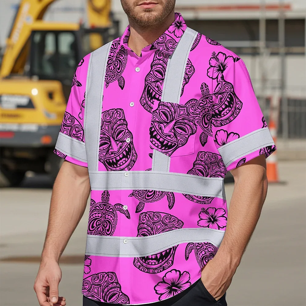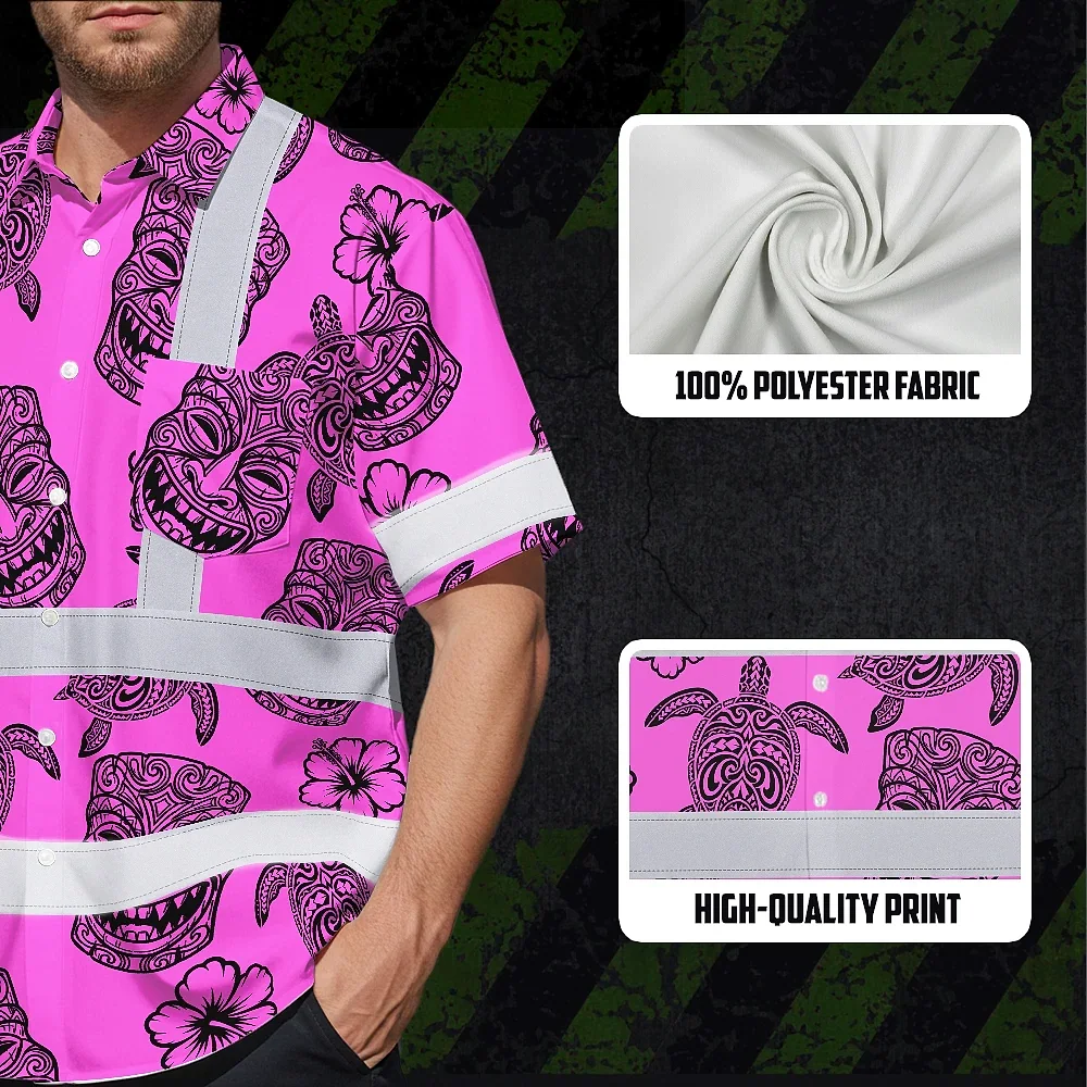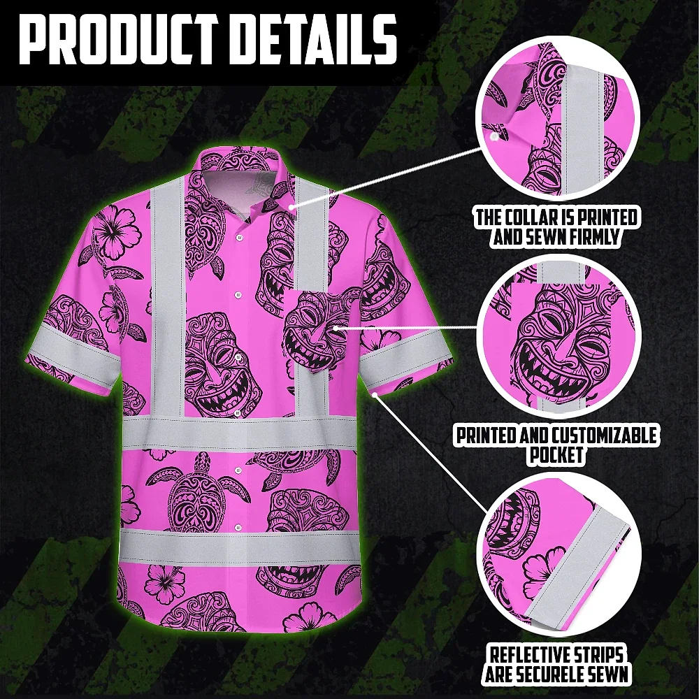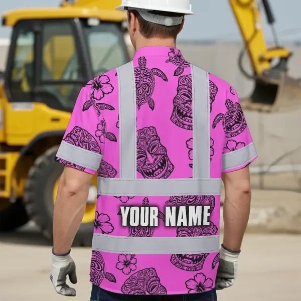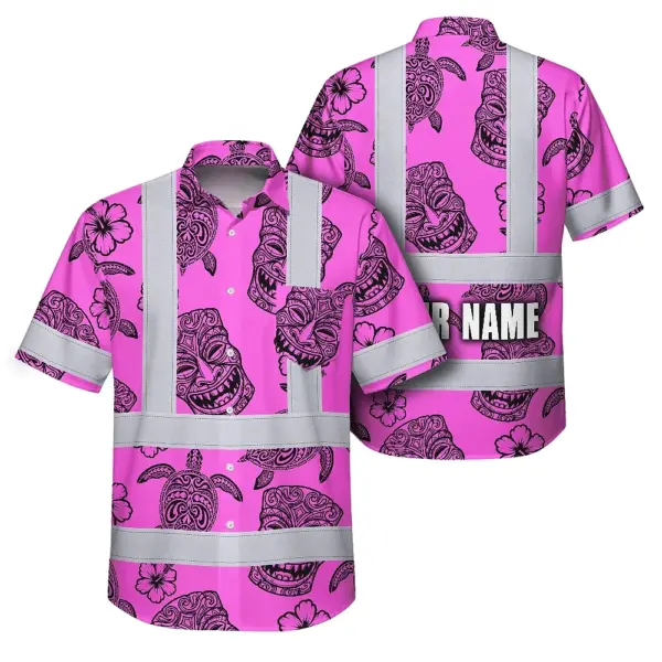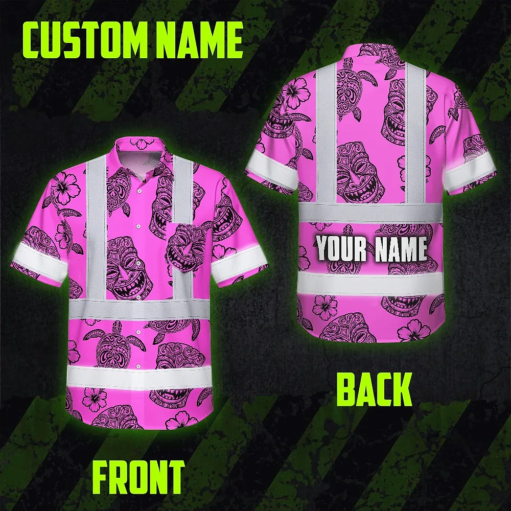 Hi Vis Hawaiian Shirt Reflective Tapes Pink Neon Tiki Custom Name Safety Workwear For Workers, Truckers, Operators